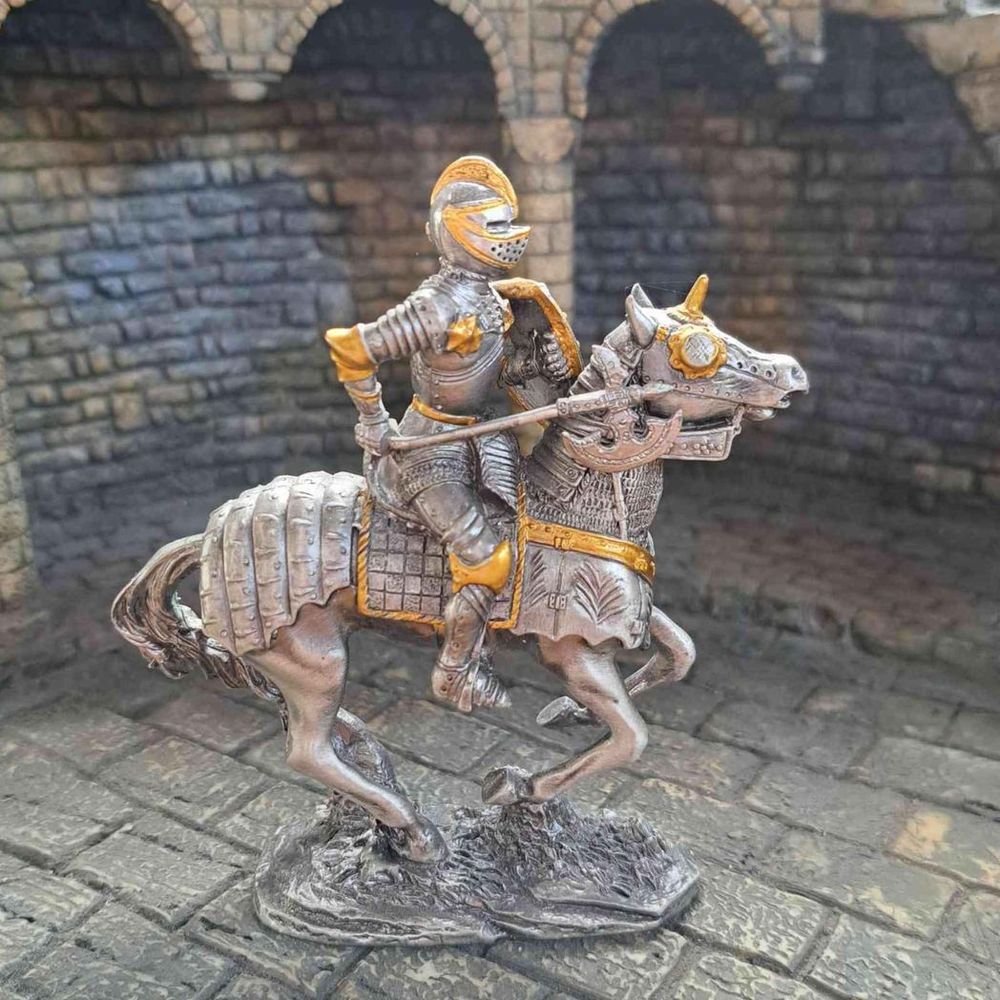 The solid metal statue is of a knight riding a horse, wearing 16th-century armour and carrying a shield and axe. This is an intricately scaled sculpture with lifelike features and highlighted details hand-painted in a gold colour.