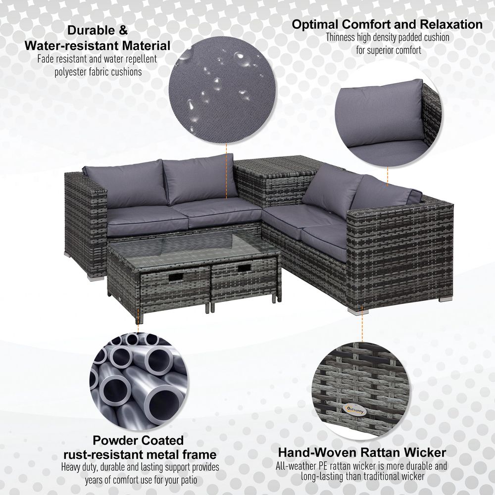 4pcs Rattan Sofa Storage & Table & 2 Drawers Cushions Corner Trunk Coffee Grey