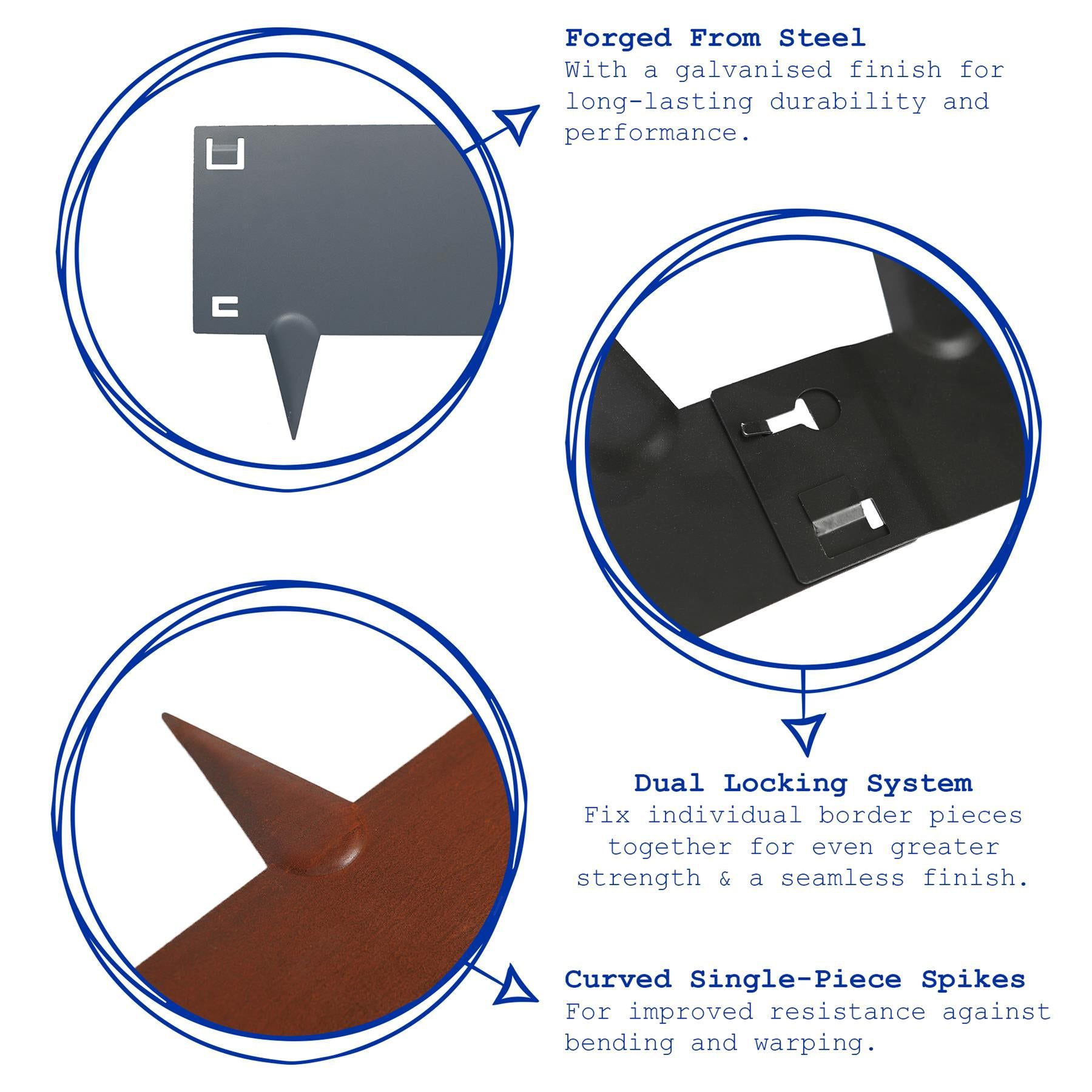 Each border piece features a series of 8cm spikes, moulded from the same single piece of metal and curved to provide maximum strength and stability once tapped into the soil.