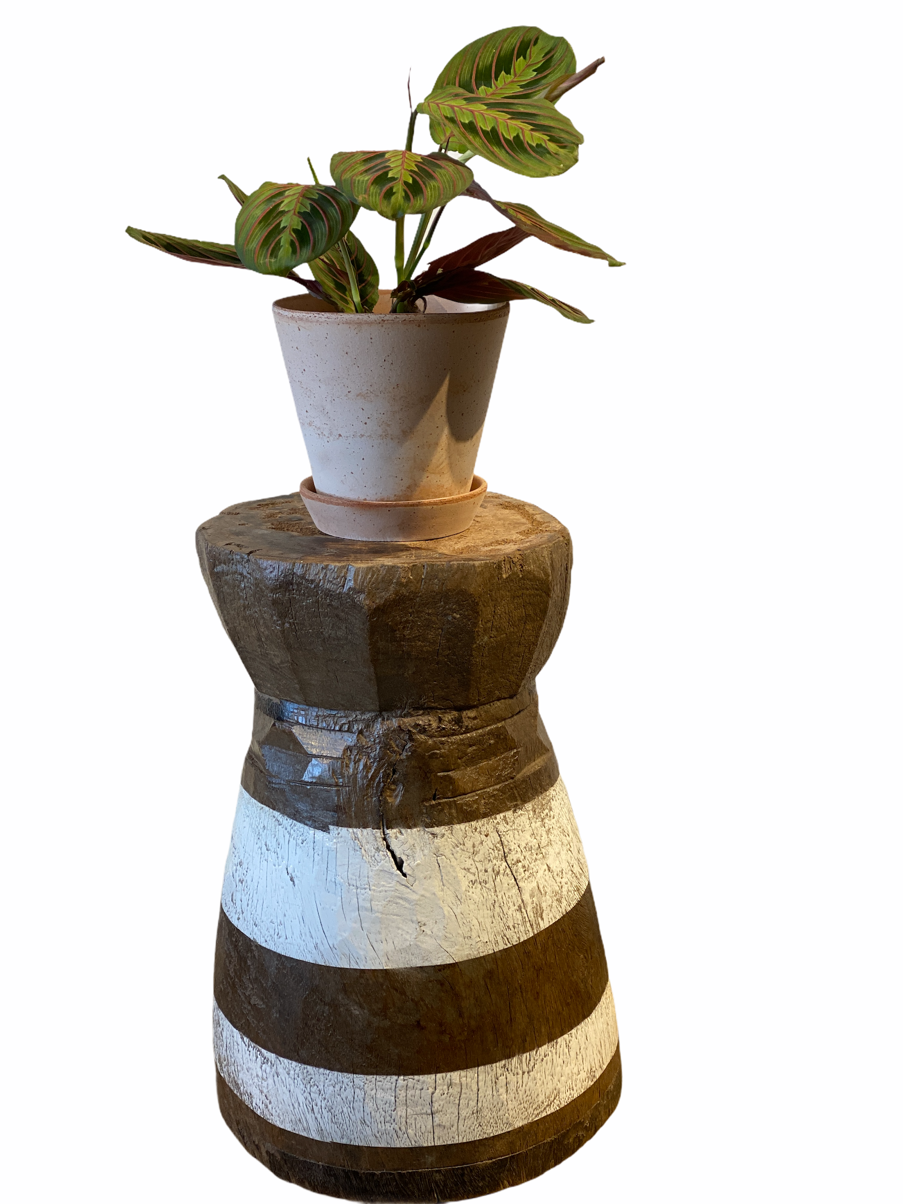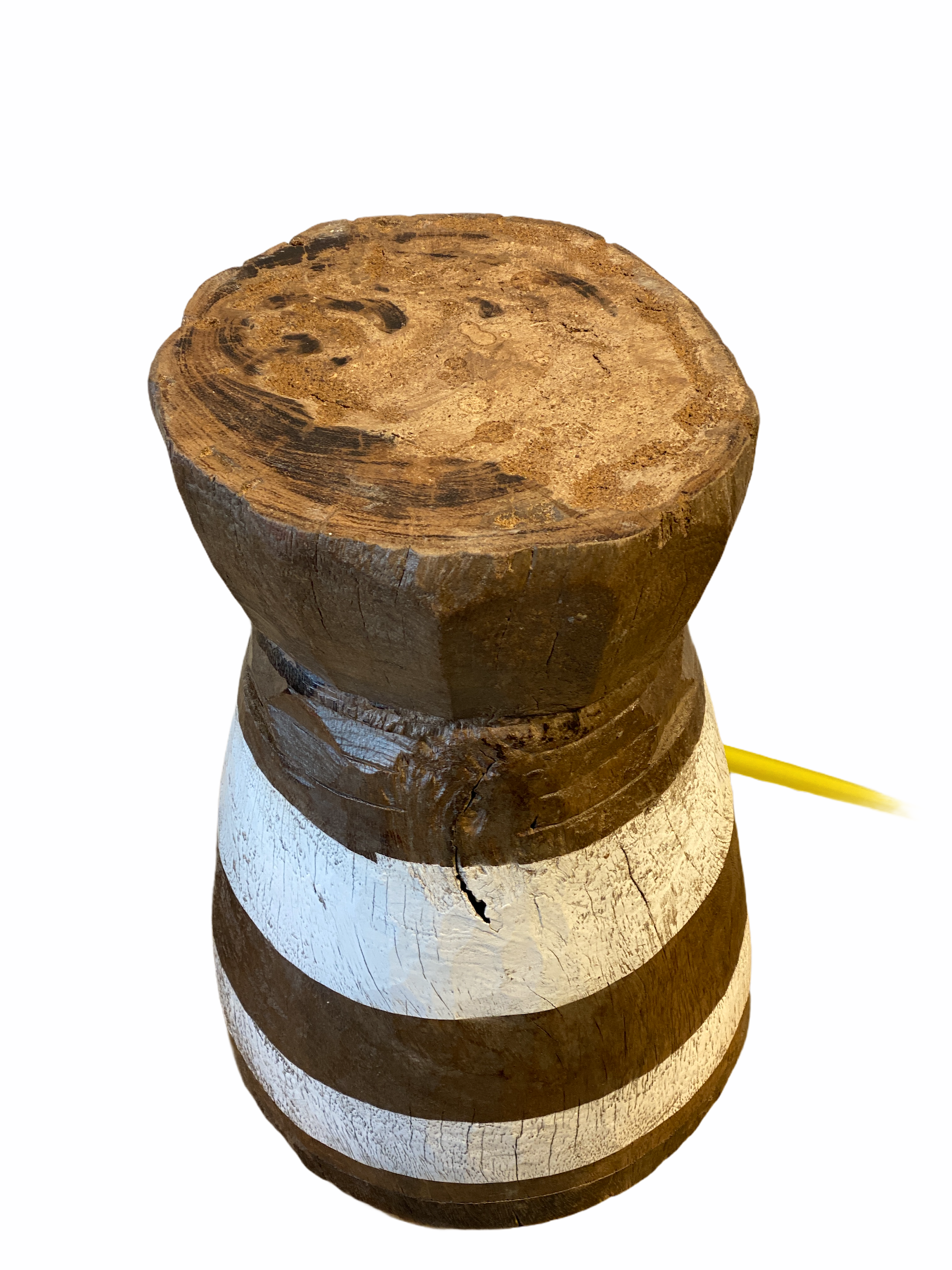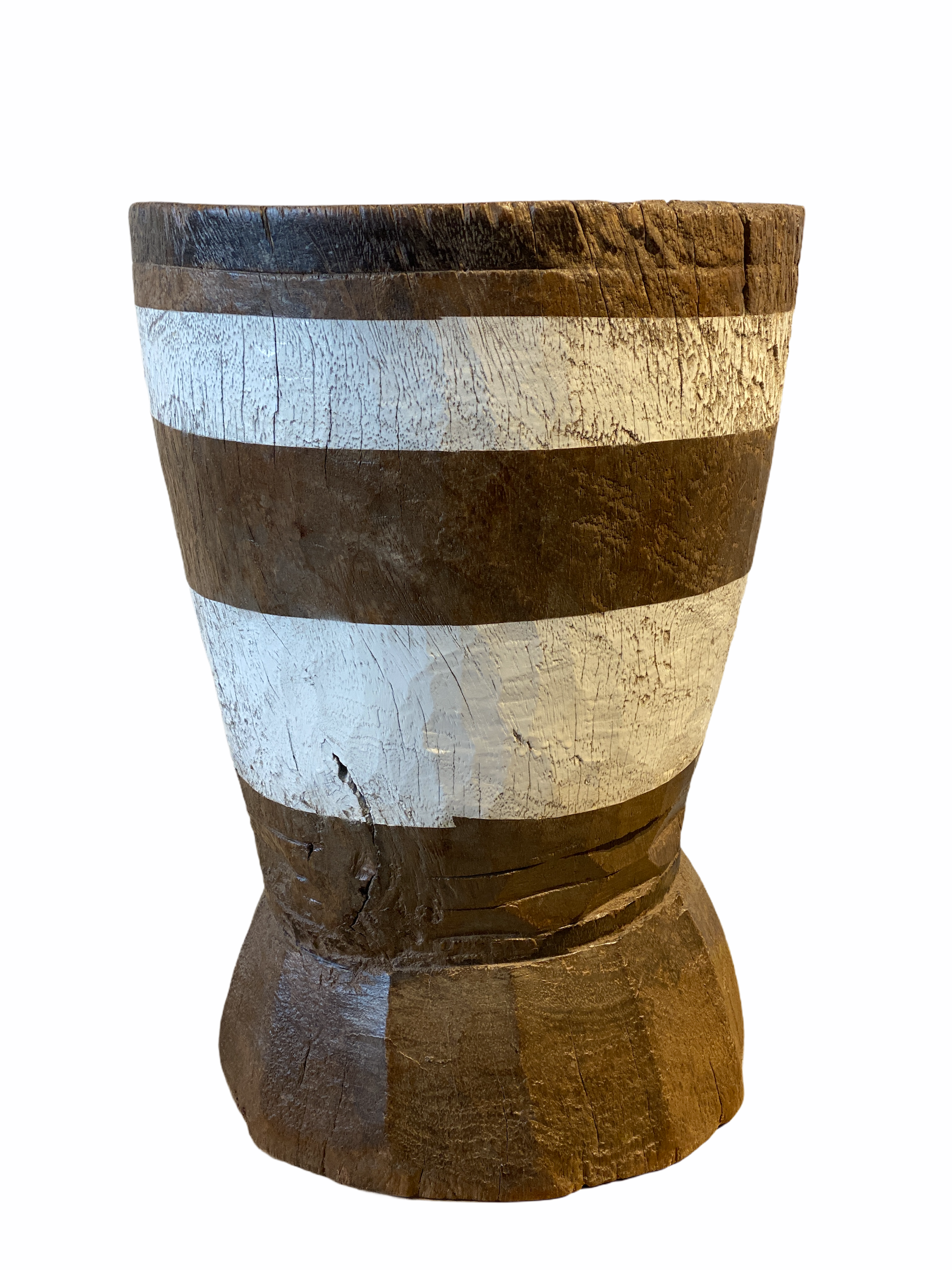 This model has one large opening at the top and the base is solid perfect for use as a small stool or side table. Painted white stripes and naturally textured surface from the tree trunk it came from.