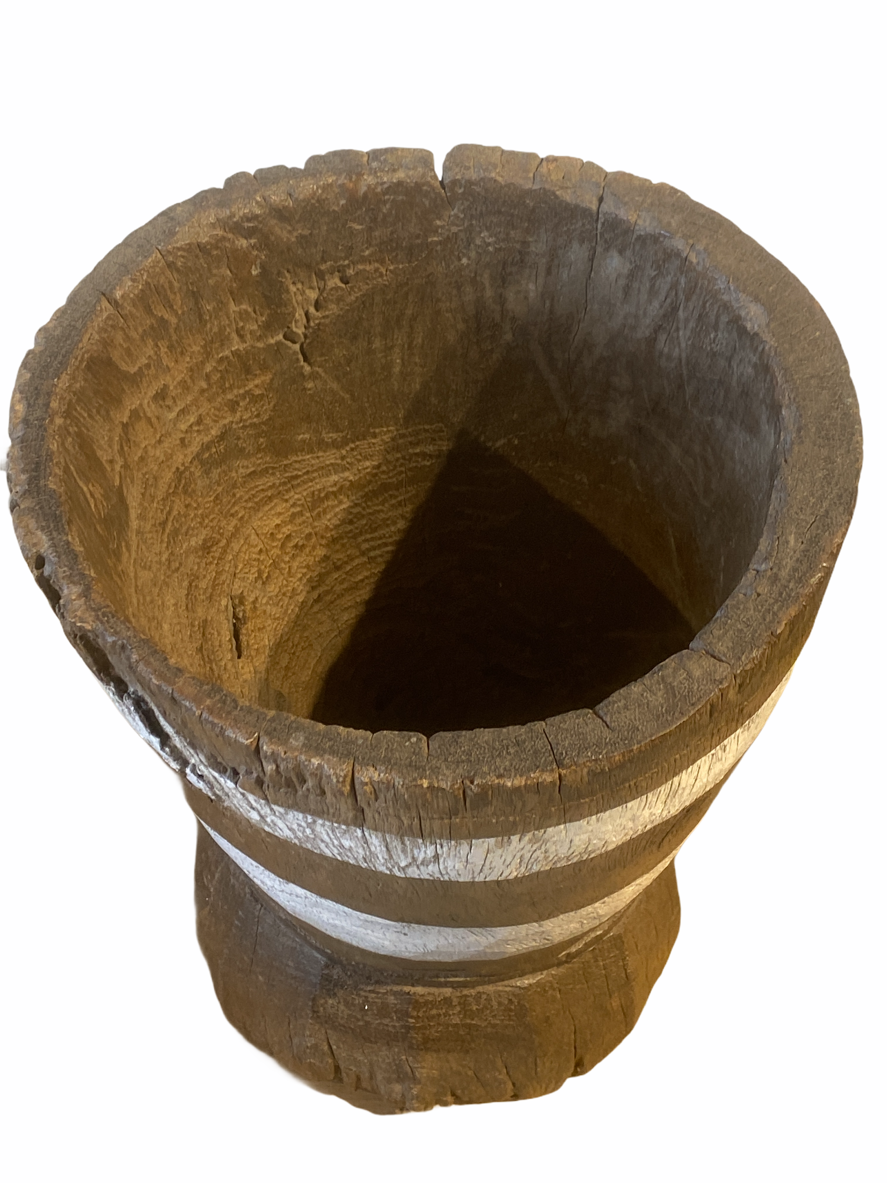 African grain stompers are made when they hollow out tree trucks and large branches to create these which are then used to grind grain. They can be used as planters or turn them upside down to be used as stools.