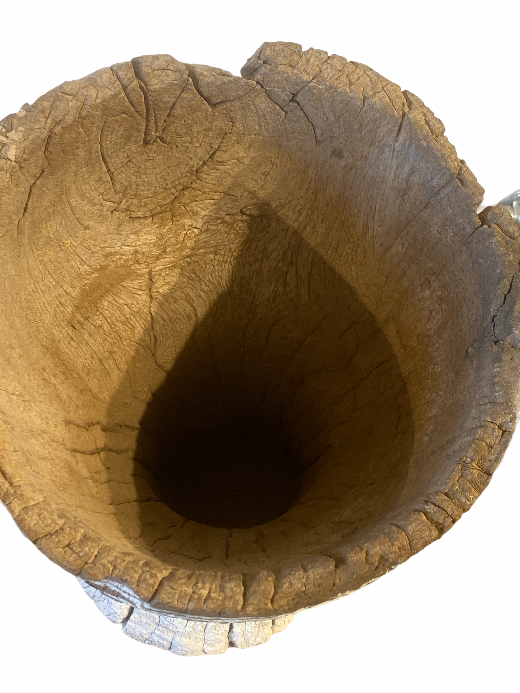 African grain stompers are made when they hollow out tree trucks and large branches to create these which are then used to grind grain. They can be used as planters or turn them upside down to be used as stools.