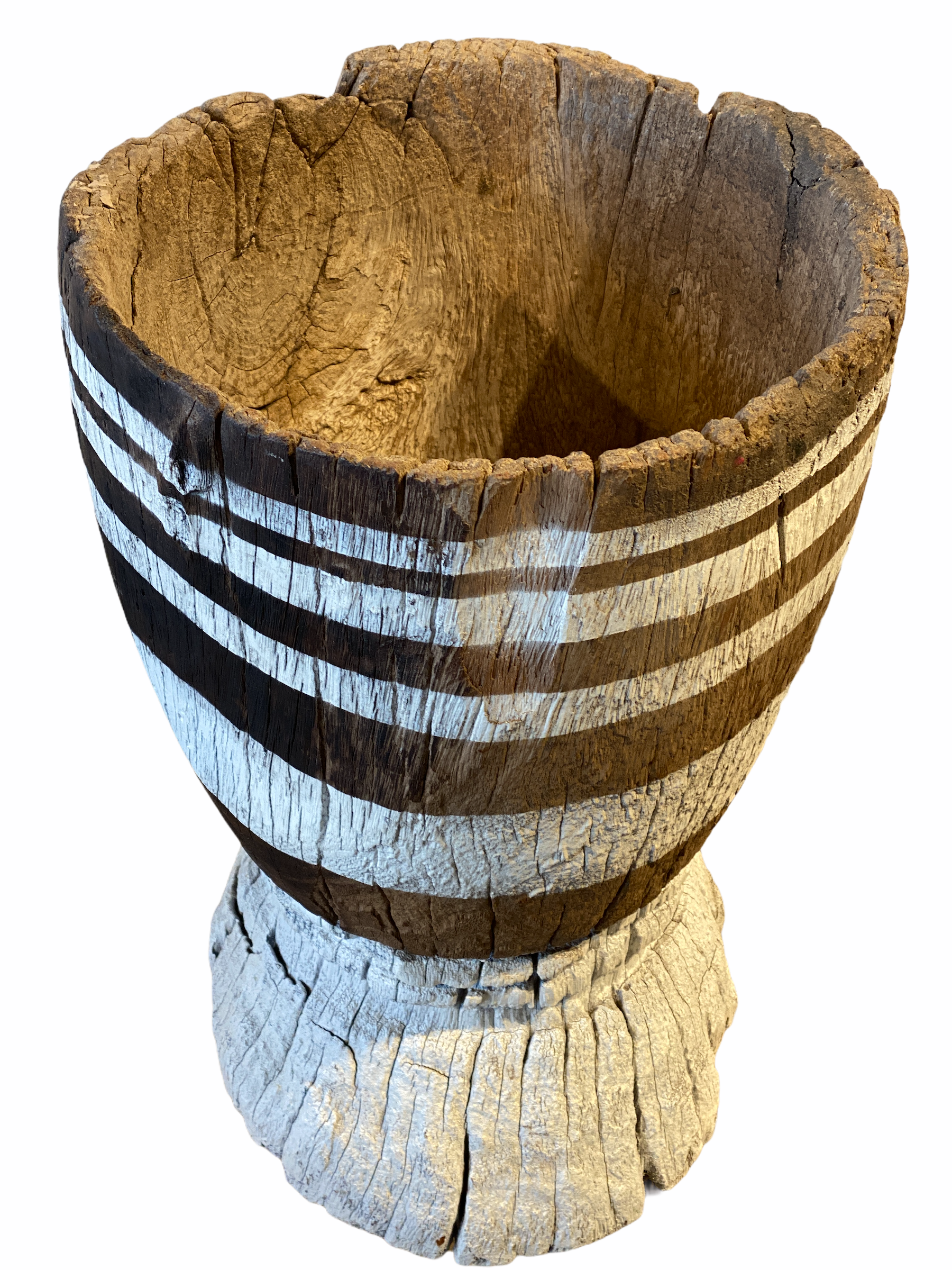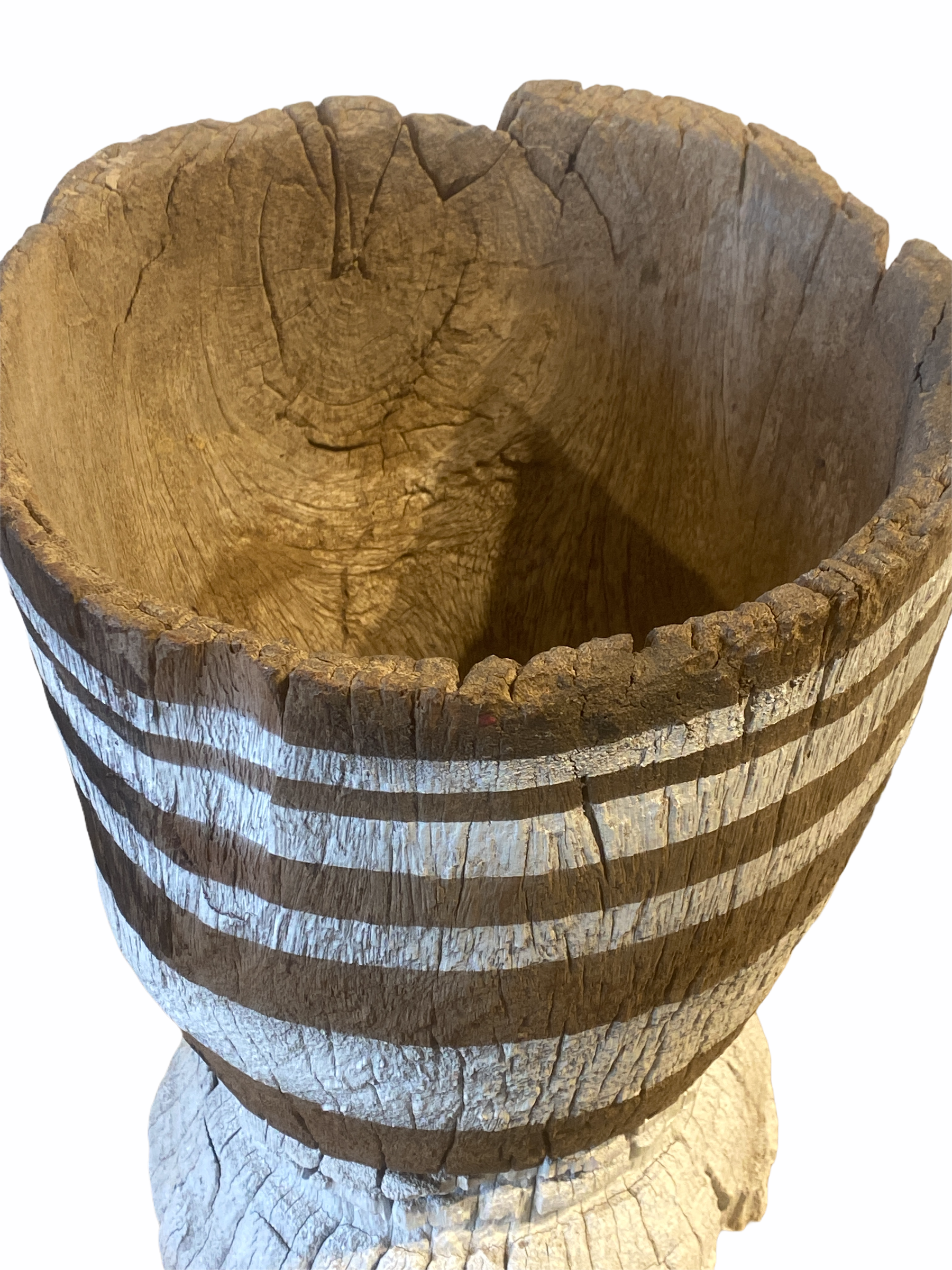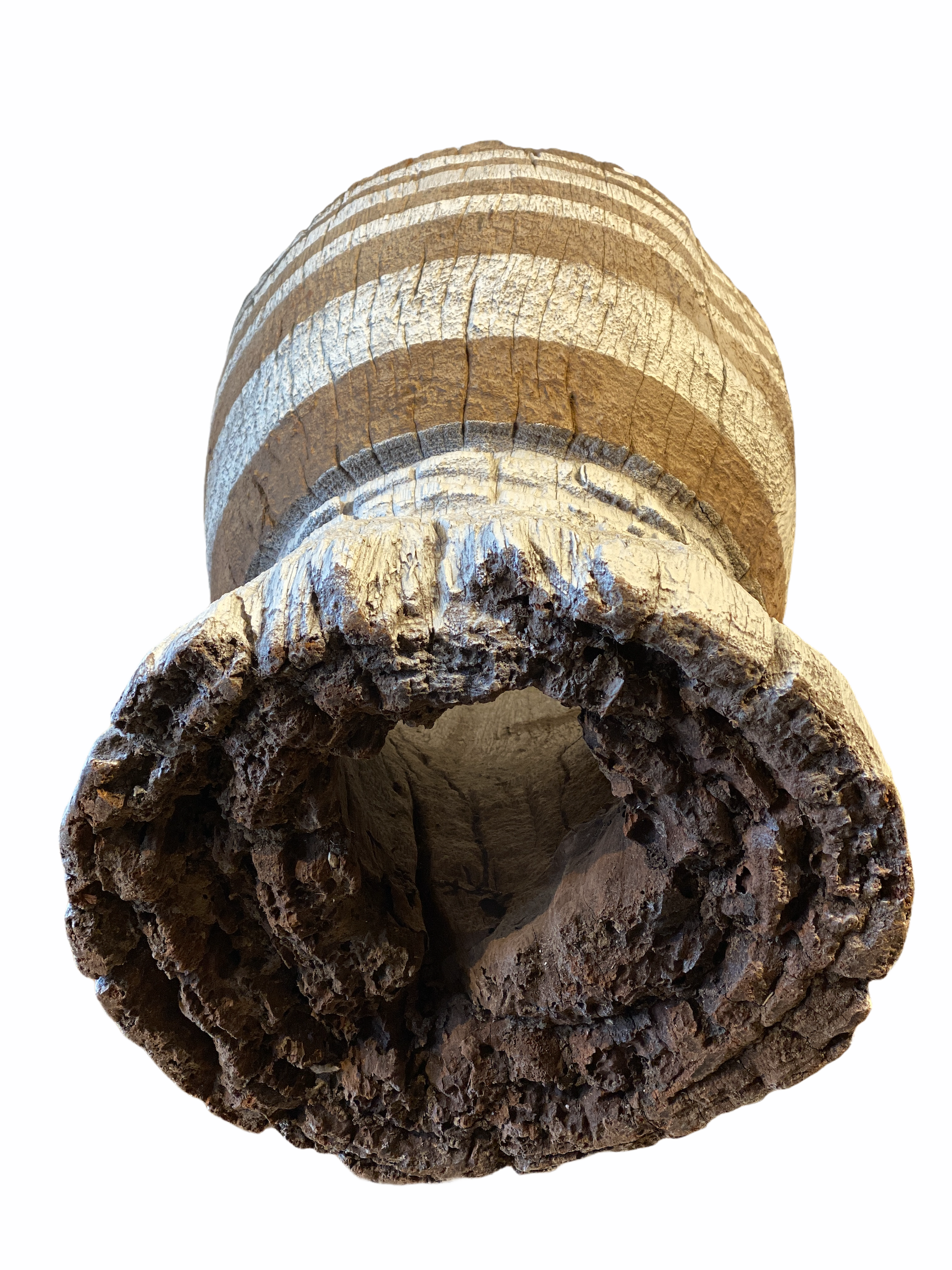 This model has one large opening at the top and a smaller hole at the base. Painted white stripes and naturally textured surface from the tree trunk it came from.