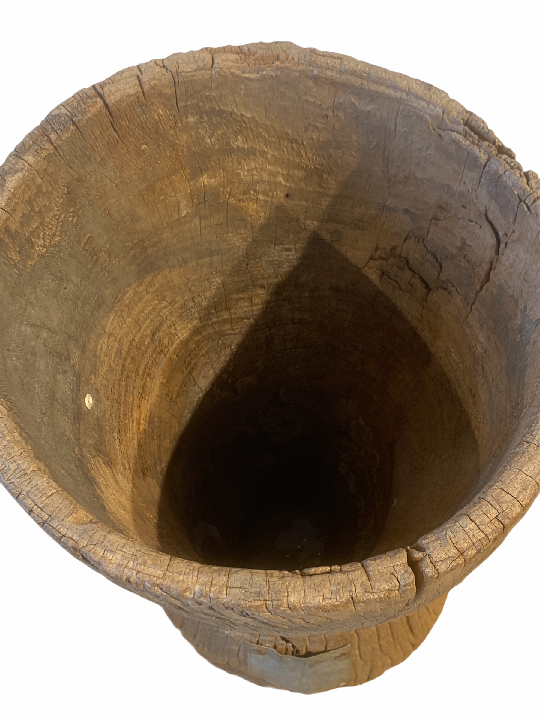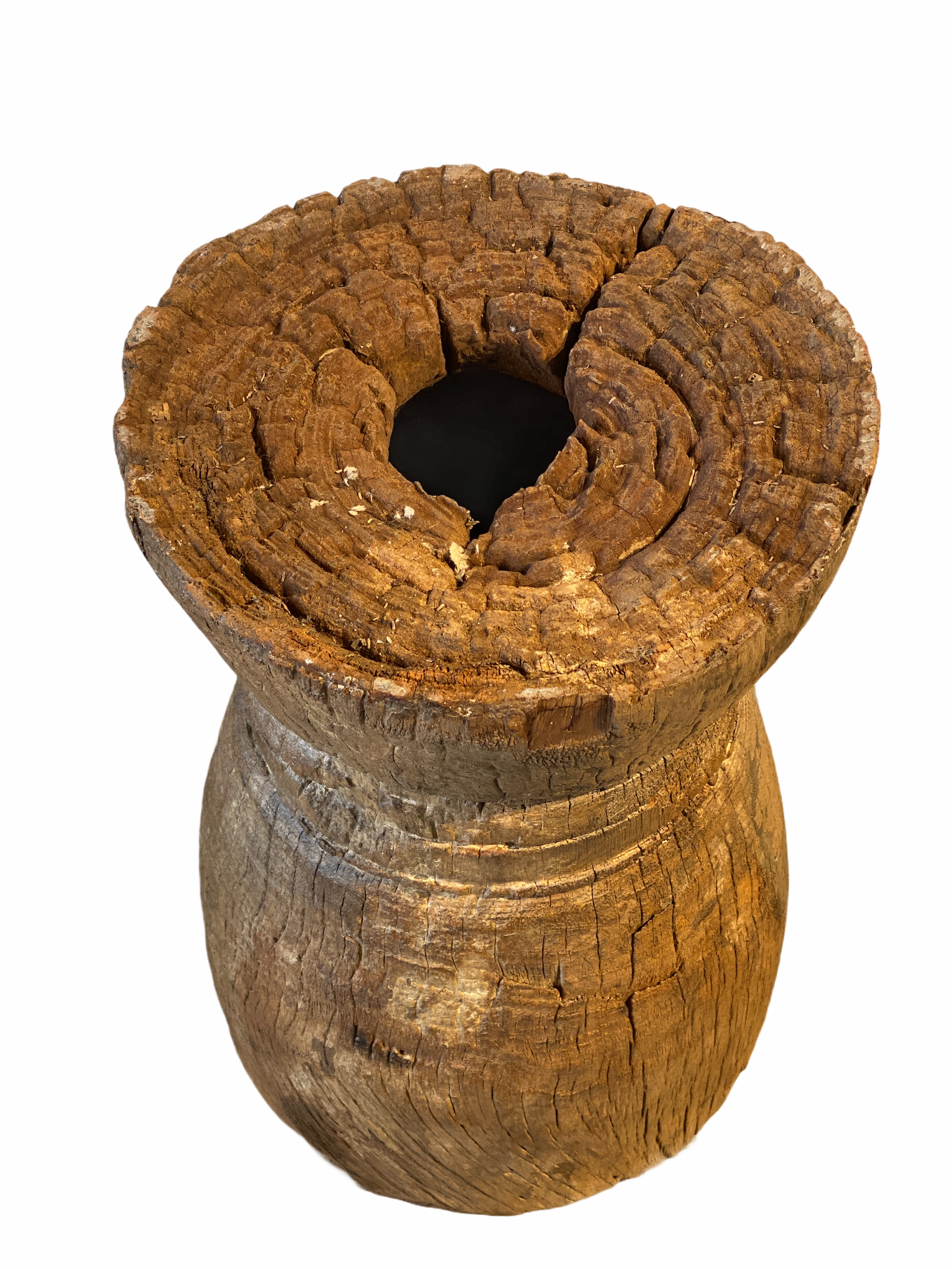African grain stompers are made when they hollow out tree trucks and large branches to create these which are then used to grind grain. They can be used as planters or turn them upside down to be used as stools.