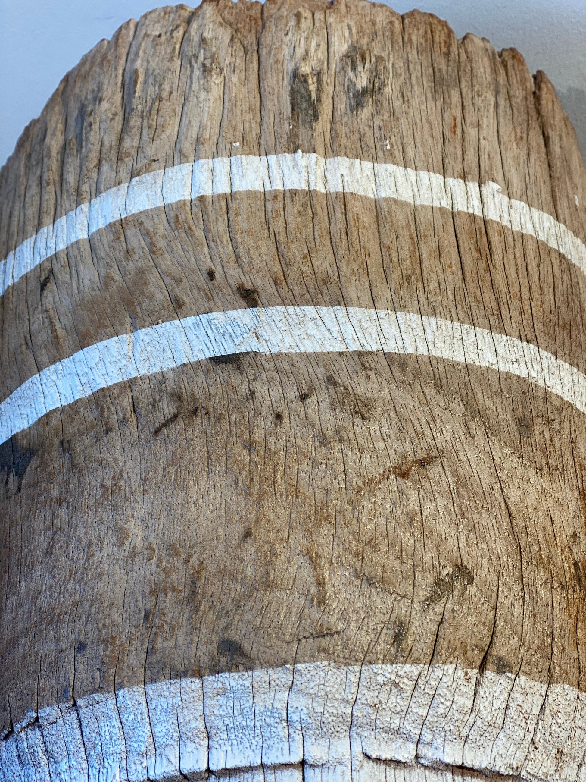 This model has one large opening at the top and a smaller hole at the base. Painted white stripes and naturally textured surface from the tree trunk it came from.