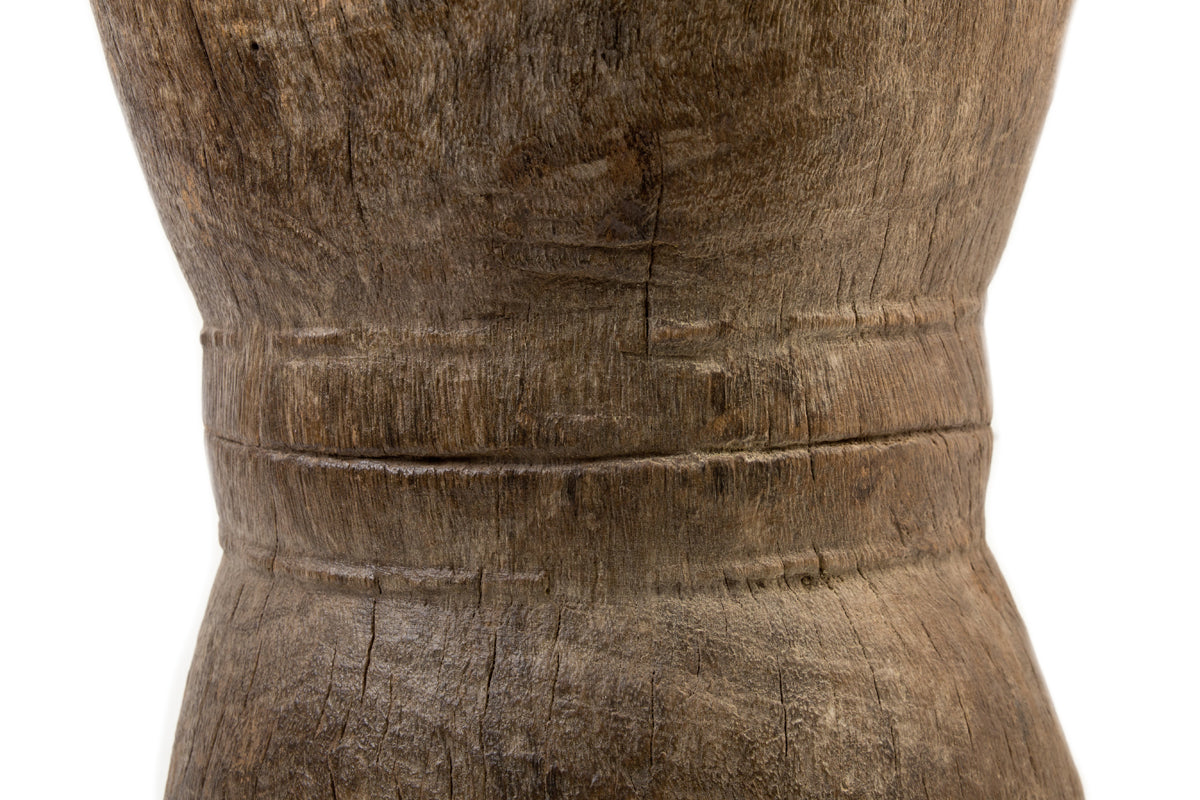 African grain stompers are hand-made when tree trunks are hollowed out and then used to grind grain. These have been recycled from their original purpose into side tables by adding copper tops.