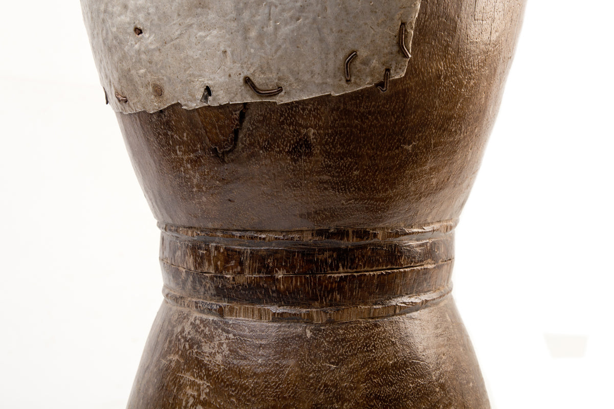 African grain stompers are hand-made when tree trunks are hollowed out and then used to grind grain. These have been recycled from their original purpose into side tables by adding copper tops.