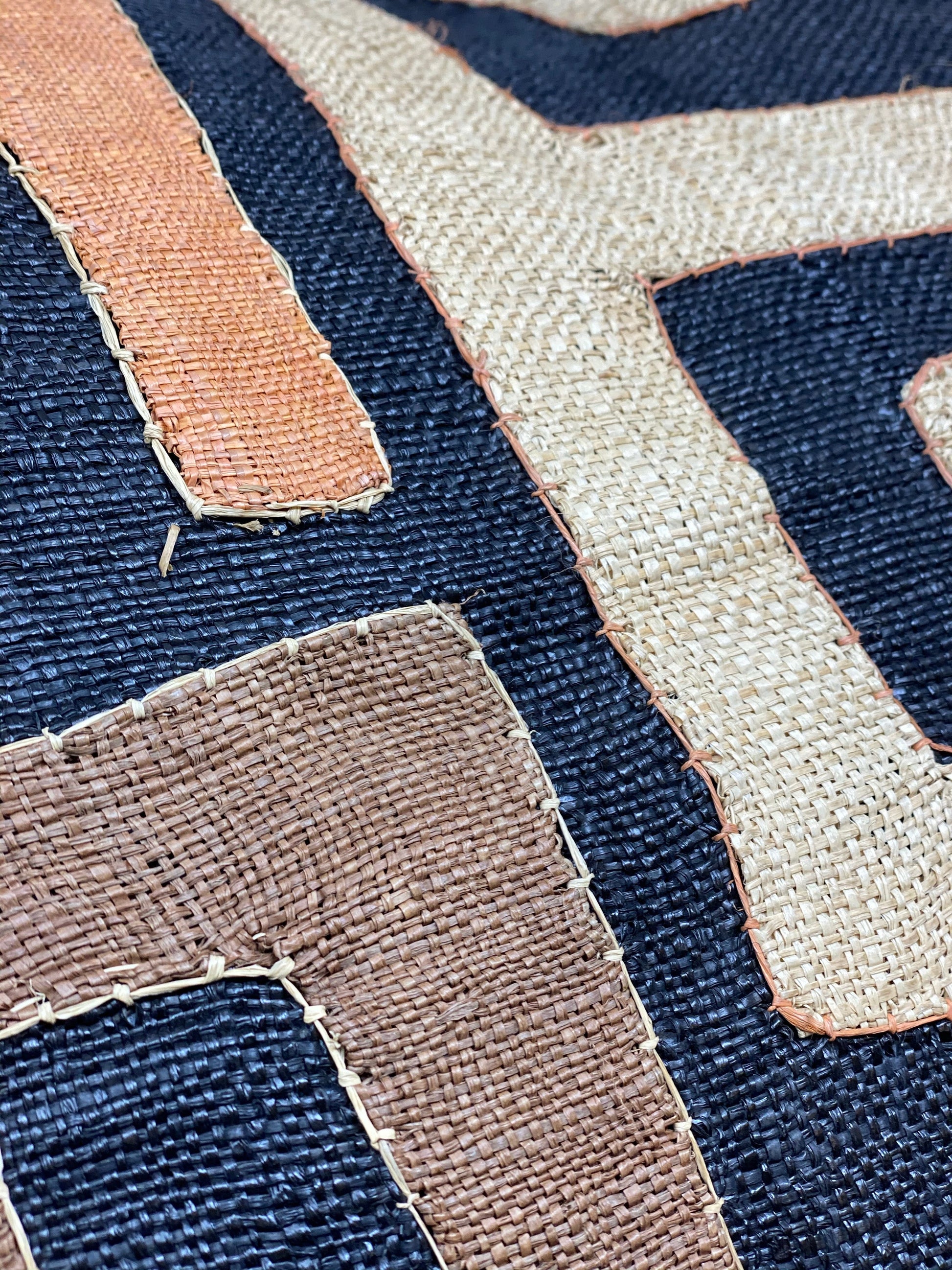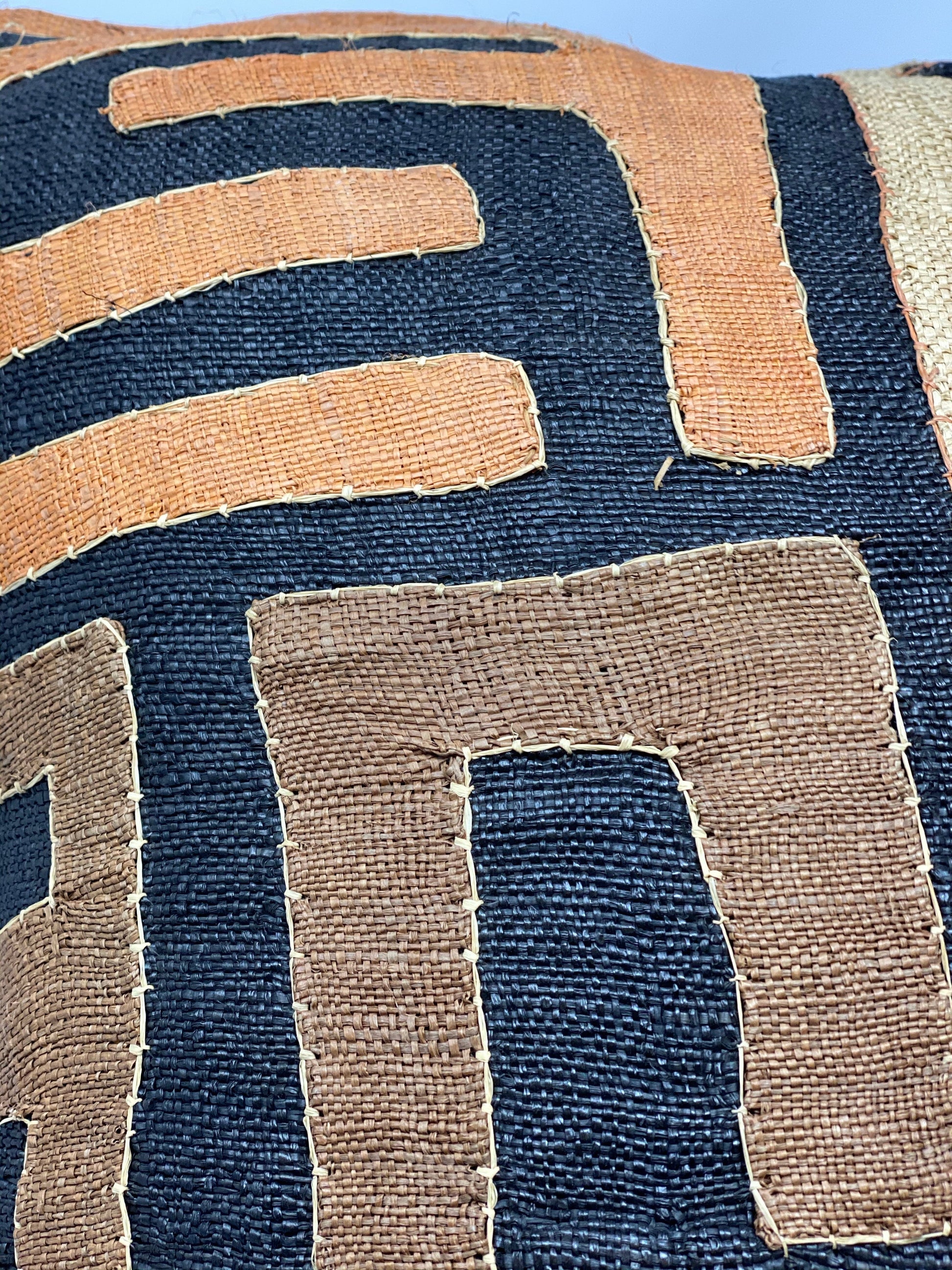 A stunning hand stitched textured cushion made from the fiber of the Raffia Vinifera Palm in the Democratic Republic of Congo. Production of these textiles is a multistage process which involves the participation of both women and men. The process includes gathering and preparing the raffia fibers for weaving and embroidery, weaving the basic oth unit, dying the embroidery fibers, and embellishing the woven cloth with embroidery, applique, patchwork and dye. Embroided cloth works are individually conceptualised and the patterns hVe been named and passed on through generations.