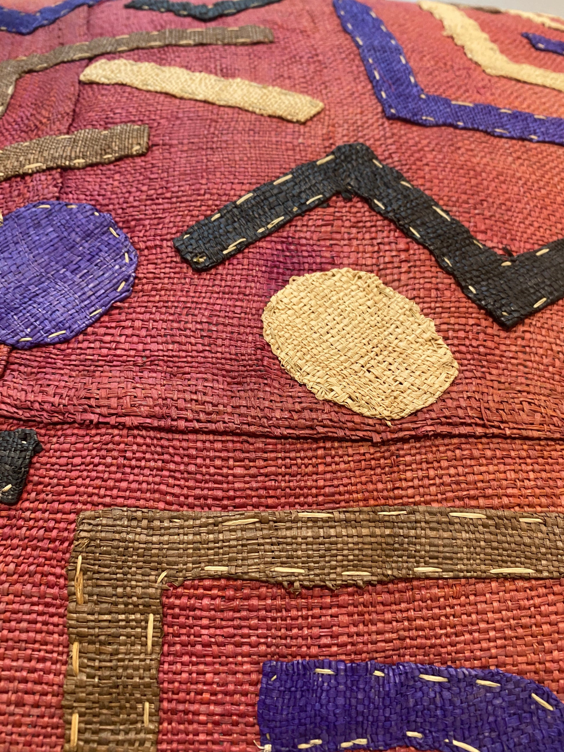 A stunning hand stitched textured cushion made from the fiber of the Raffia Vinifera Palm in the Democratic Republic of Congo. Production of these textiles is a multistage process which involves the participation of many people, both women and men. The process includes gathering and preparing the raffia fibers for weaving and embroidery, weaving the basic oth unit, dying the embroidery fibers, and embellishing the woven cloth with embroidery, applique, patchwork and dye. Embroided cloth works are individually conceptualised and the patterns have been named and passed on through generations.