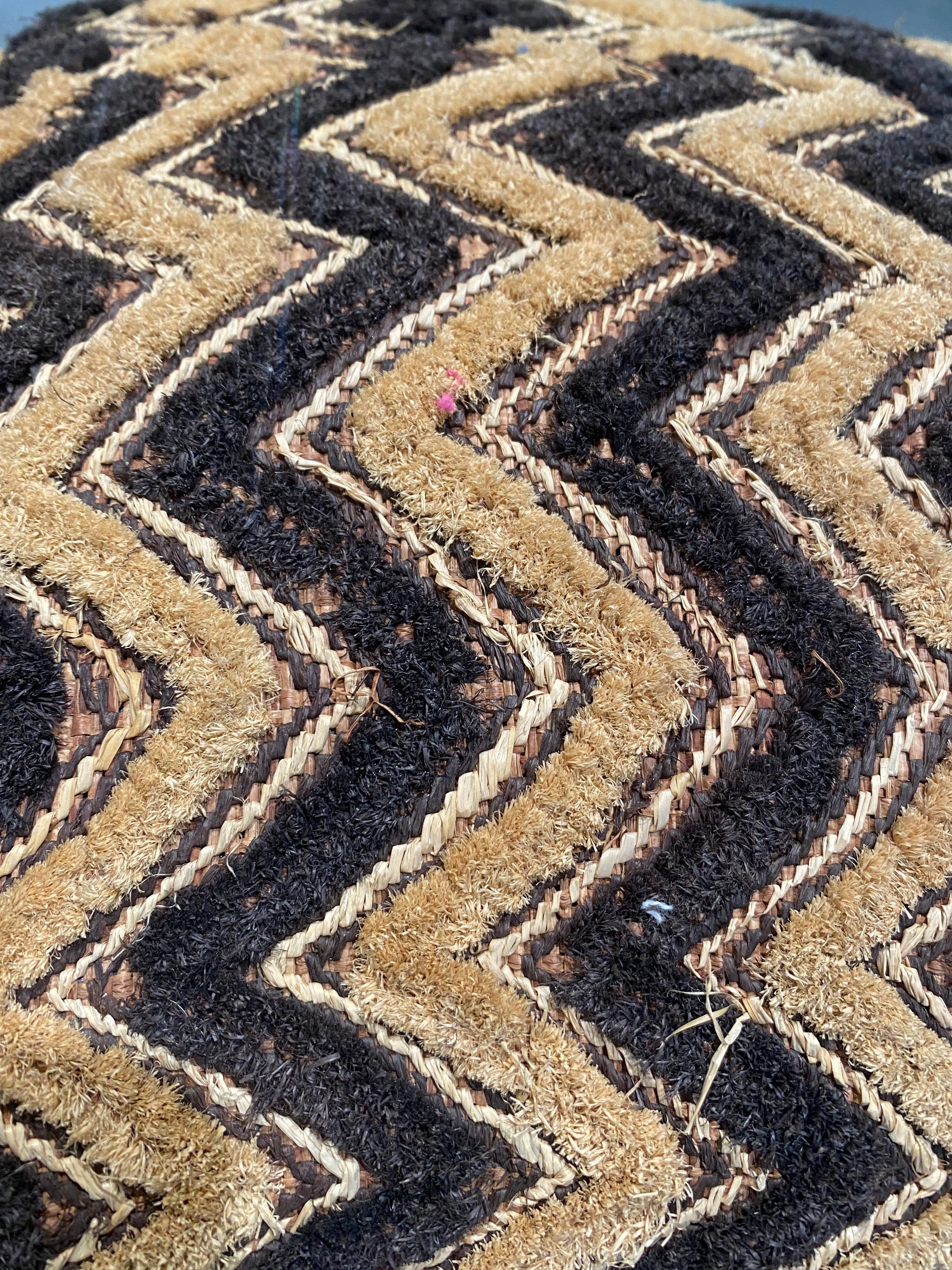 Historic Details : The Showa fabric cushion hails from the Democratic Republic of Congo, meticulously crafted from raffia cut-pile cloths. These exquisite textiles are woven by the skilled hands of Kuba men and delicately embroidered by women, showcasing an unparalleled level of craftsmanship and attention to detail. Notably, the absence of visible stitching on the back underscores the artisans' remarkable precision and expertise.