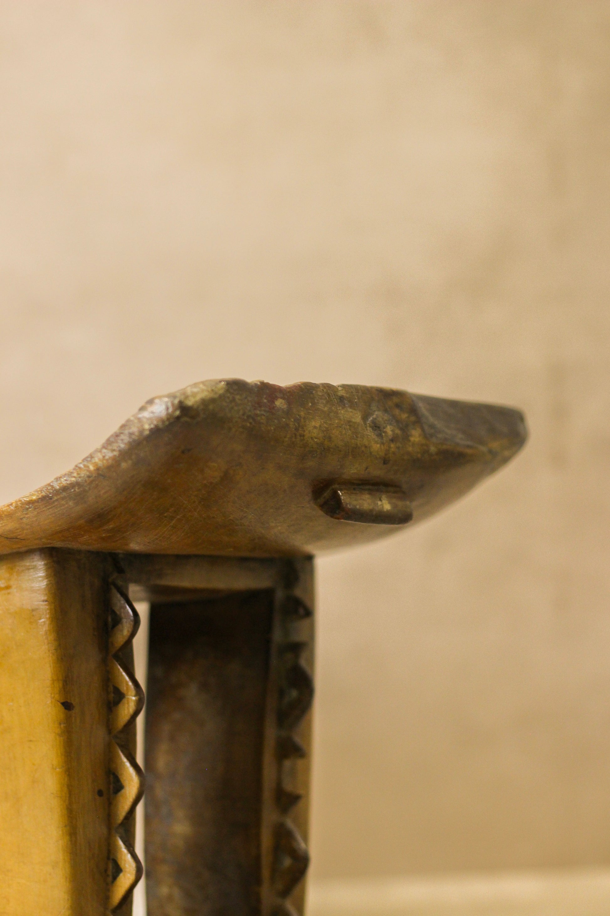 Historic Detail : The Golden Stool is a sacred symbol of the Ashanti nation believed to possess the sunsum (soul) of the Ashanti people. ... These stools were made for chiefs and important people and were considered important state regalia. They were believed to contain the soul of the owner. The seats were crescent-shaped, and the stool was carved from a single piece of wood, reflecting the skill and talent of the stool carvers and not nailed together like European chairs. Among the Akan, a well-carved stool serves multiple purposes, in addition to providing a well-designed seat to sit upon. Among the Akan, when a daughter reaches the age of puberty, her father is expected to give her a stool that becomes not only her property, but also identification with her soul and being. Often stools will be seen with their upper corners worn from being leaned up against the wall or laid down on their sides, all to prevent someone else from sitting on it or worse a malevolent spirit could take charge of the stool and the owner’s spirit. Stools start out as a white wood and through time take on a burnished and well-worn hue. Designs of stools may vary depending on the inventiveness of the stool carver, and today many of the historical forms are either forgotten or interpreted anew.