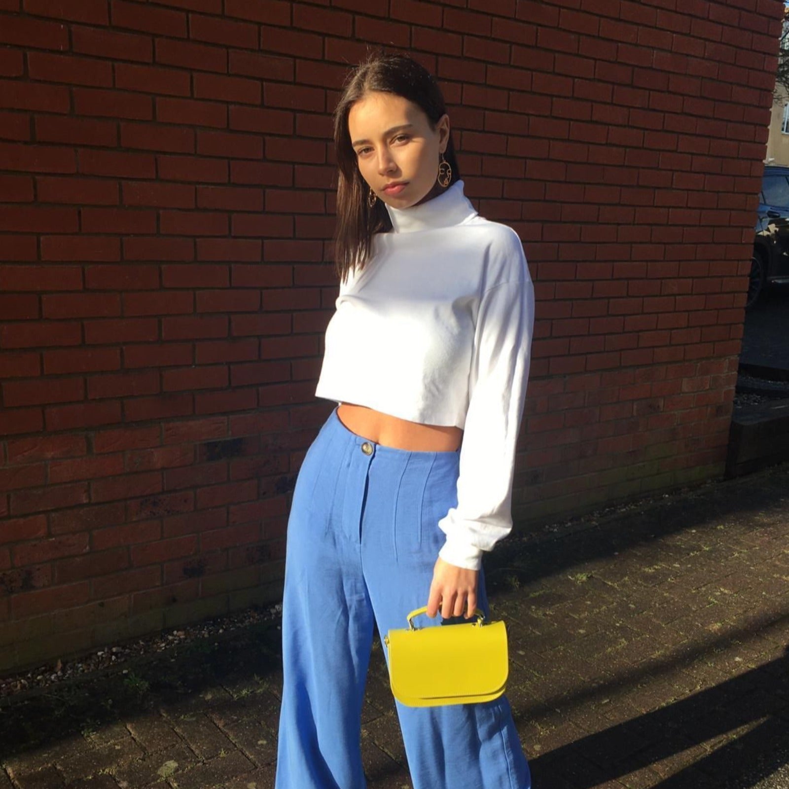 Model carries the Pastel Daffodil Yellow Aura & example of what fits shows, small purse, lipstick, gum, mobile phone.
