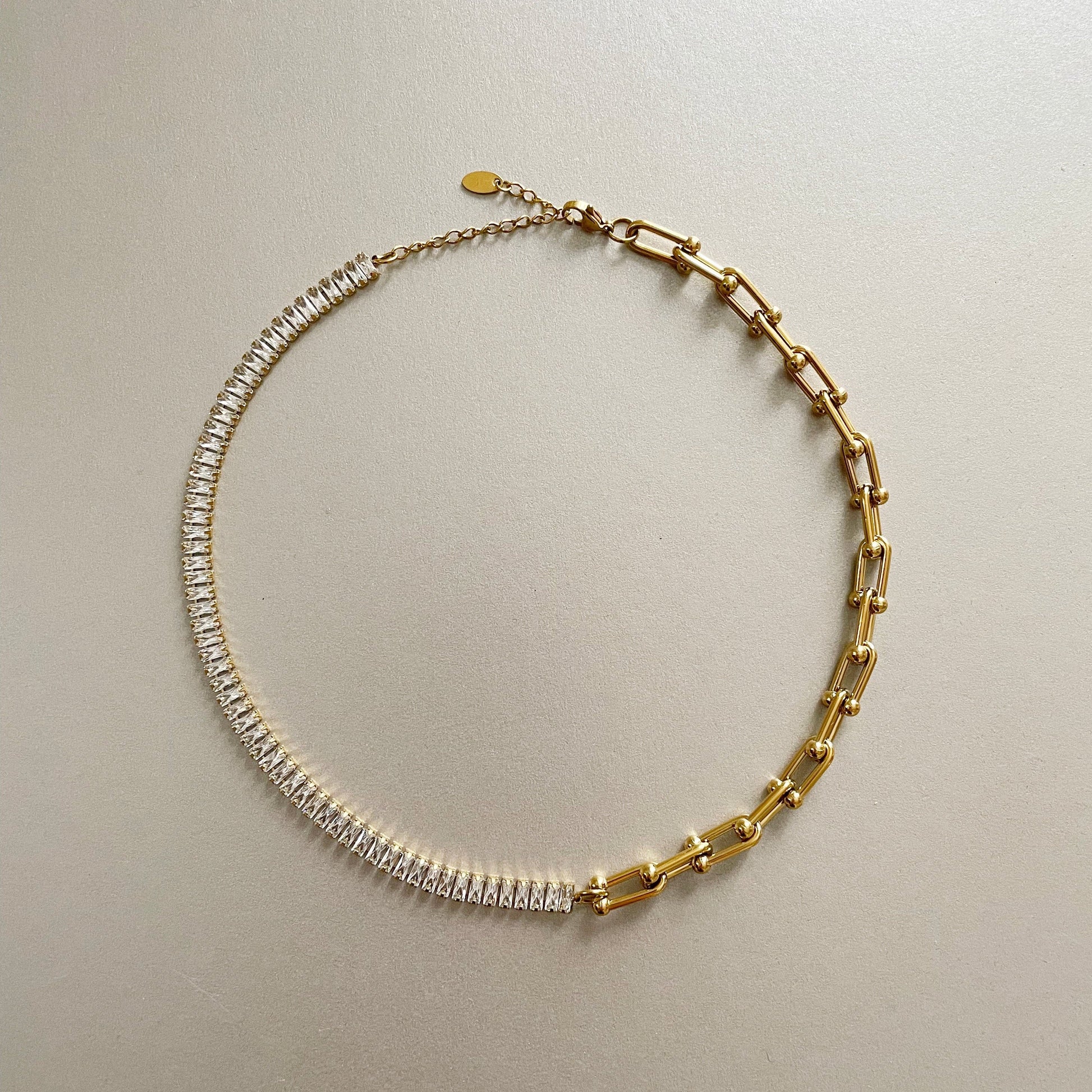 The Aurielle asymmetric crystal chain necklace is 18k gold plated and is a gorgeous collar length necklace for your collection.