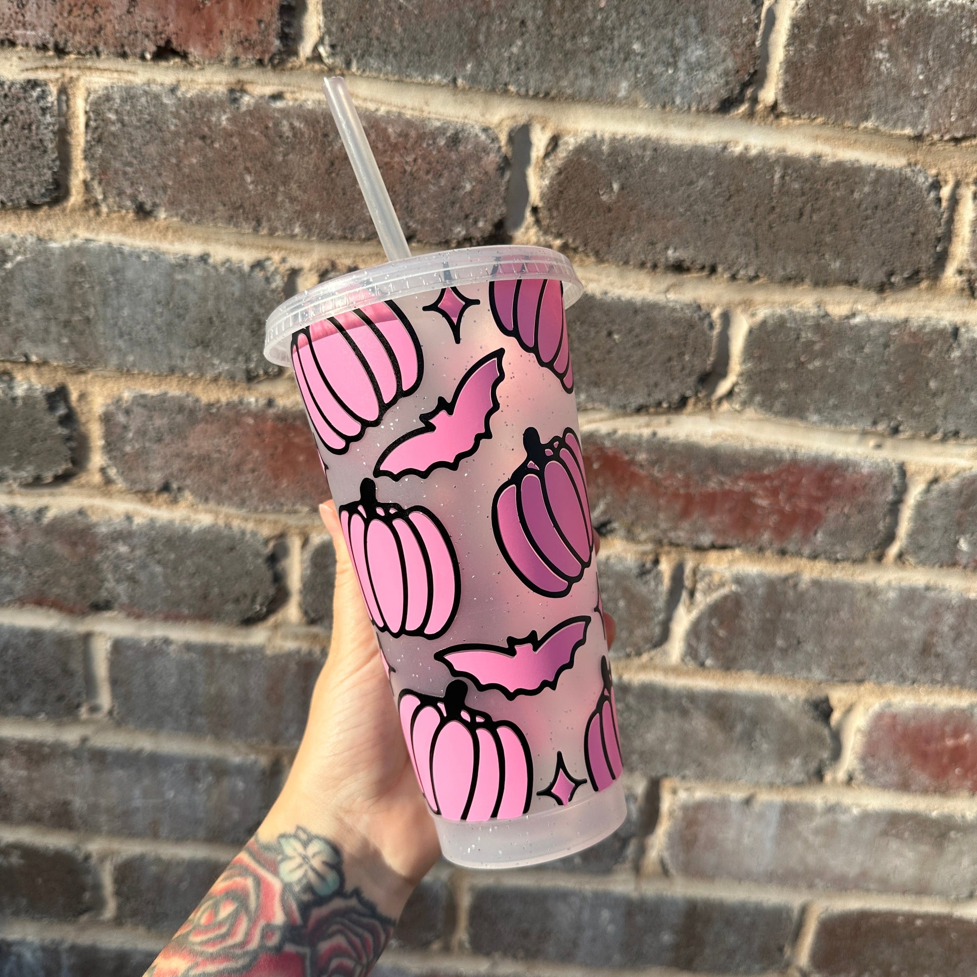 Autumn Halloween Pumpkin Bat Print Tumbler Venti Cold Cup 24oz - With Straw