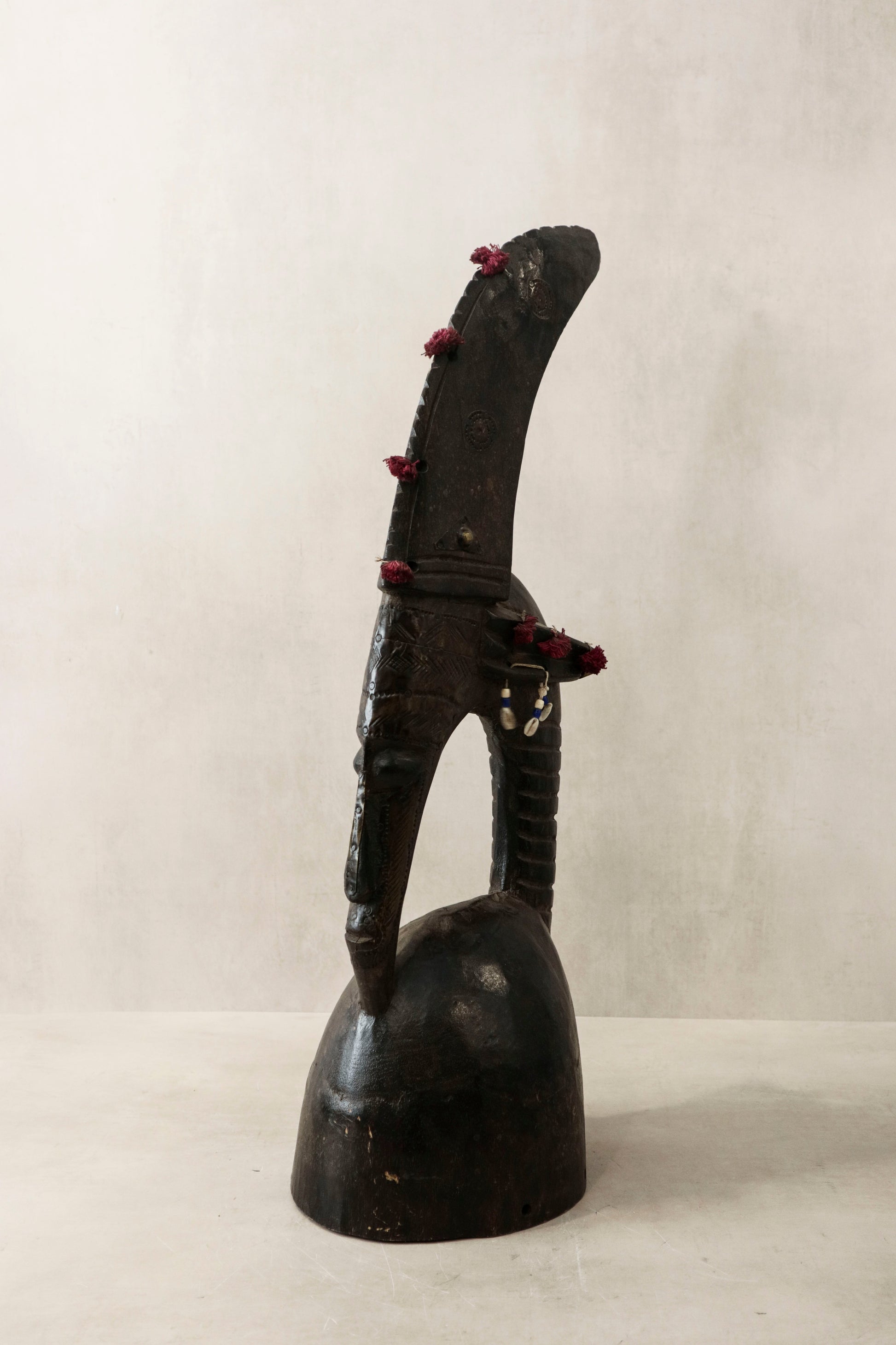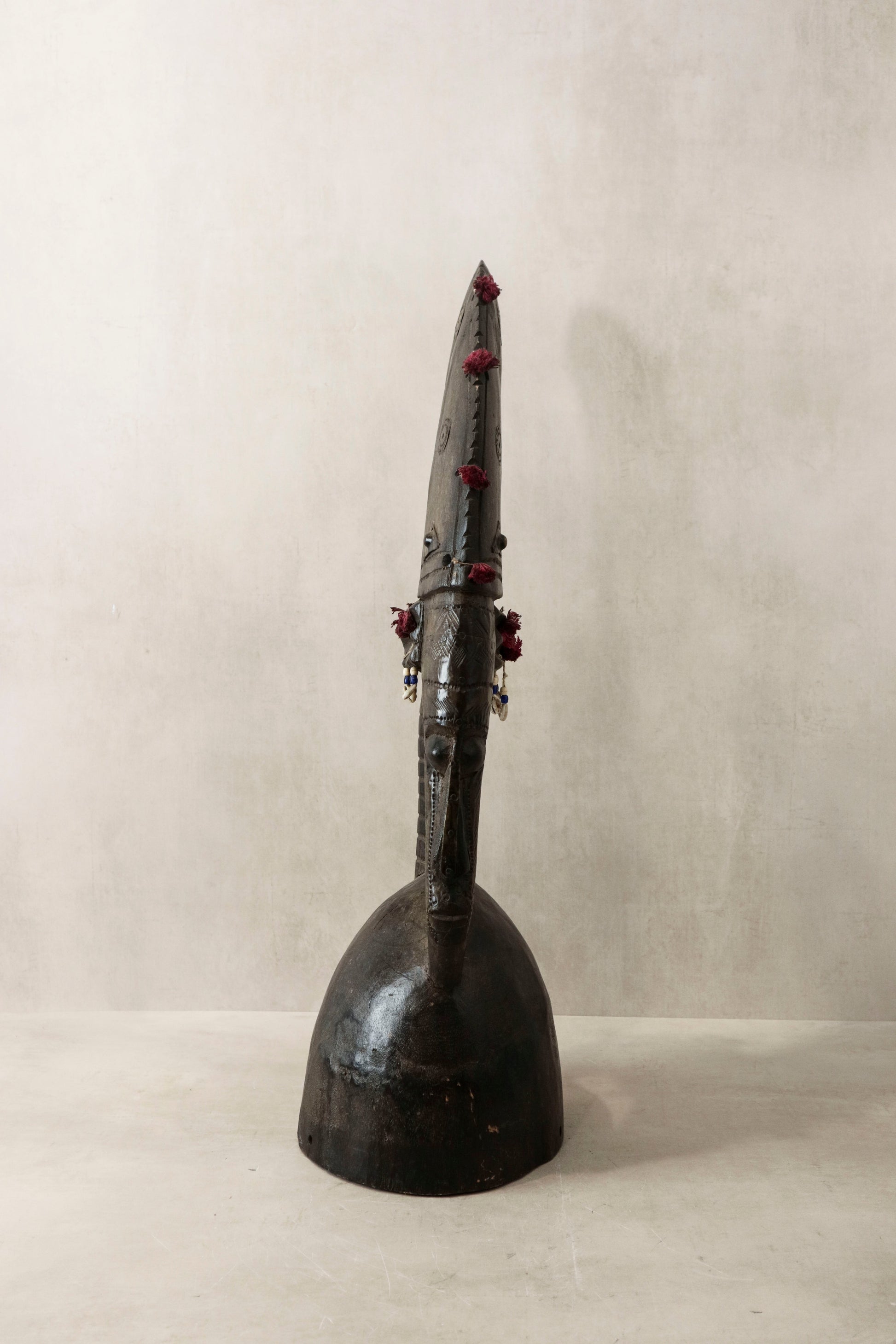 A beautiful hand crafted helmet mask embellished with metal and fabric detail. Each mask represents male or female. Originates from Mali. The masks are used in ceremonies and worn on the head.