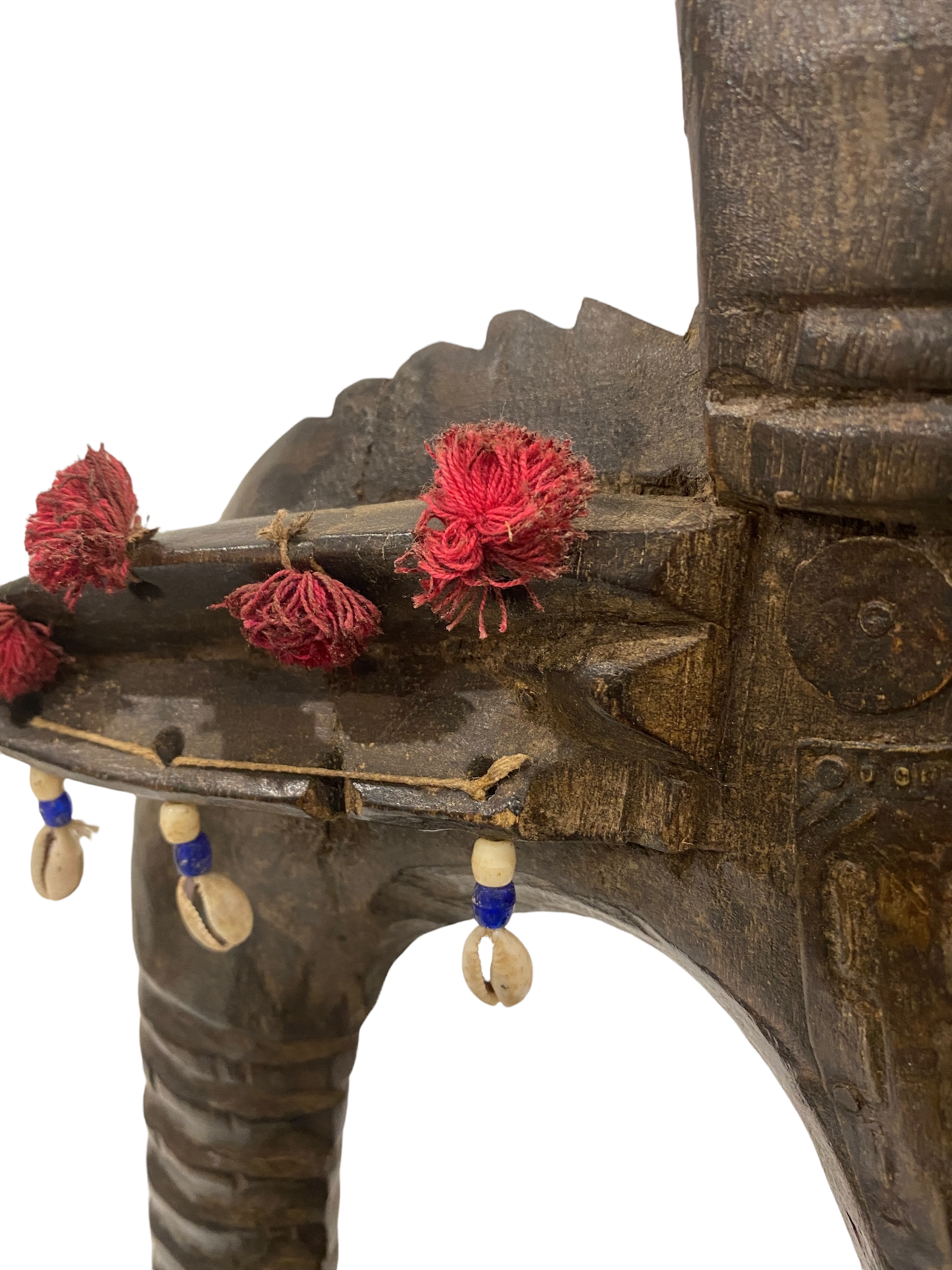 A beautiful hand crafted helmet mask embellished with metal and fabric detail. Each mask represents male or female. Originates from Mali. The masks are used in ceremonies and worn on the head.