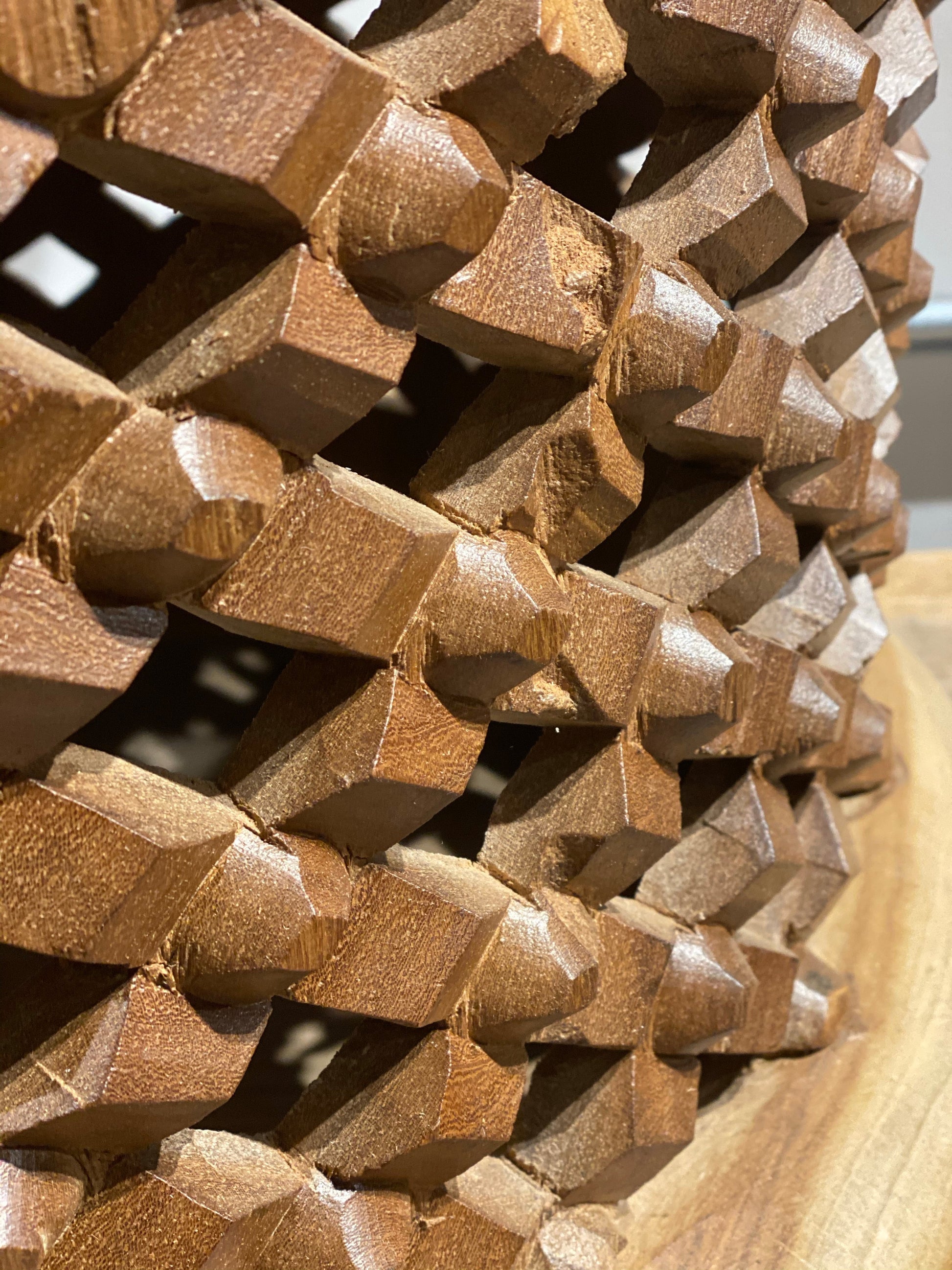 The seat is the most important piece of furniture in Africa, usually corresponding to his social rank. The craftsmen of the Bamileke are famed for their skill in woodcarving. They create a variety of remarkable round stools with repetitive openwork designs, all carved out of one tree trunk stump. This is a table piece.