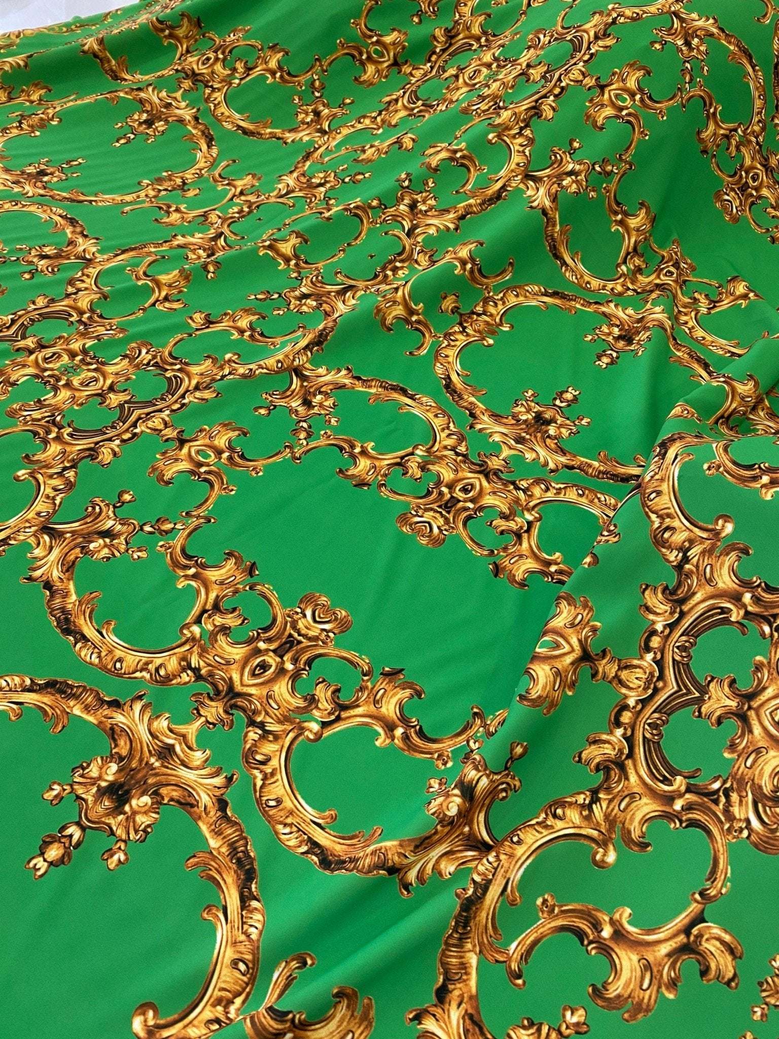 Baroque Green Gold Print Fabric – Multiple Fabric Options, Sold by Metre