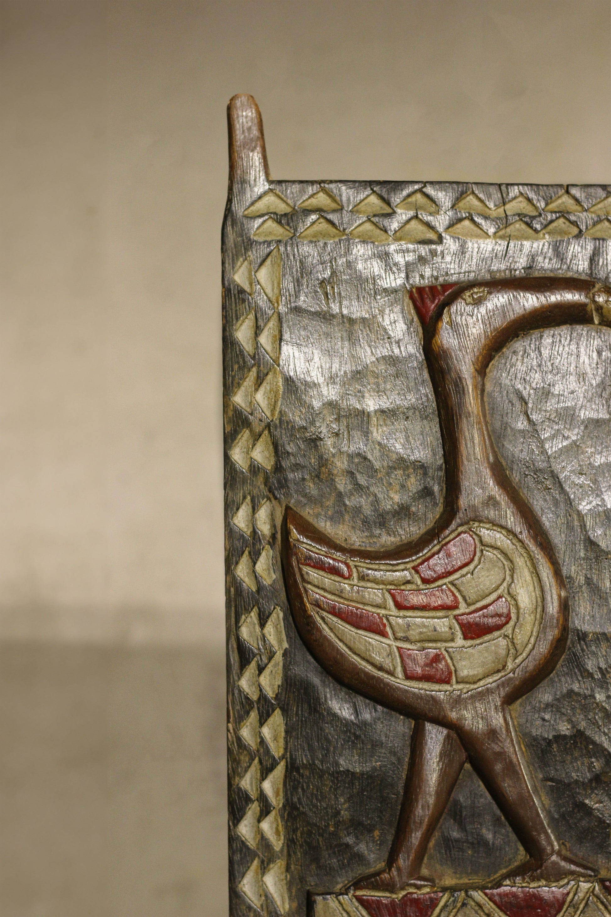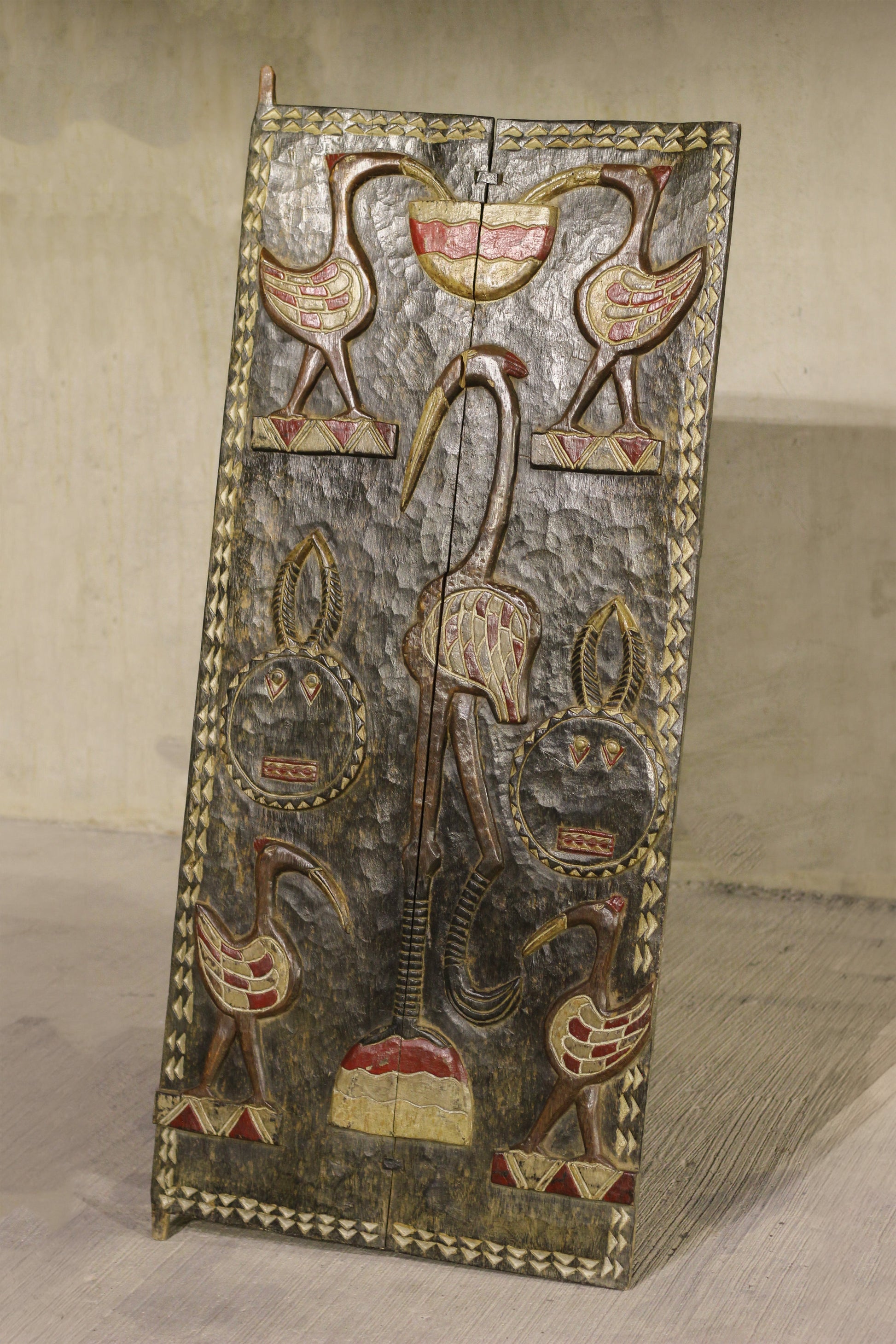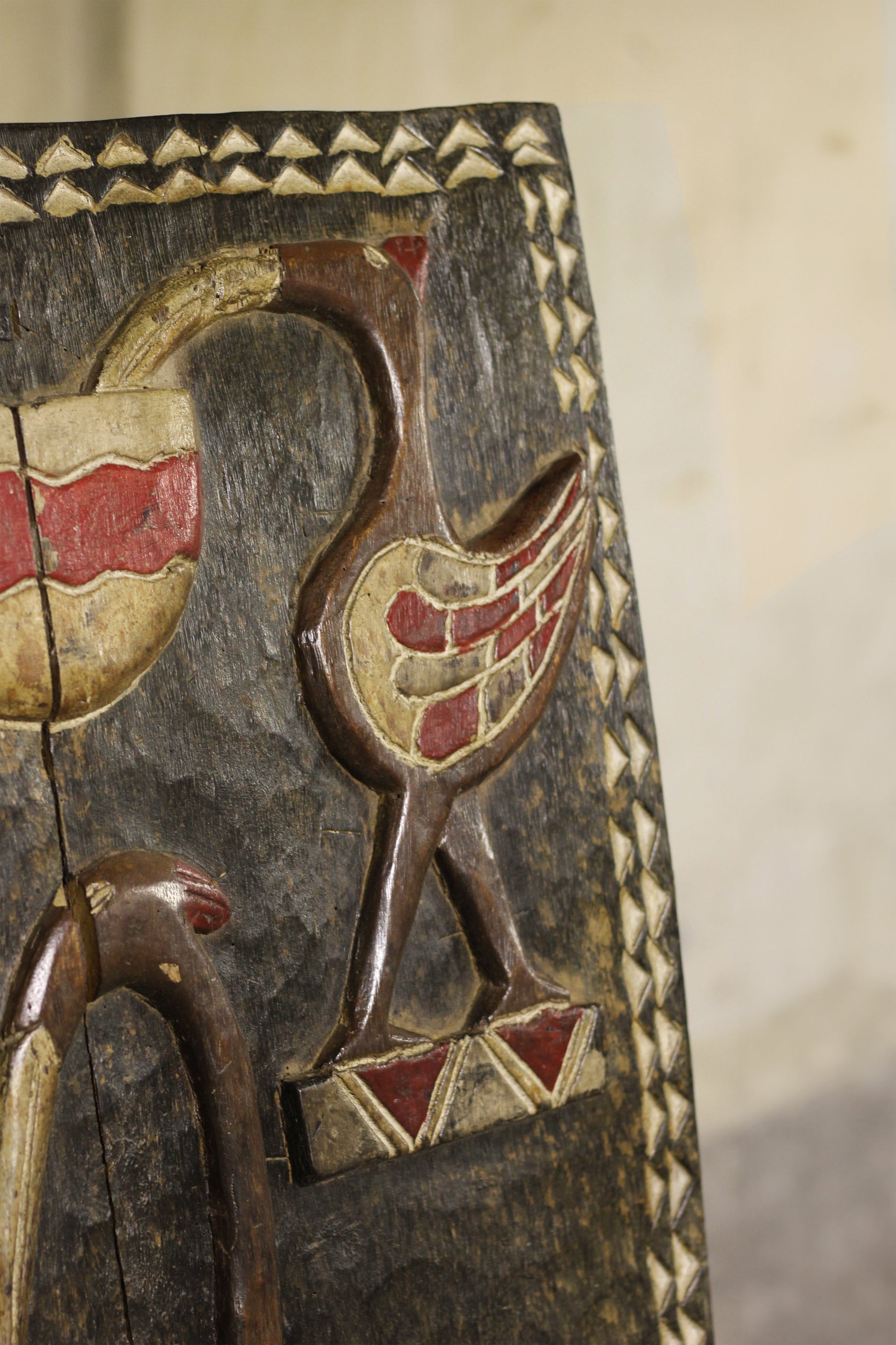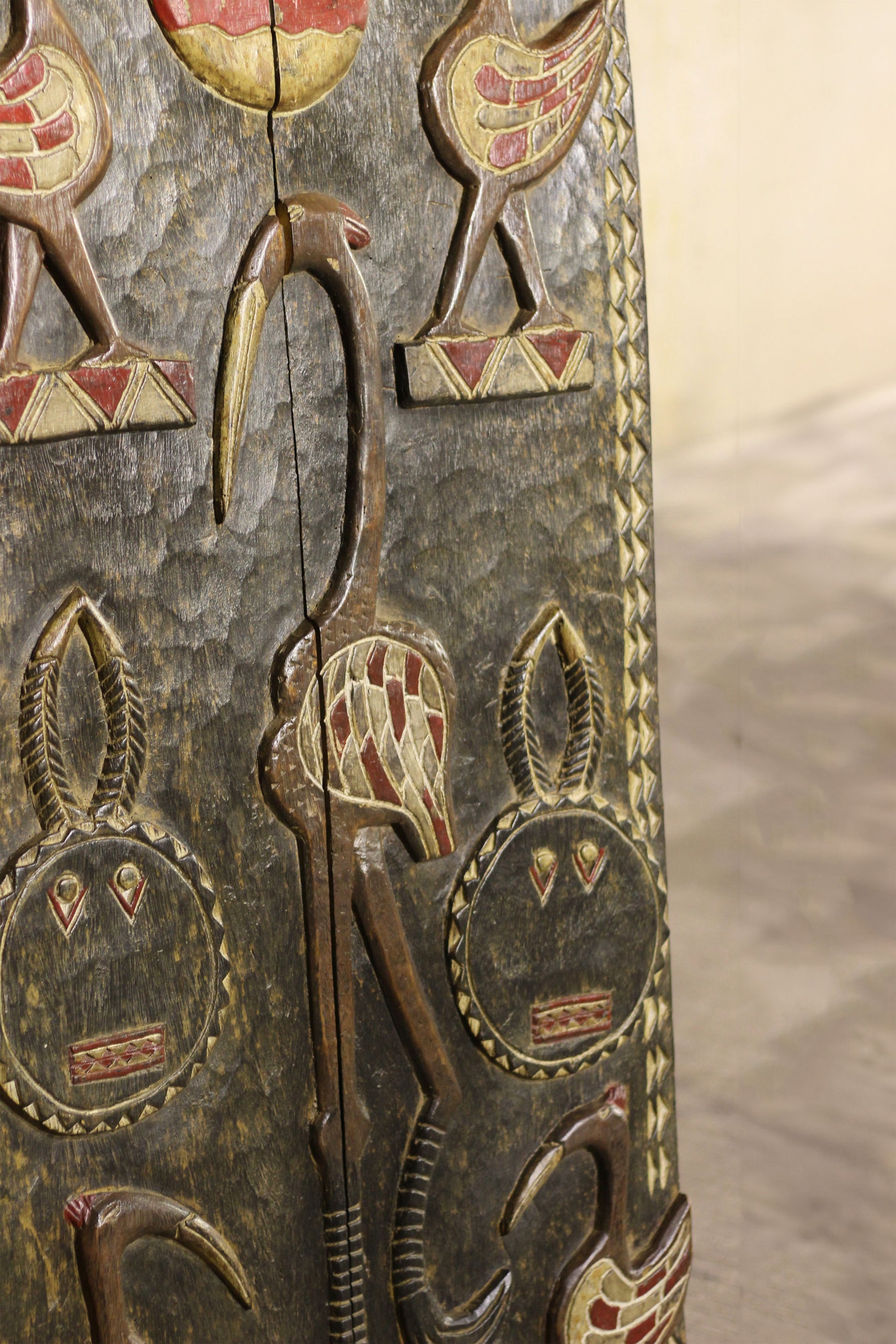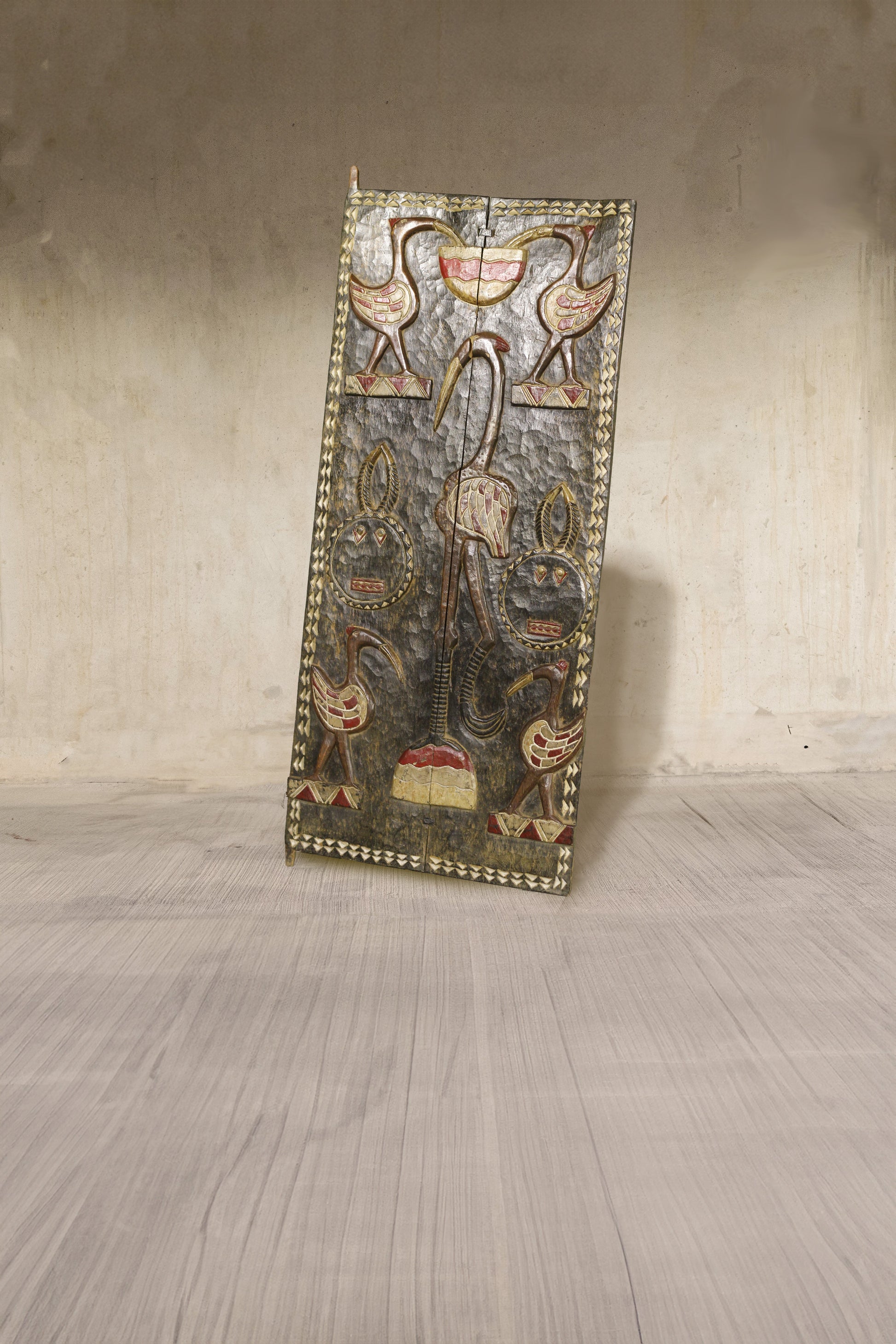 This Baule traditional very old door is embellished with objects which facilitate the relationship between the living world and spiritual. They are known as Anuan, showing hand carved animal and human and sometimes vegetation motifs. They were once used as entrance doors to courtyard houses.
