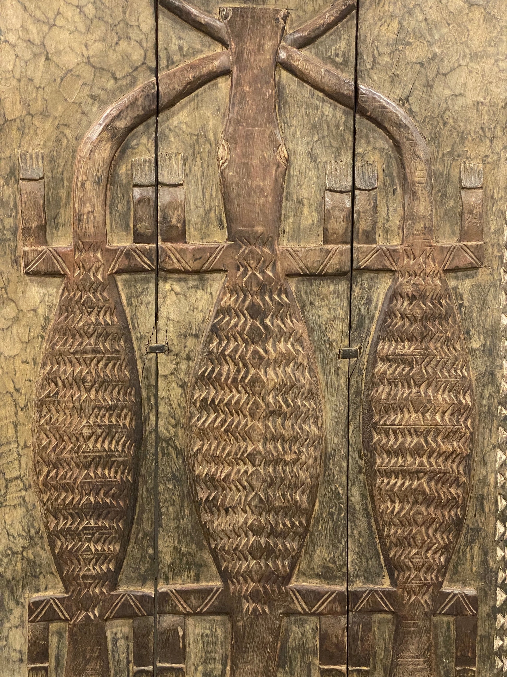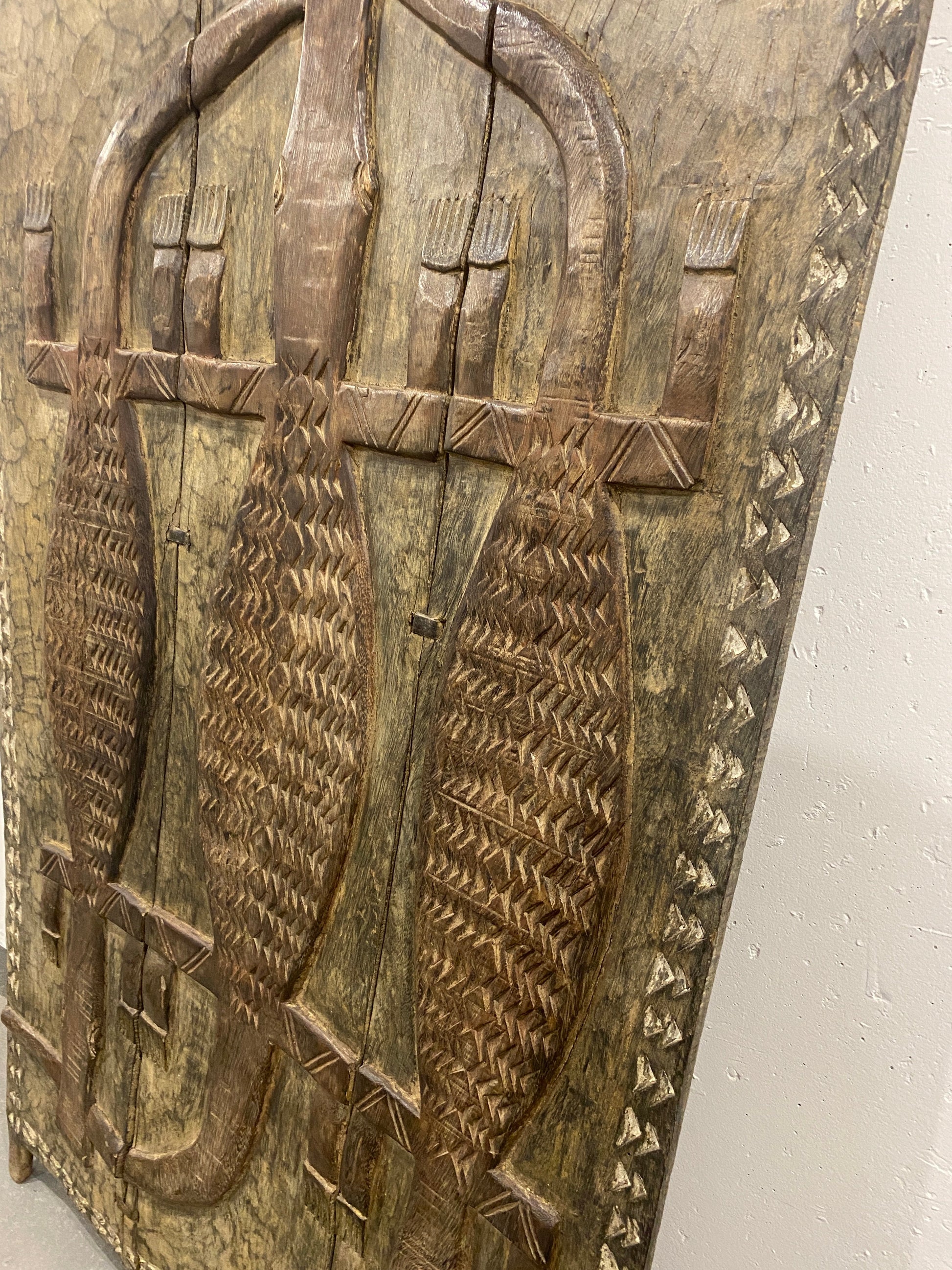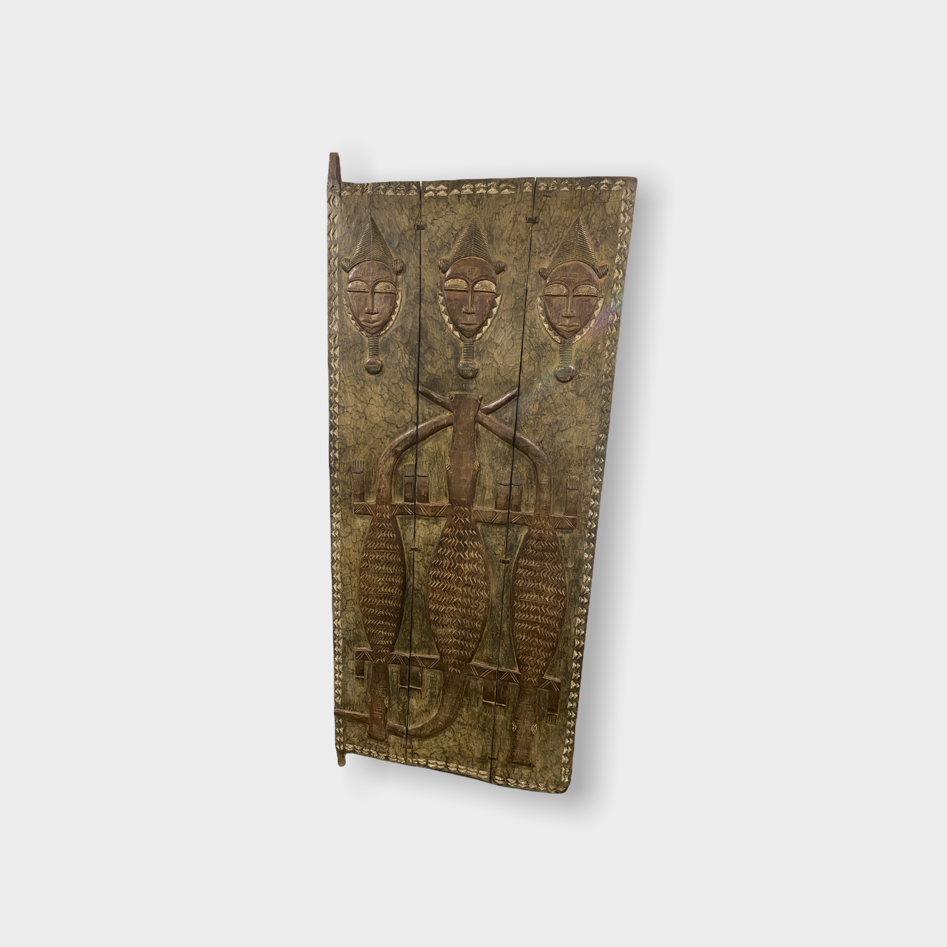 This Baule traditional very old door is embellished with objects which facilitate the relationship between the living world and spiritual. They are known as Anuan, showing hand carved animal and human and sometimes vegetation motifs. They were once used as entrance doors to courtyard houses.