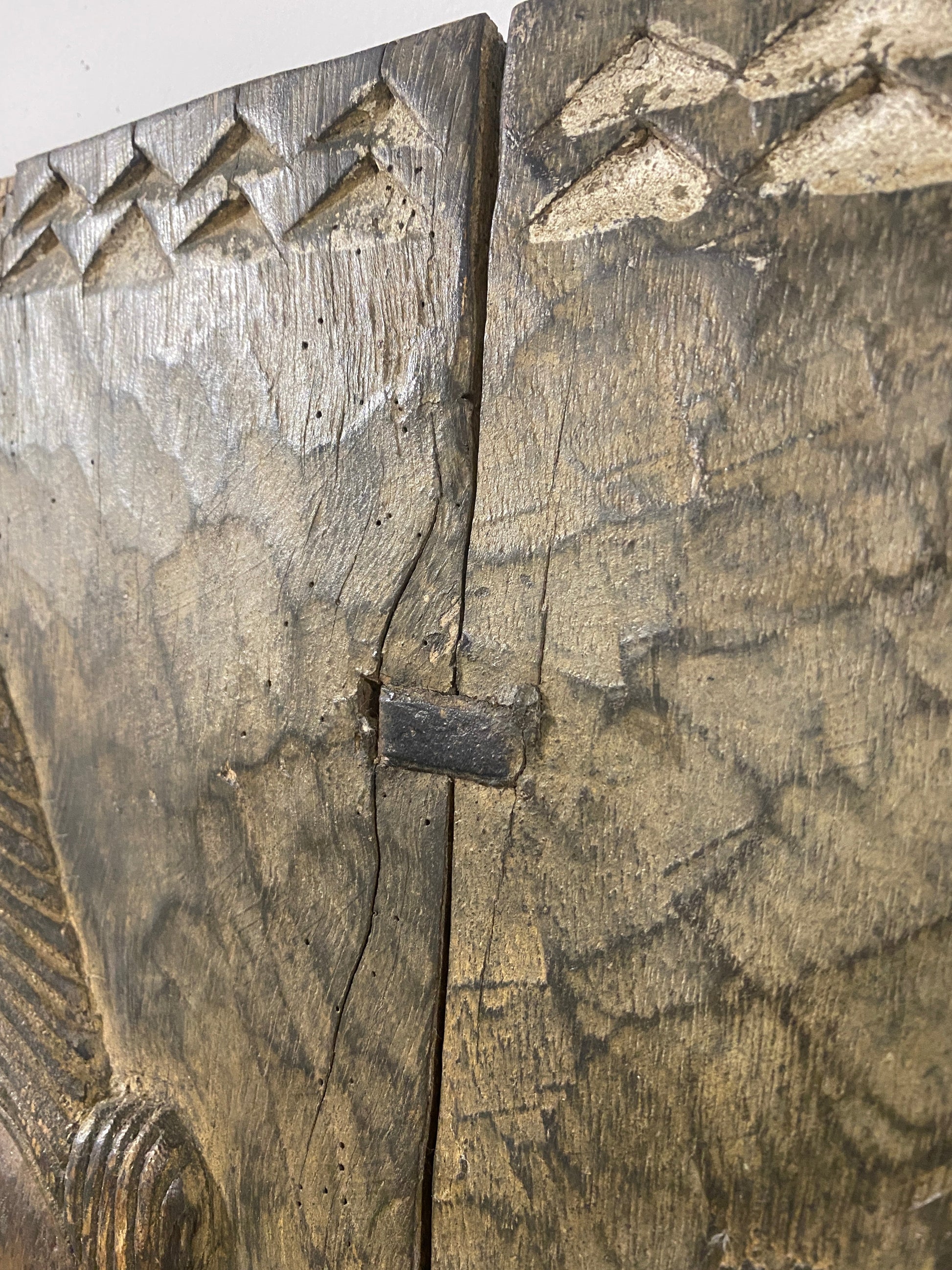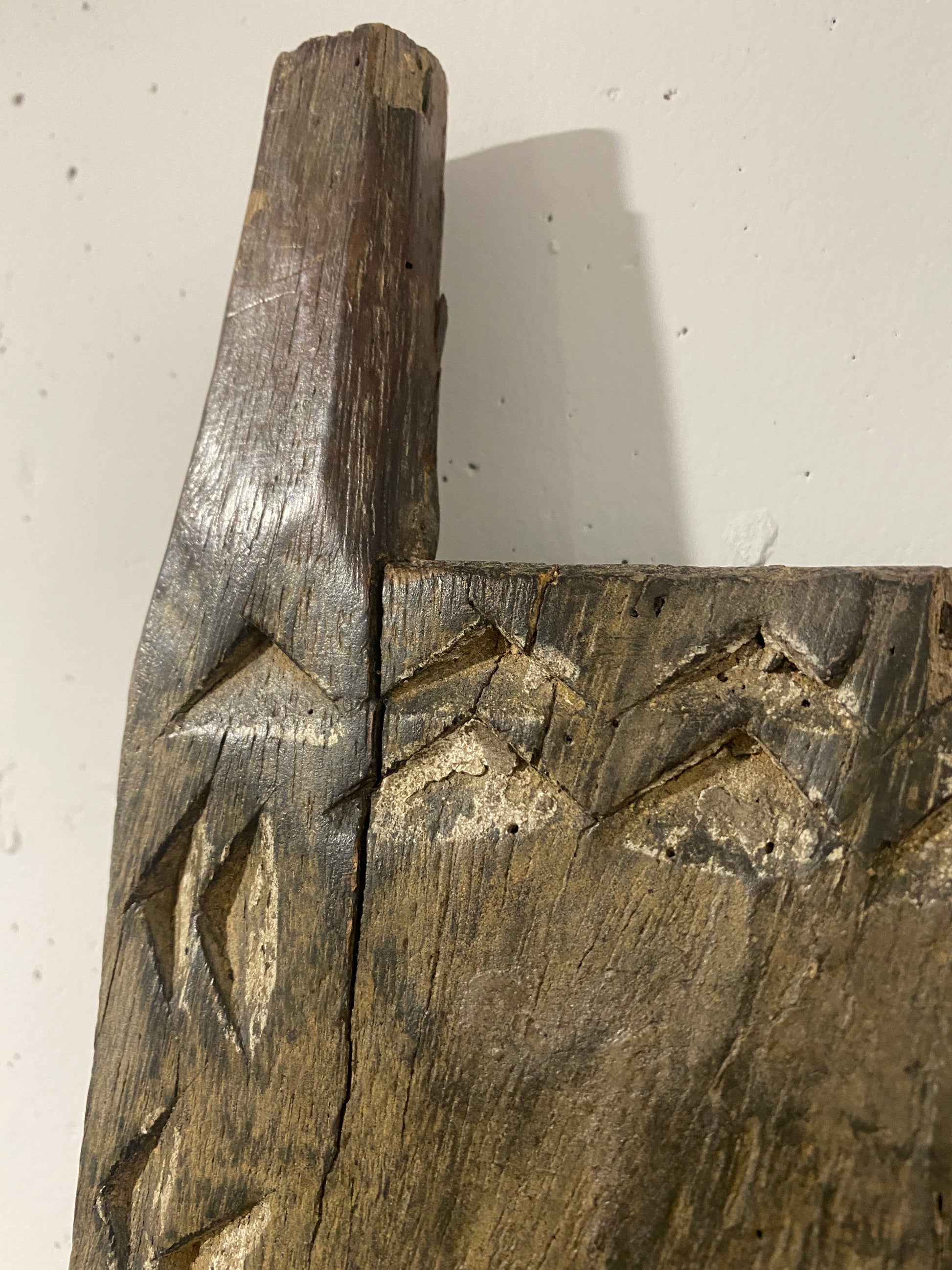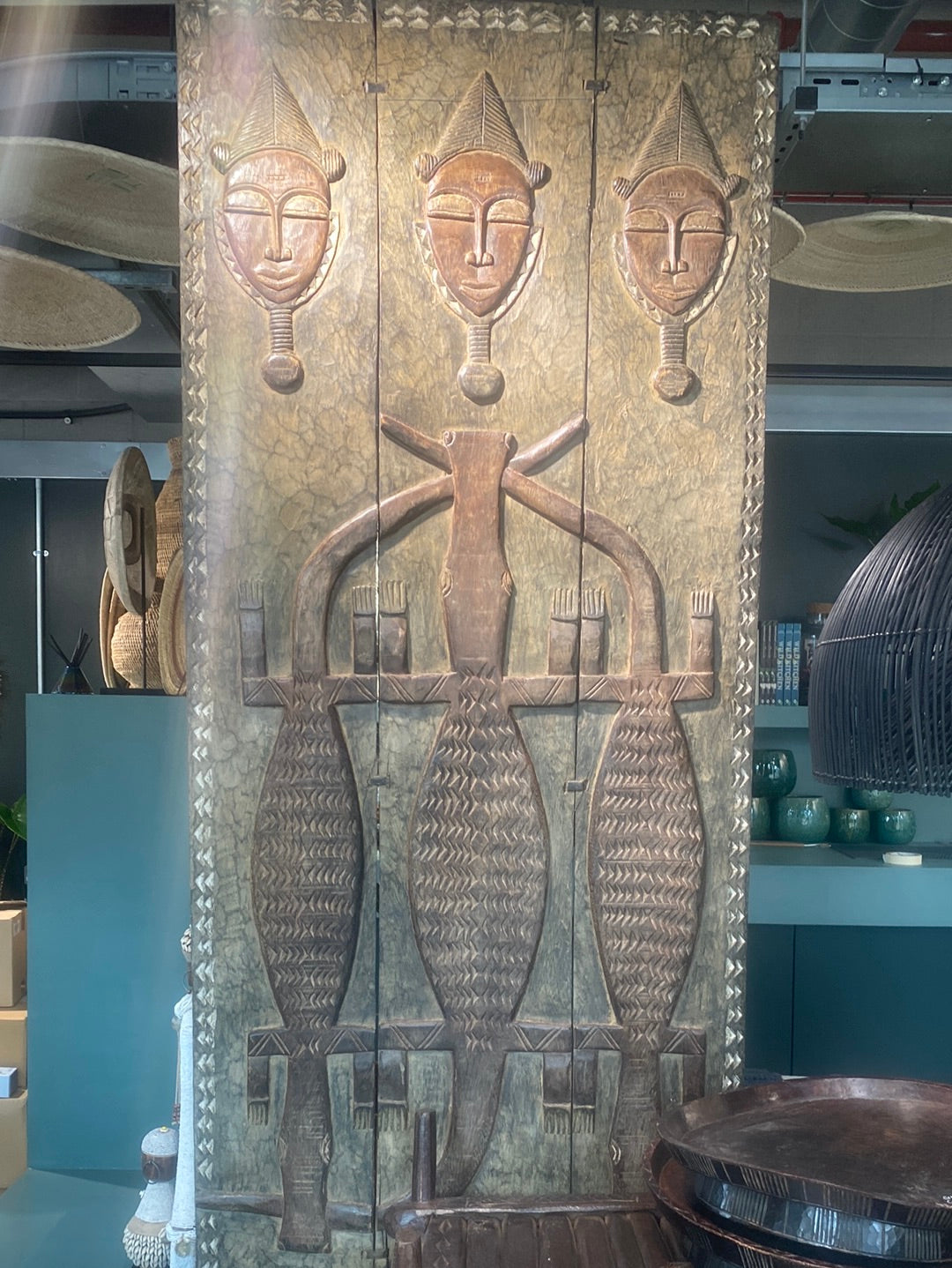 This Baule traditional very old door is embellished with objects which facilitate the relationship between the living world and spiritual. They are known as Anuan, showing hand carved animal and human and sometimes vegetation motifs. They were once used as entrance doors to courtyard houses.