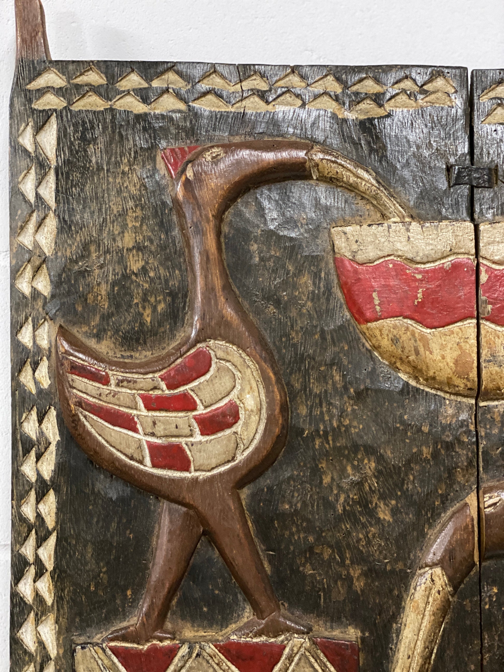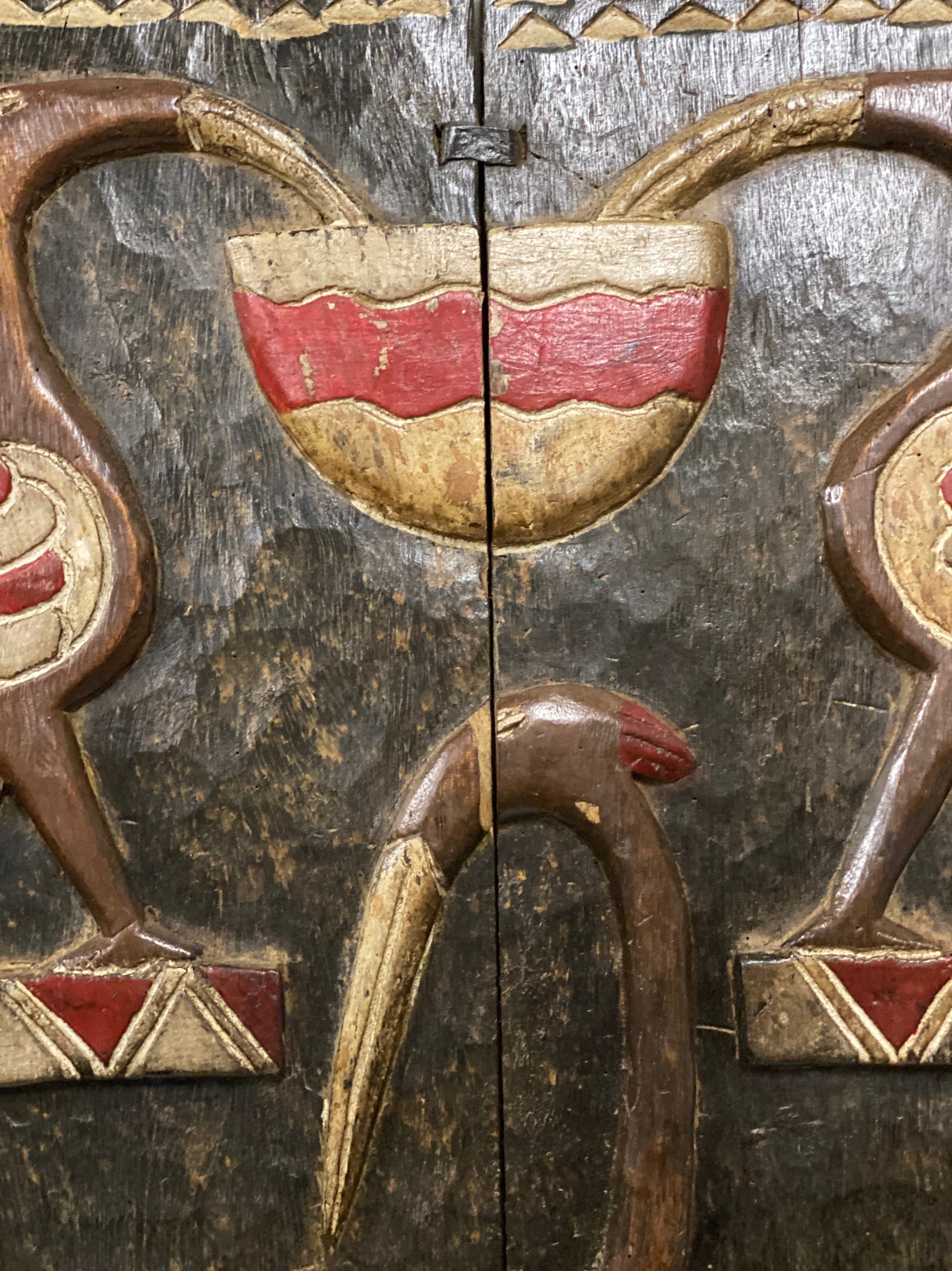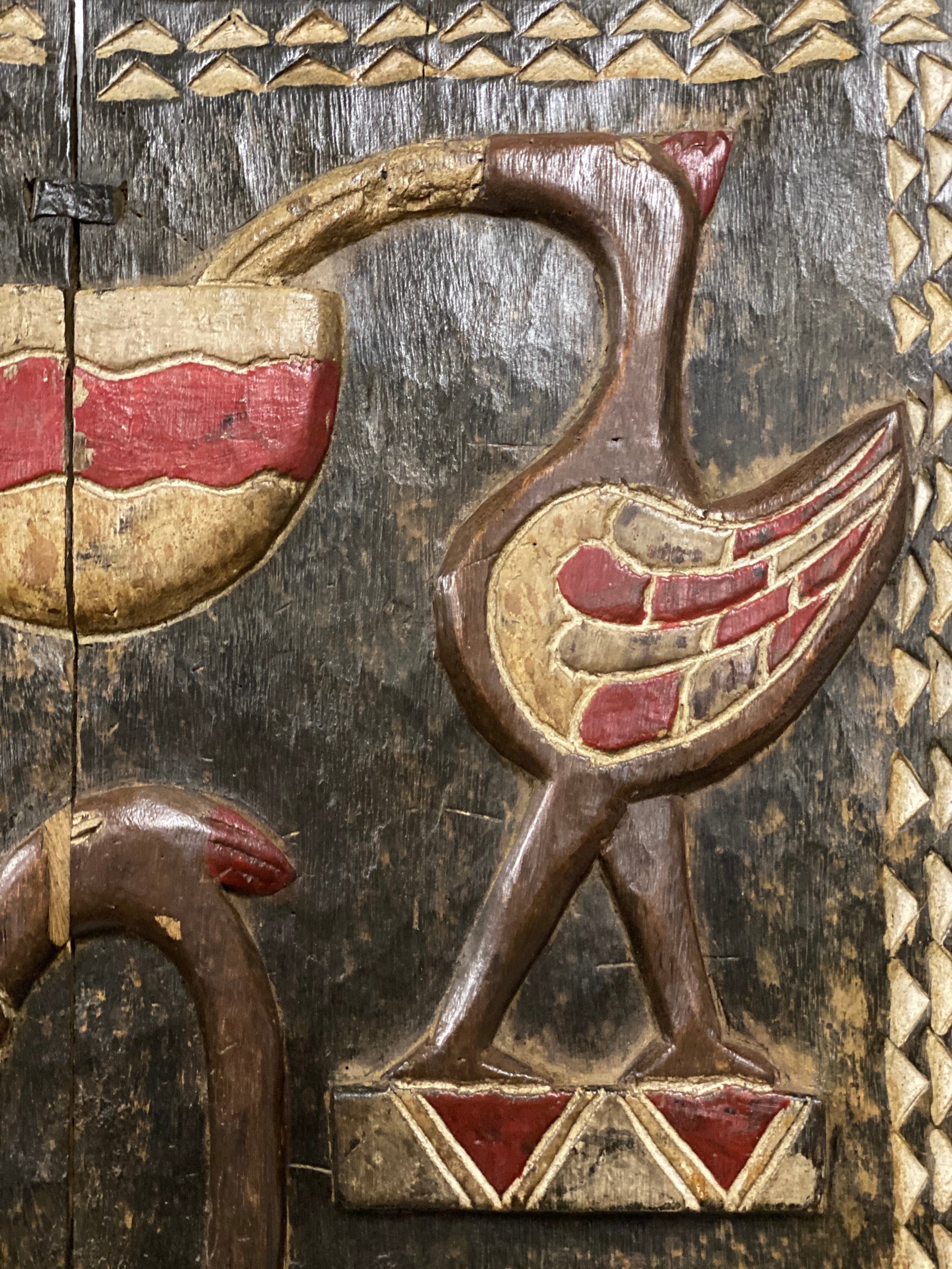 This Baule traditional very old door is embellished with objects which facilitate the relationship between the living world and spiritual. They are known as Anuan, showing hand carved animal and human and sometimes vegetation motifs. They were once used as entrance doors to courtyard houses.