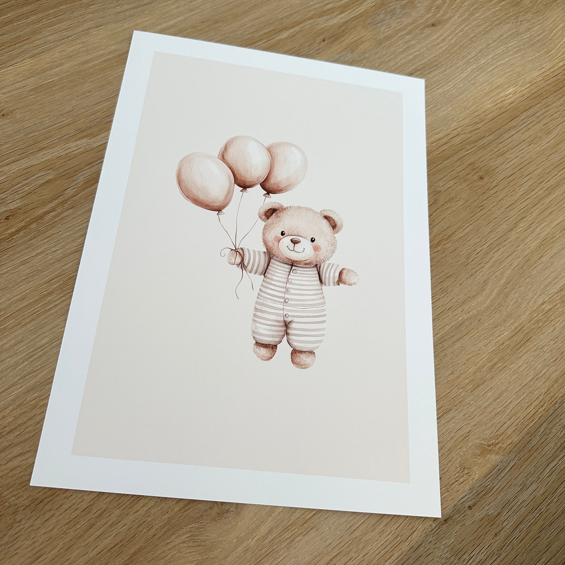 Bedtime Bear With Balloons Watercolour Nursery Children's Boho Netural Room Wall Decor Print