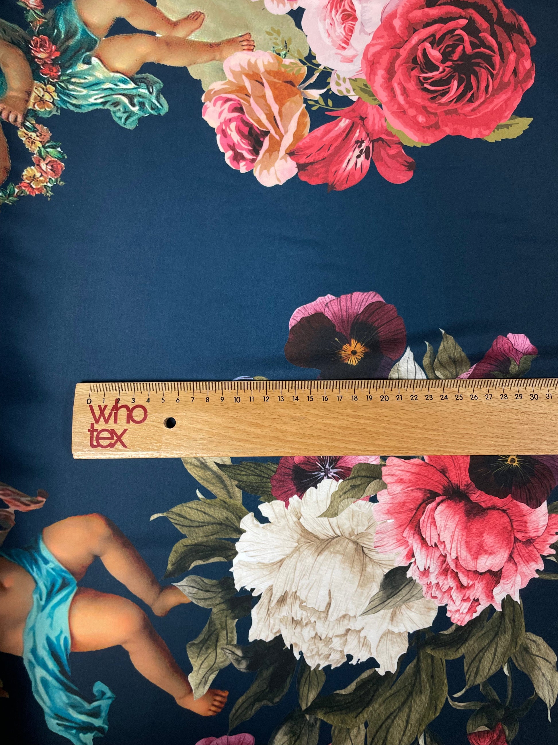 Luxurious black satin fabric with romantic cherub and floral print. Ideal for statement dresses, elegant blouses, costumes and creative sewing projects.