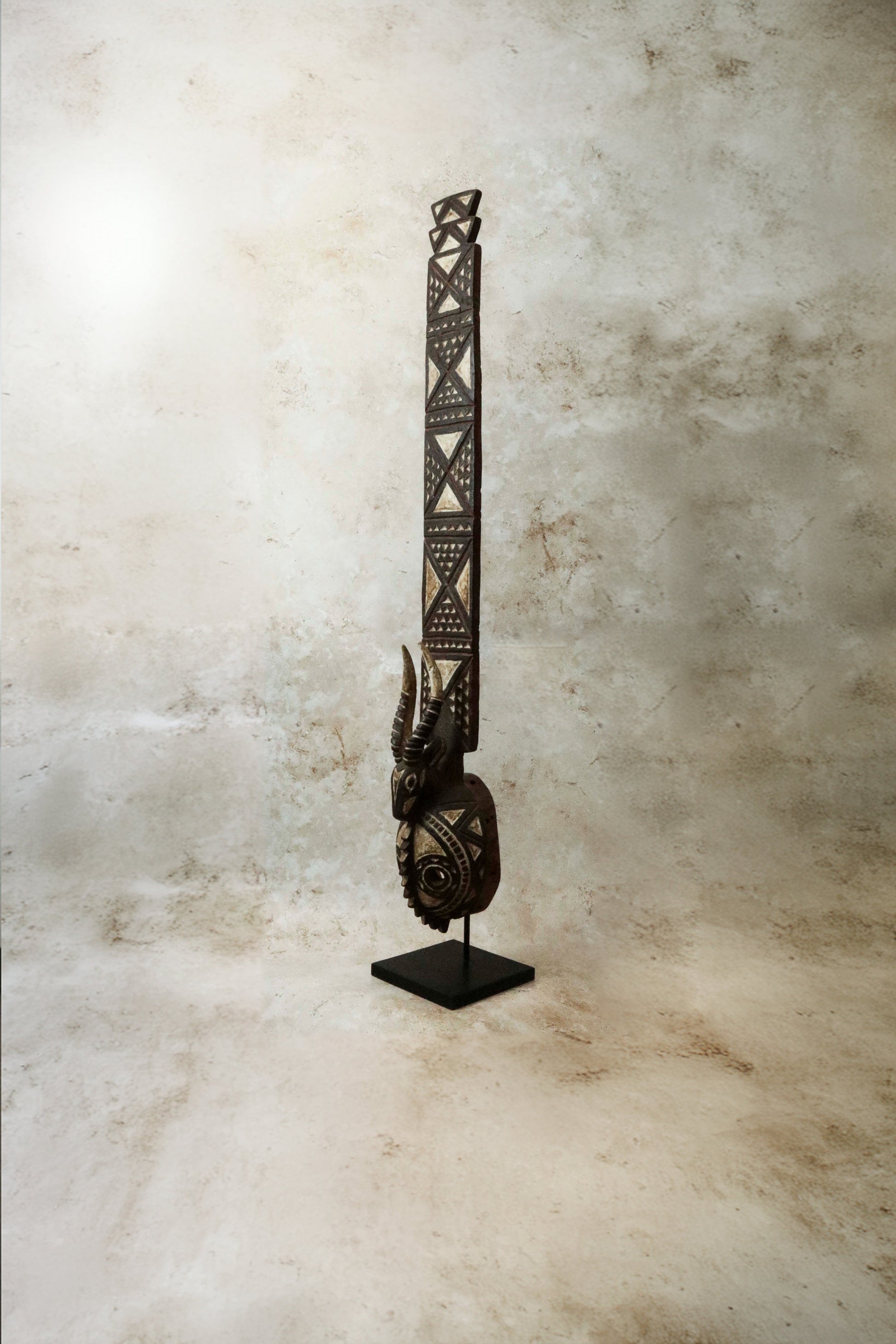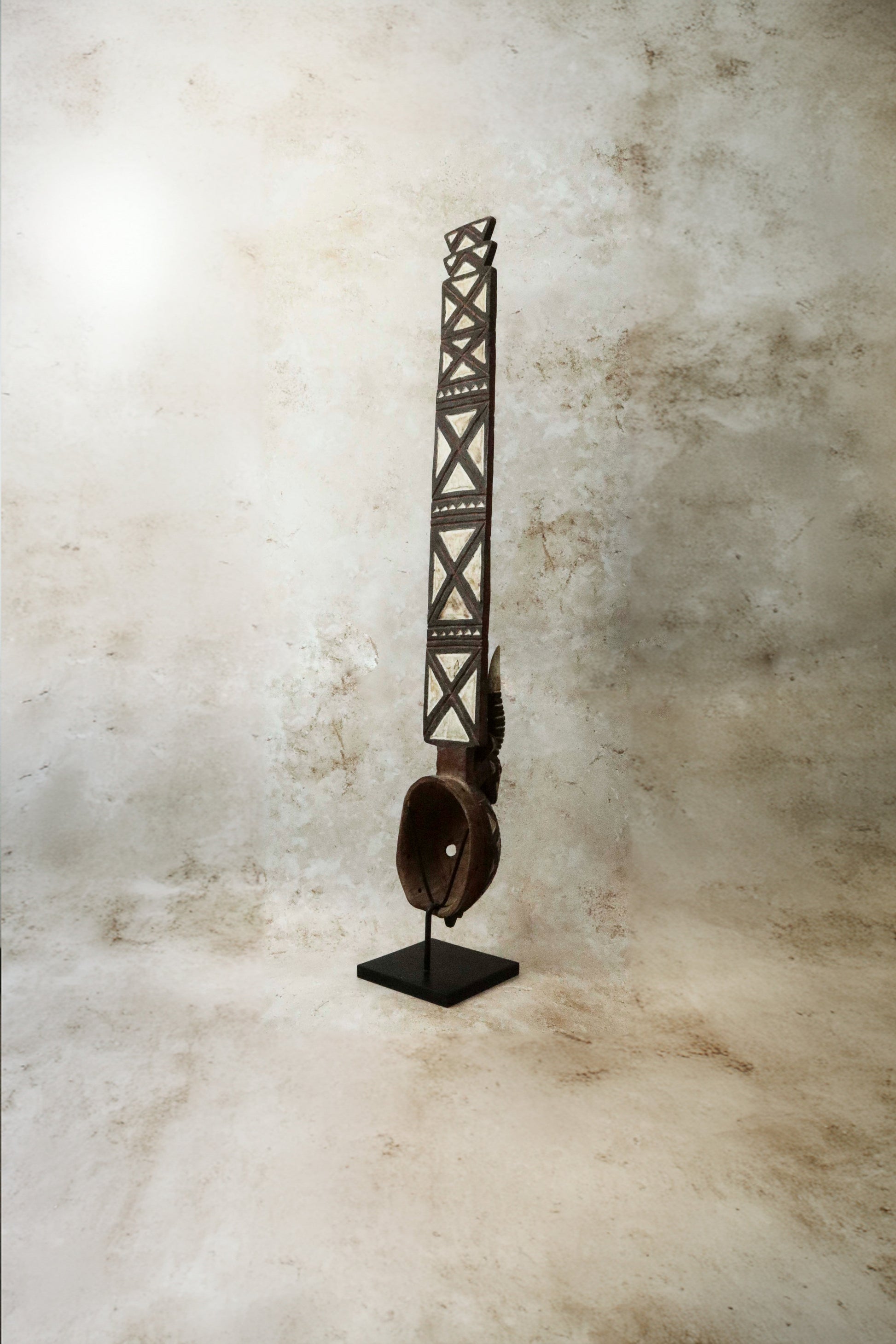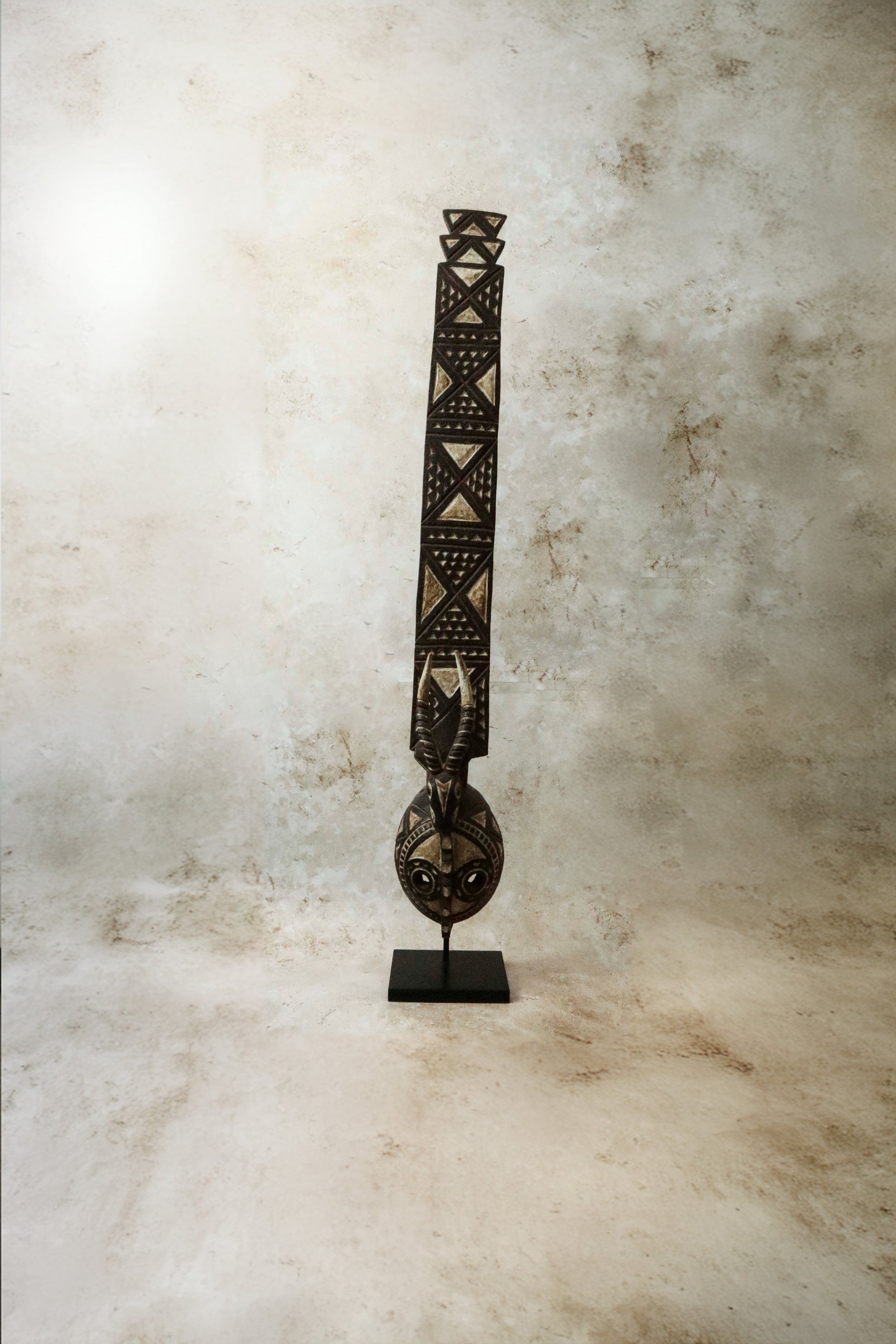 These fine and superb plank mask named Nwantantay, is handcrafted and used by the southern Bwa ethnic group, south of Dedougou in Burkina Faso. It is presumed to represent nature spirits that the family elders encountered in the wilderness, and which watch over their families. The zig-zag lines on the mask represent the path of the ancestors that all Bwa must follow if they are to overcome adversity. The concentric circles are the sacred wells in one town that are said to be the “water spirit”. The masks are used for entertainment during market days, for initiation of young adults, and at annual yam festivals. The dancers appear wearing thick costumes of brightly dyed hemp fibre.