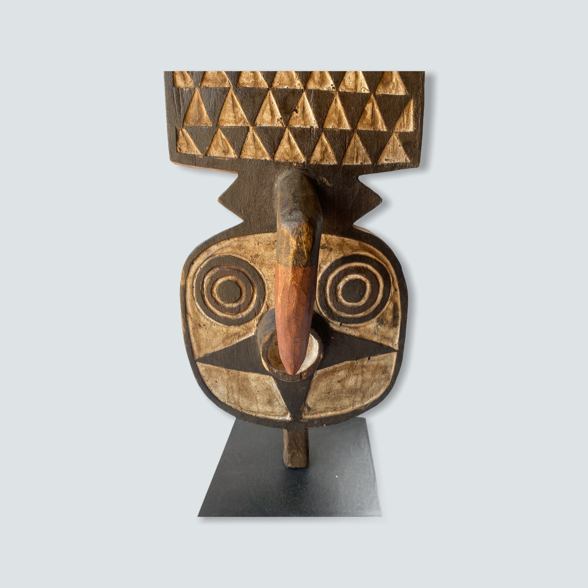 These fine and superb plank mask named Nwantantay, is handcrafted and used by the southern Bwa ethnic group, south of Dedougou in Burkina Faso. It is presumed to represent nature spirits that the family elders encountered in the wilderness, and which watch over their families. The zig-zag lines on the mask represent the path of the ancestors that all Bwa must follow if they are to overcome adversity. The concentric circles are the sacred wells in one town that are said to be the “water spirit”. The masks are used for entertainment during market days, for initiation of young adults, and at annual yam festivals. The dancers appear wearing thick costumes of brightly dyed hemp fibre.
