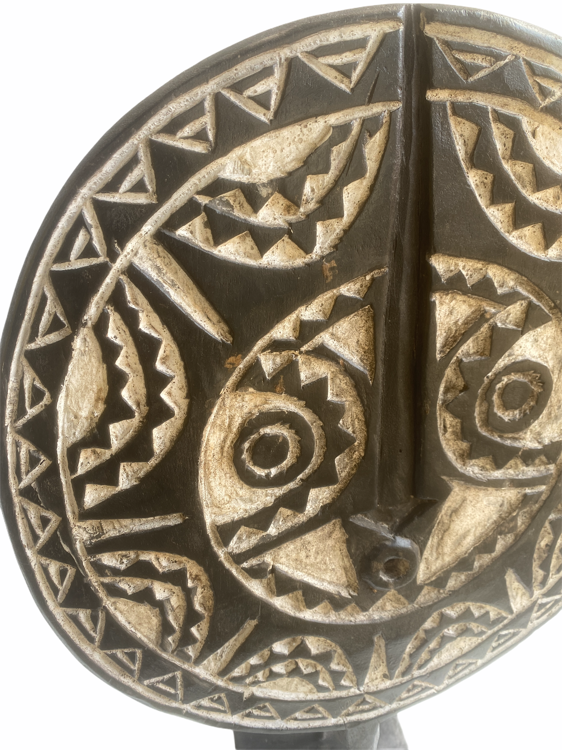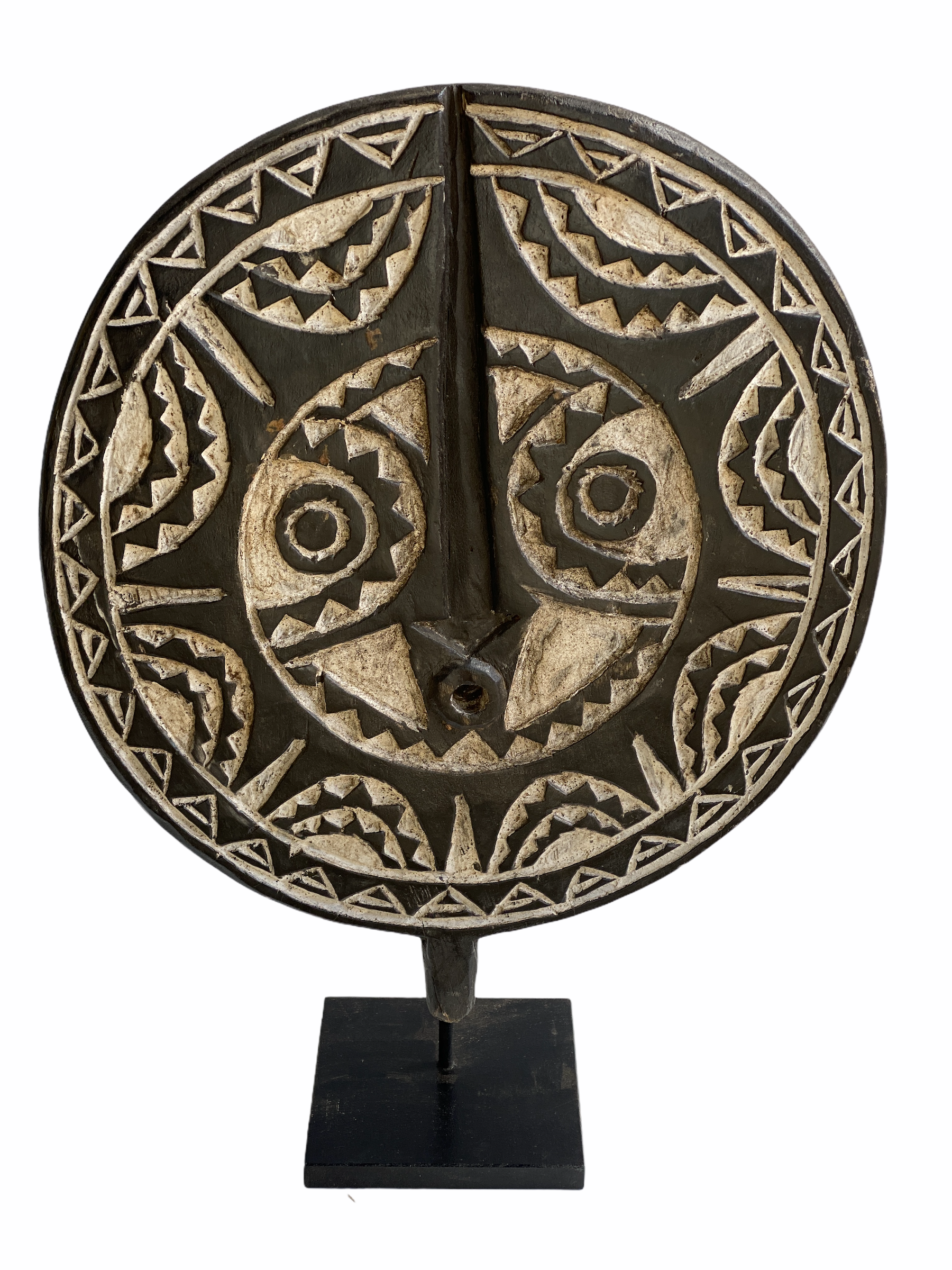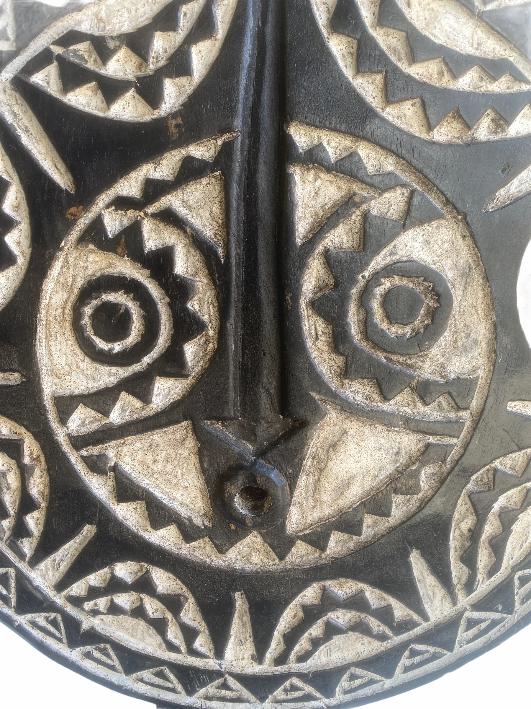 Sun Masks appear during agricultural and harvest festivals among the Bobo people. They honour the Sun and its power to yield a healthy crop. The chequer-board light and dark geometric atterns are understood and interpreted in increasingly complex ways depending on the observer. The use of light and dark pigments represents dichotomy of innocence and knowledge. The highly abstracted and geometric forms of the Bwa and Bobo played an important inspirational role in the development of Western art movements of the early 20th century.