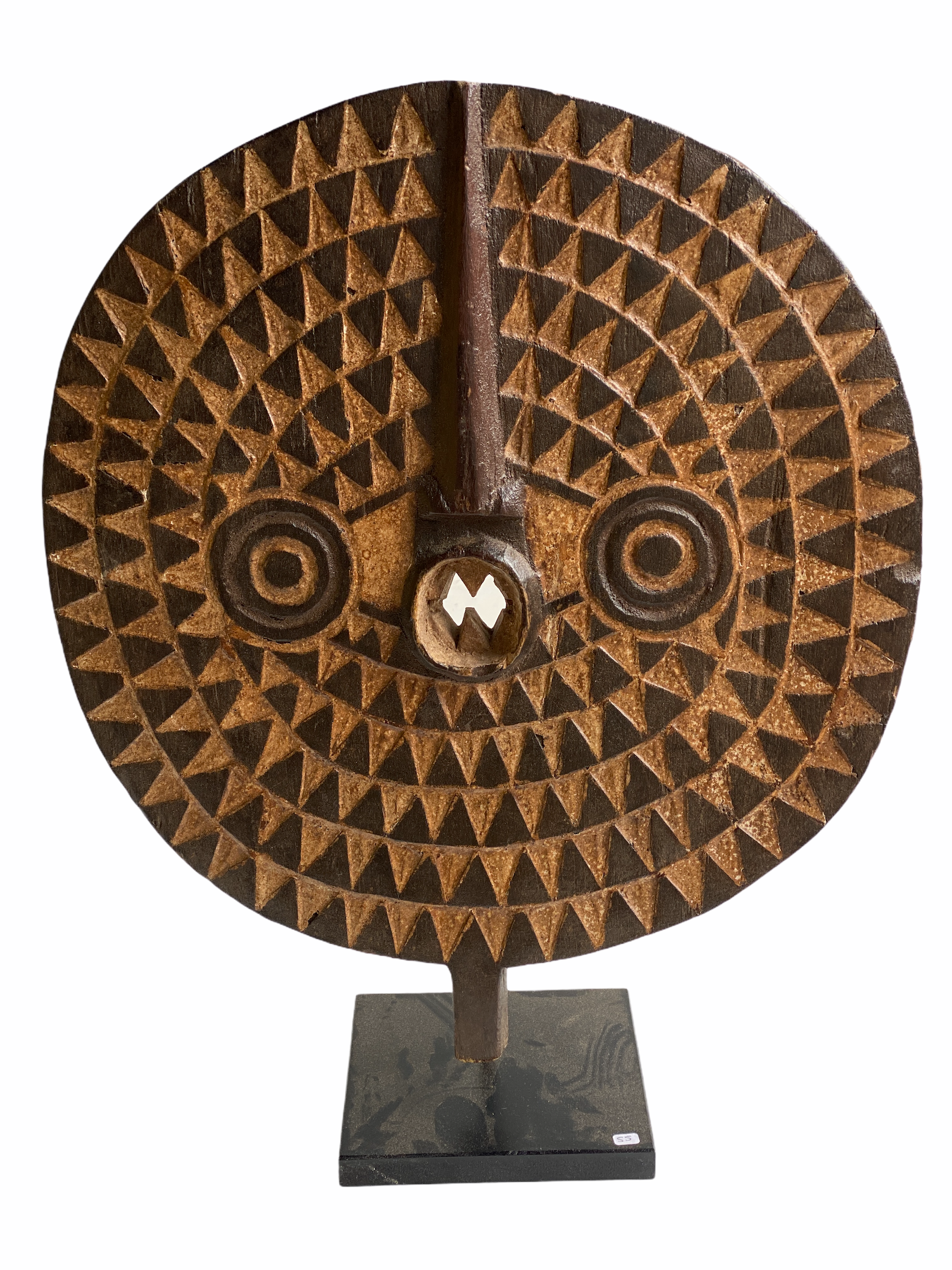 Sun Masks appear during agricultural and harvest festivals among the Bobo people. They honour the Sun and its power to yield a healthy crop. The chequer-board light and dark geometric atterns are understood and interpreted in increasingly complex ways depending on the observer. The use of light and dark pigments represents dichotomy of innocence and knowledge. The highly abstracted and geometric forms of the Bwa and Bobo played an important inspirational role in the development of Western art movements of the early 20th century.