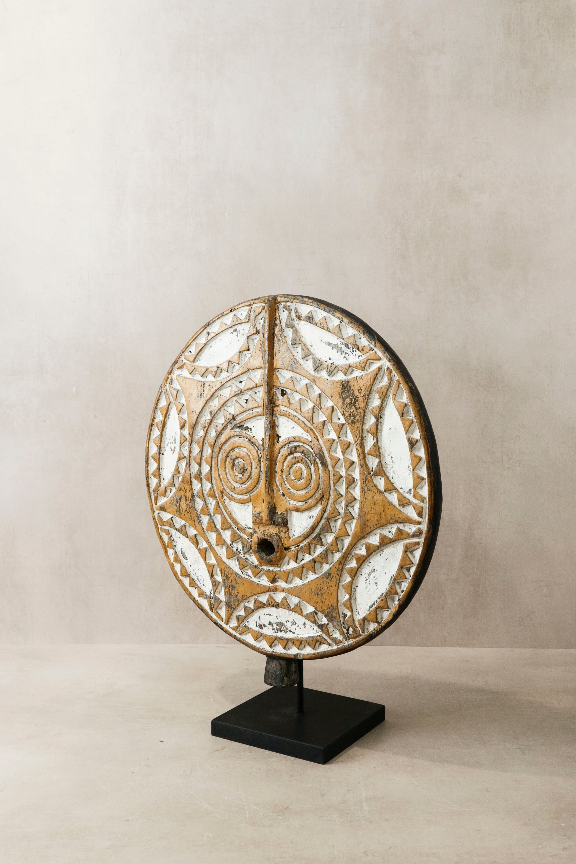 Sun Masks appear during agricultural and harvest festivals among the Bobo people. They honour the Sun and its power to yield a healthy crop. The chequer-board light and dark geometric atterns are understood and interpreted in increasingly complex ways depending on the observer. The use of light and dark pigments represents dichotomy of innocence and knowledge. The highly abstracted and geometric forms of the Bwa and Bobo played an important inspirational role in the development of Western art movements of the early 20th century.