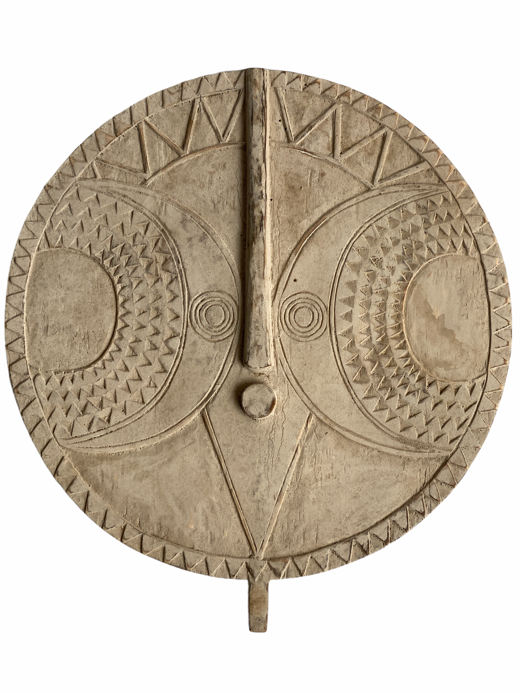 Sun Masks appear during agricultural and harvest festivals among the Bobo people. They honour the Sun and its power to yield a healthy crop. The chequer-board light and dark geometric atterns are understood and interpreted in increasingly complex ways depending on the observer. The use of light and dark pigments represents dichotomy of innocence and knowledge. The highly abstracted and geometric forms of the Bwa and Bobo played an important inspirational role in the development of Western art movements of the early 20th century.