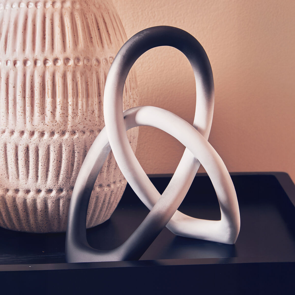 Create a bold focal point with the Broc Ombre Black and White Knot Sculpture, designed for Orsina spaces that love contrast and clean lines. The Ombre Black and White Knot Sculpture features interlocking loops with a smooth gradient that shifts from deep black to luminous white.