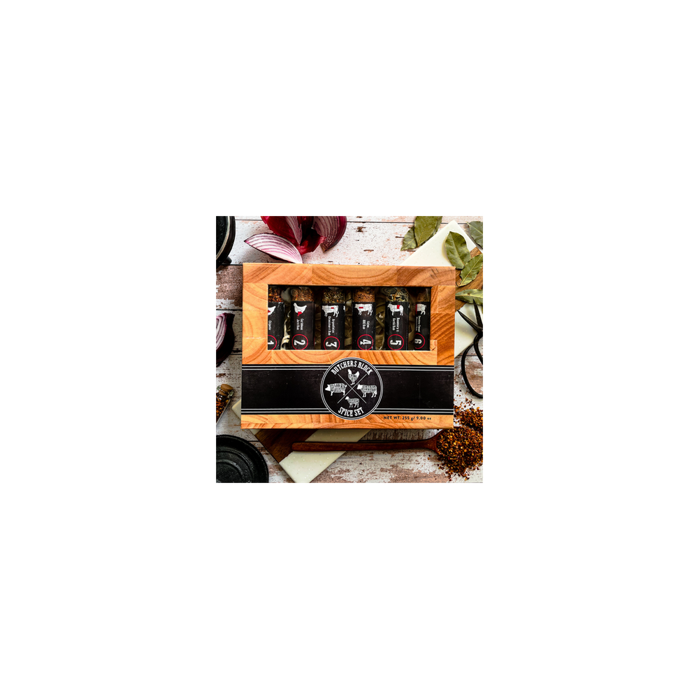 - Designed as a Butchers Block in a Premium gift carton with 6 XL test tubes brimming with meat spices.
