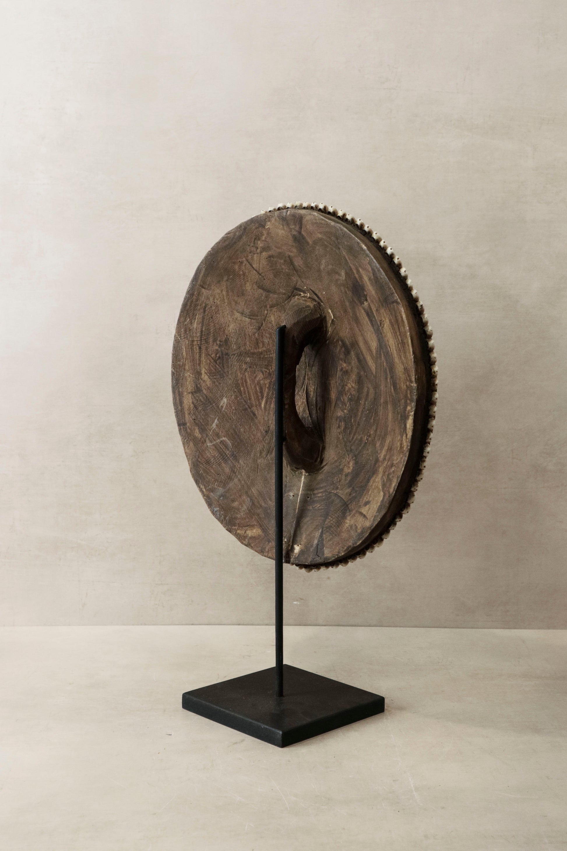 Historically used as a defensive weapon in wartime and displayed as a decorative symbol of status and wealth by the Tikar people in Cameroon. Meticulously crafted, carved from one solid piece of Baobab wood, a sacred wood used for medicinal and ritual purposes for centuries, this large shield boasts hundreds of hand-placed beads on manila string in a circular pattern around a dimensional cluster of natural cowrie shells in the center. These decorative shields are one-of-a-kind, collaboratively crafted by a large group of people to make each piece truly unique and communal.