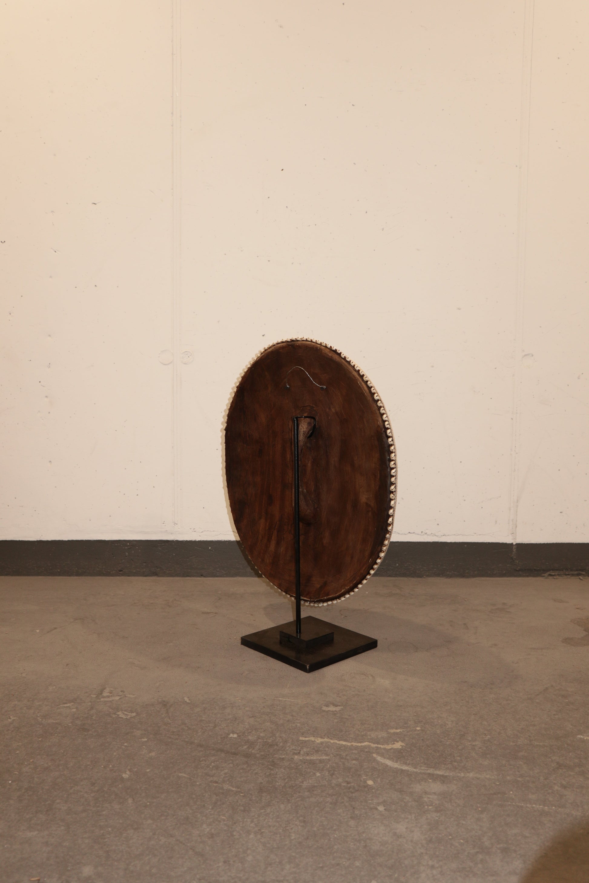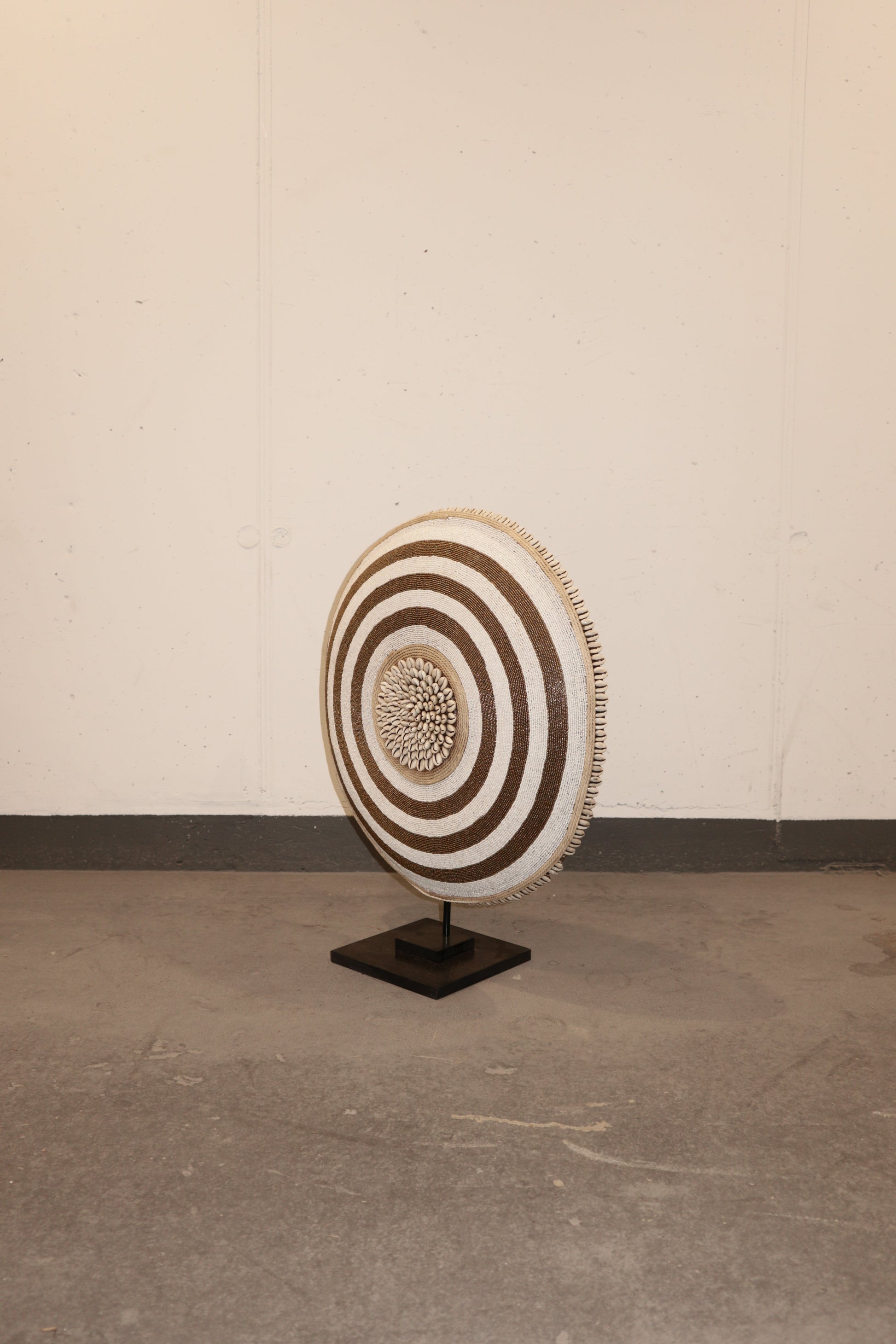 Historically used as a defensive weapon in wartime and displayed as a decorative symbol of status and wealth by the Tikar people in Cameroon. Meticulously crafted, carved from one solid piece of Baobab wood, a sacred wood used for medicinal and ritual purposes for centuries, this large shield boasts hundreds of hand-placed beads on manila string in a circular pattern around a dimensional cluster of natural cowrie shells in the centre. These decorative shields are one-of-a-kind, collaboratively crafted by a large group of people to make each piece unique.