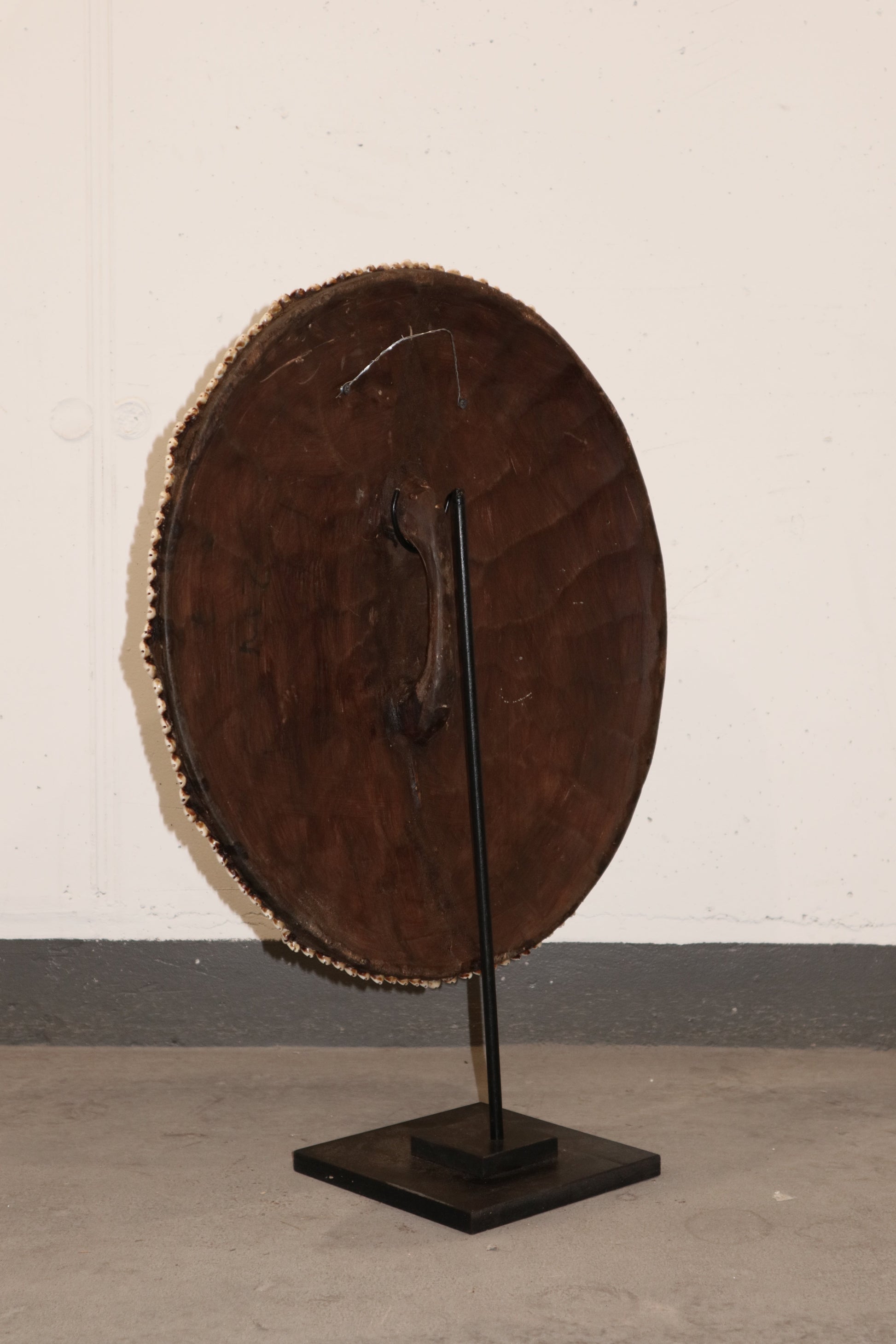 Historically used as a defensive weapon in wartime and displayed as a decorative symbol of status and wealth by the Tikar people in Cameroon. Meticulously crafted, carved from one solid piece of Baobab wood, a sacred wood used for medicinal and ritual purposes for centuries, this large shield boasts hundreds of hand-placed beads on manila string in a circular pattern around a dimensional cluster of natural cowrie shells in the centre. These decorative shields are one-of-a-kind, collaboratively crafted by a large group of people to make each piece unique.