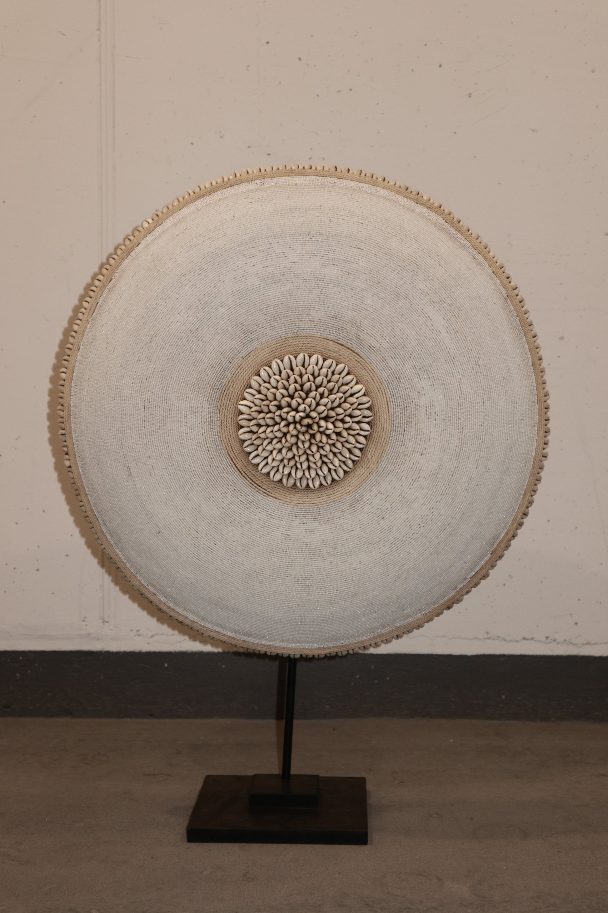Historically used as a defensive weapon in wartime and displayed as a decorative symbol of status and wealth by the Tikar people in Cameroon. Meticulously crafted, carved from one solid piece of Baobab wood, a sacred wood used for medicinal and ritual purposes for centuries, this large shield boasts hundreds of hand-placed beads on manila string in a circular pattern around a dimensional cluster of natural cowrie shells in the centre. These decorative shields are one-of-a-kind, collaboratively crafted by a large group of people to make each piece unique.