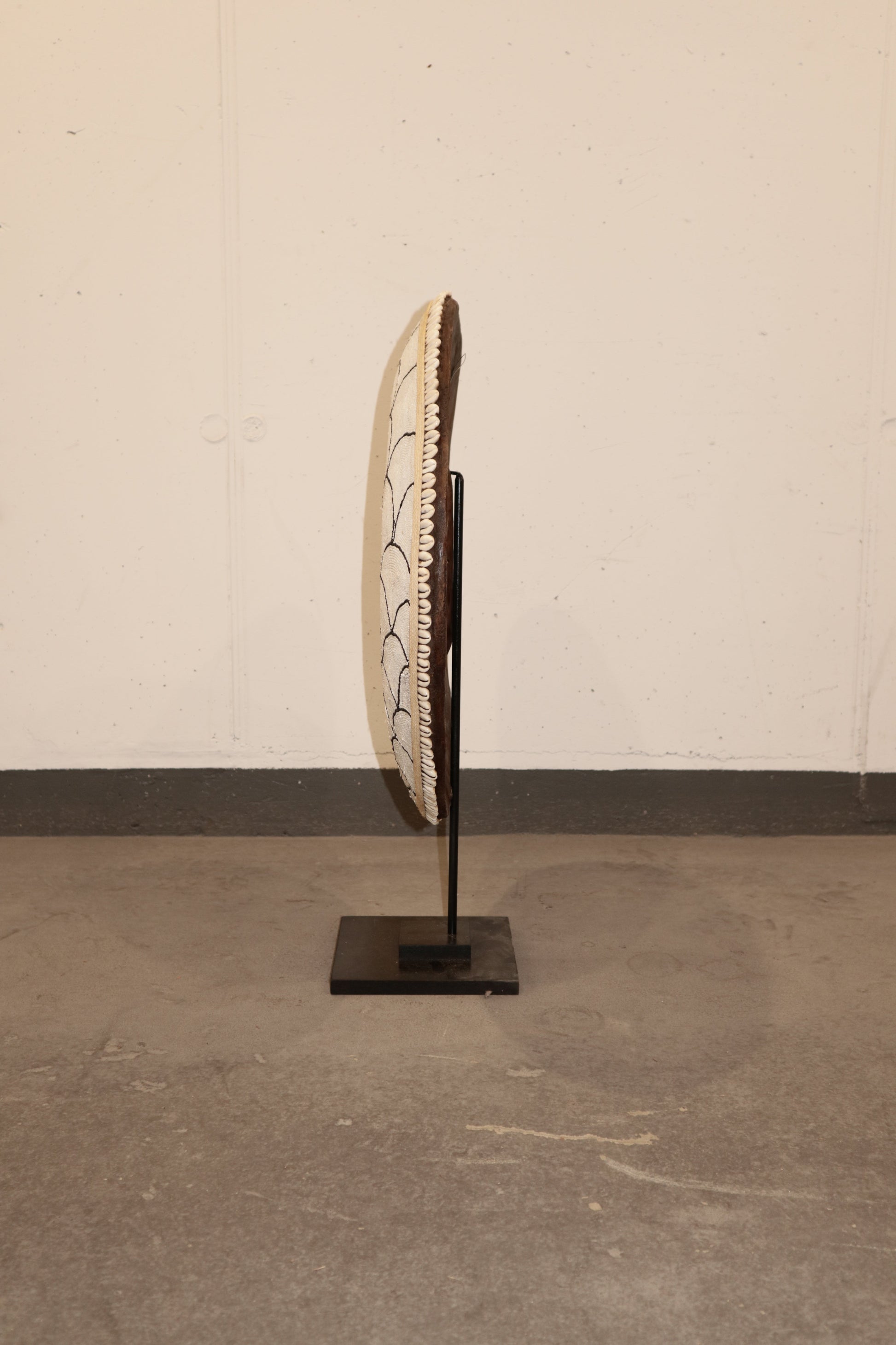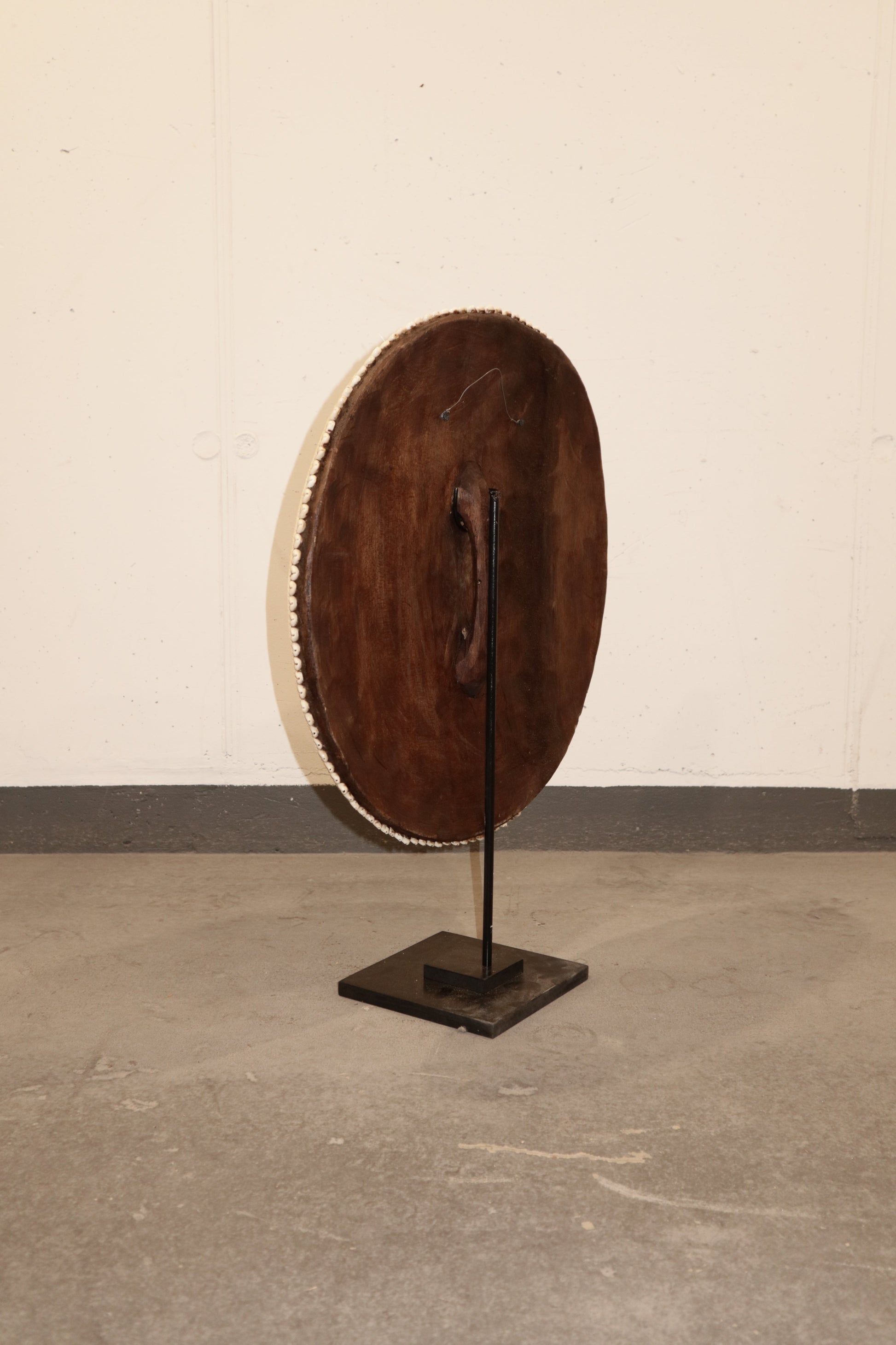 Historically used as a defensive weapon in wartime and displayed as a decorative symbol of status and wealth by the Tikar people in Cameroon. Meticulously crafted, carved from one solid piece of Baobab wood, a sacred wood used for medicinal and ritual purposes for centuries, this large shield boasts hundreds of hand-placed beads on manila string in a circular pattern around a dimensional cluster of natural cowrie shells in the centre. These decorative shields are one-of-a-kind, collaboratively crafted by a large group of people to make each piece unique.