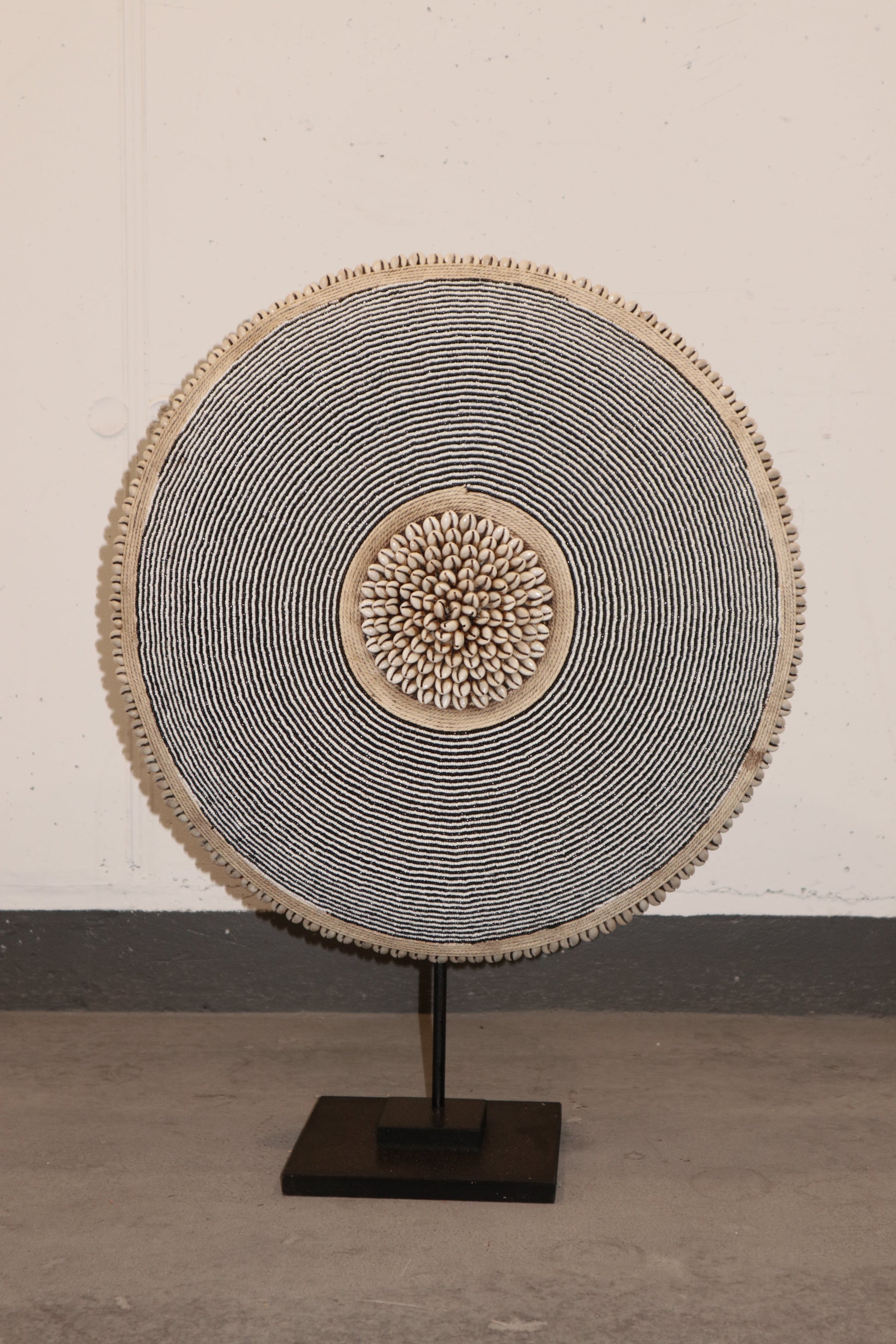 Historically used as a defensive weapon in wartime and displayed as a decorative symbol of status and wealth by the Tikar people in Cameroon. Meticulously crafted, carved from one solid piece of Baobab wood, a sacred wood used for medicinal and ritual purposes for centuries, this large shield boasts hundreds of hand-placed beads on manila string in a circular pattern around a dimensional cluster of natural cowrie shells in the centre. These decorative shields are one-of-a-kind, collaboratively crafted by a large group of people to make each piece unique.