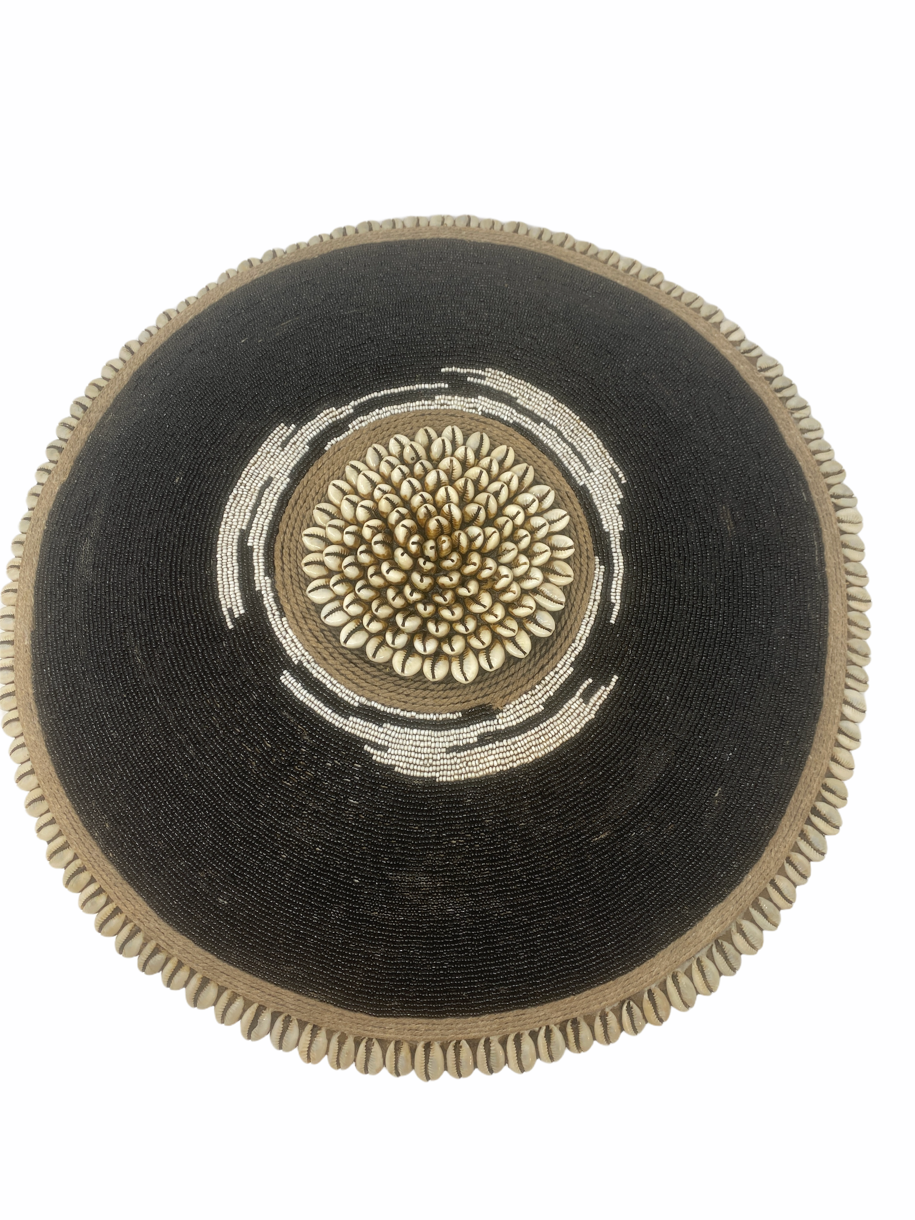 Historically used as a defensive weapon in wartime and displayed as a decorative symbol of status and wealth by the Tikar people in Cameroon. Meticulously crafted, carved from one solid piece of Baobab wood, a sacred wood used for medicinal and ritual purposes for centuries, this large shield boasts hundreds of hand-placed beads on manila string in a circular pattern around a dimensional cluster of natural cowrie shells in the centre. These decorative shields are one-of-a-kind, collaboratively crafted by a large group of people to make each piece truely unique and