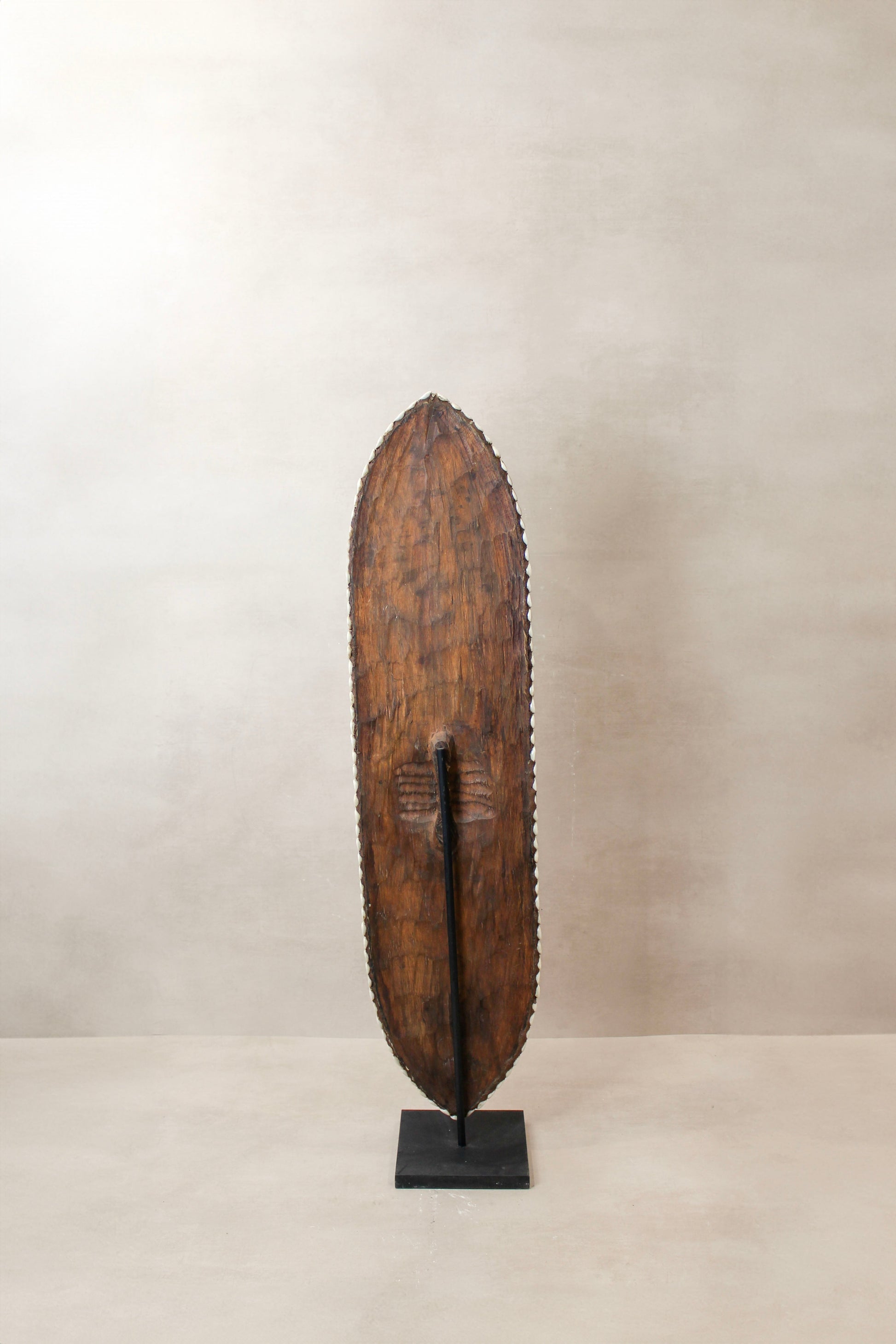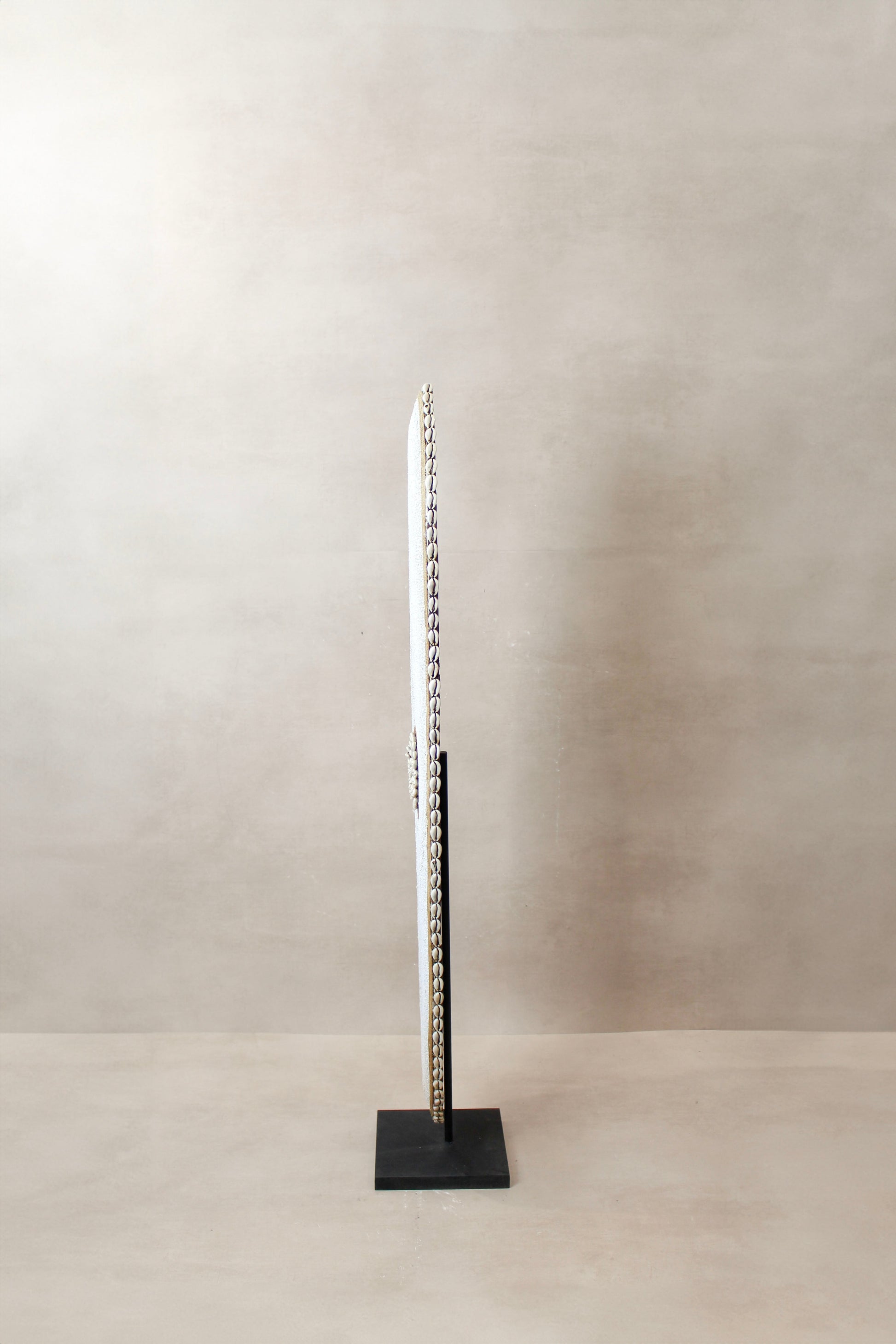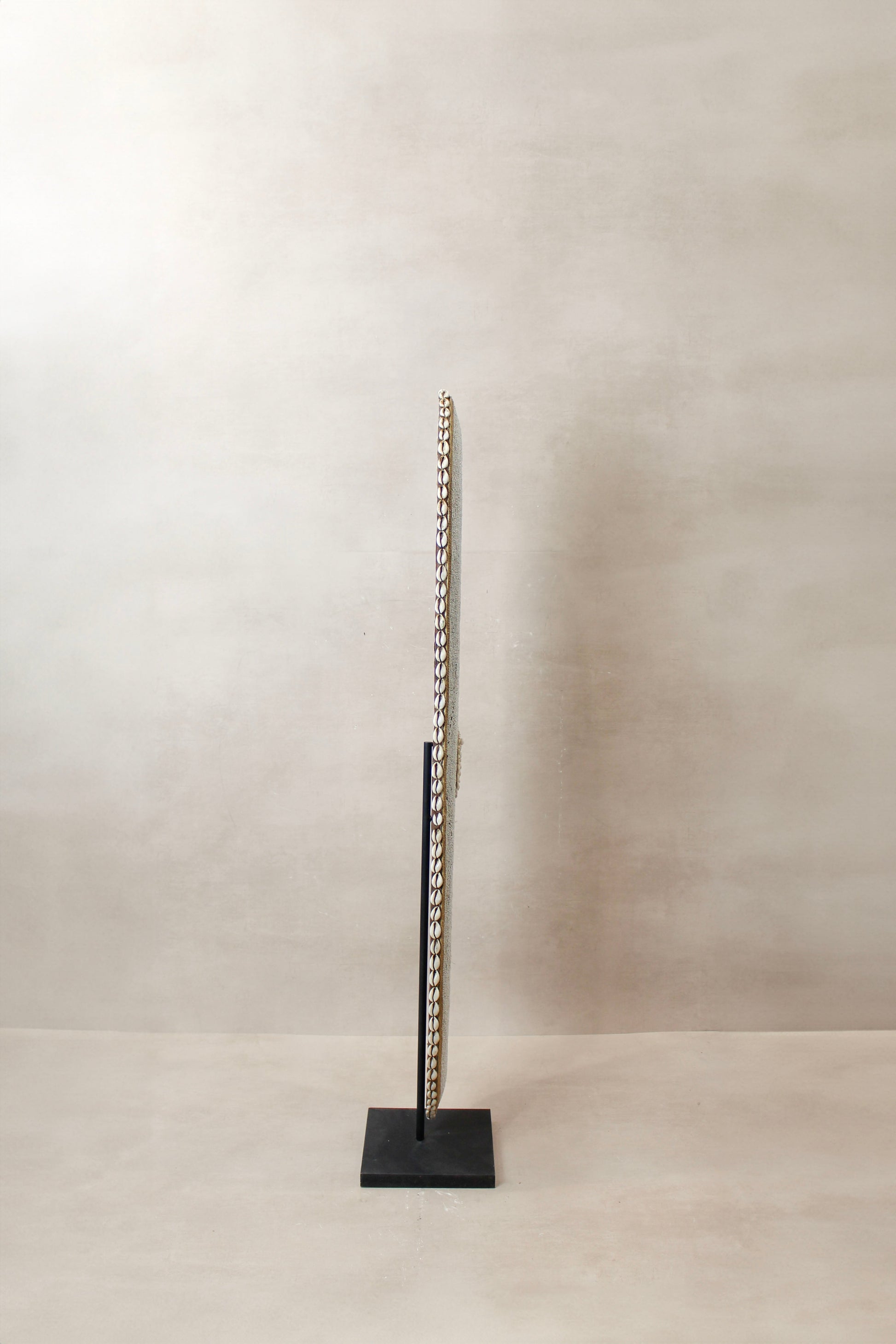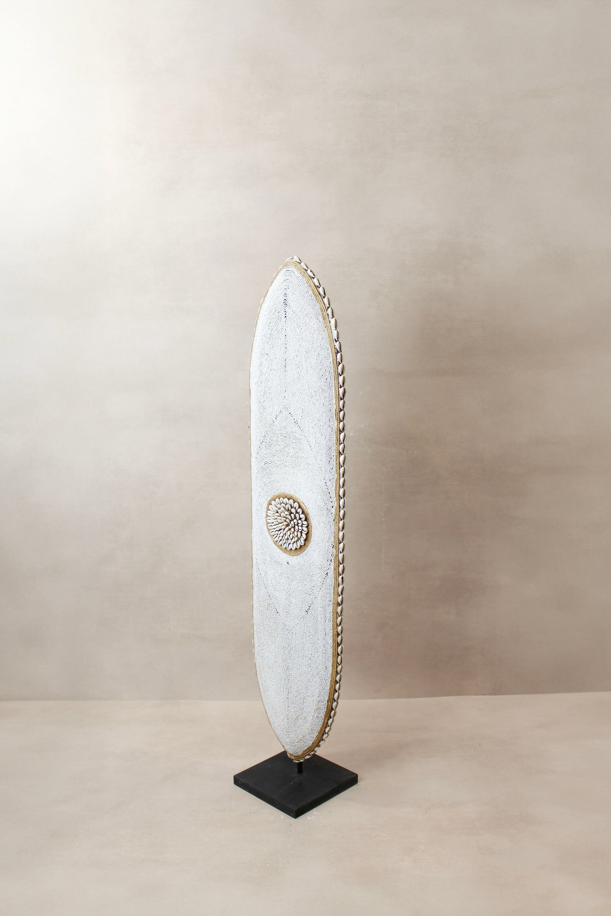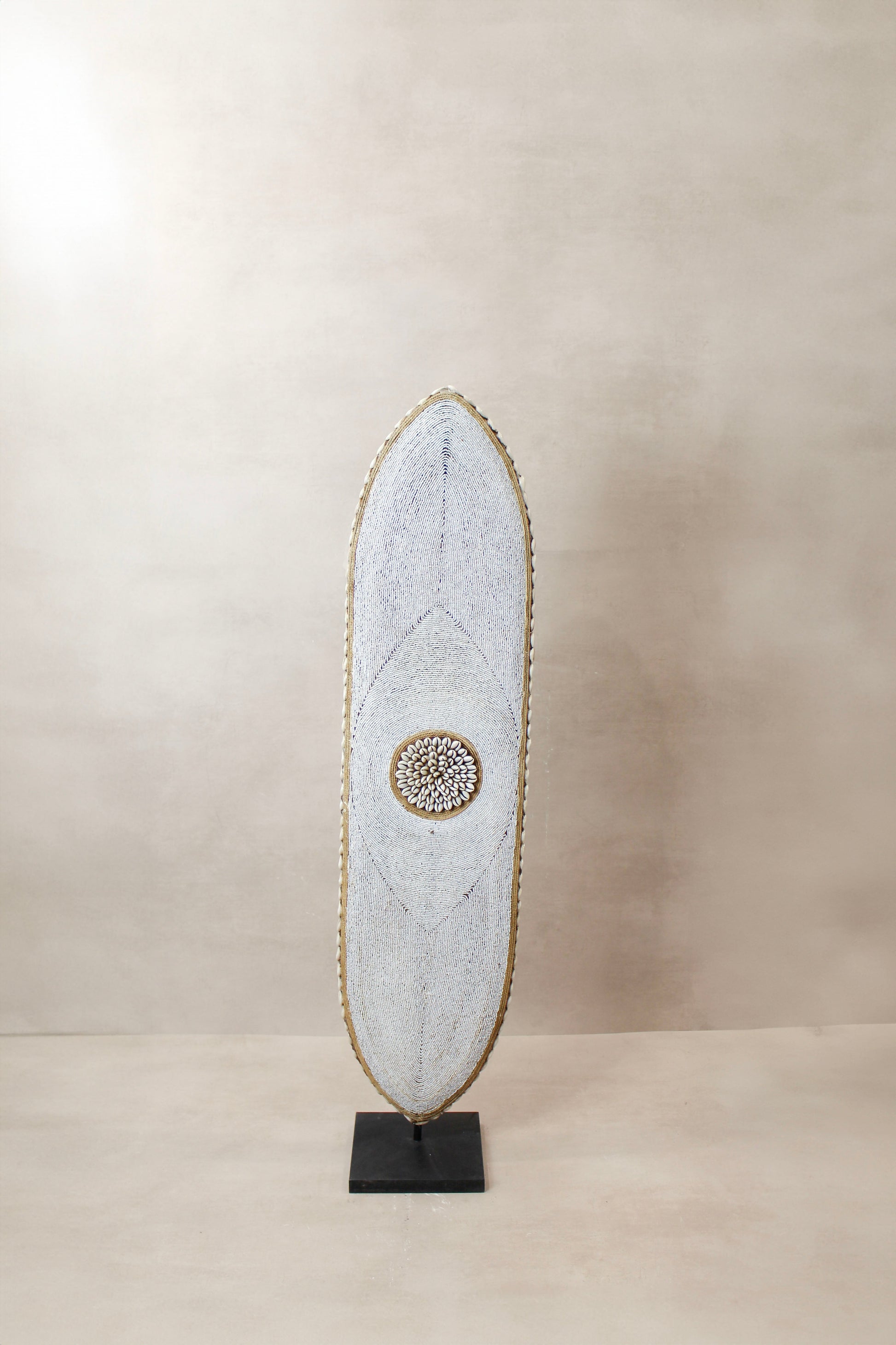Historically used as a defensive weapon in wartime and displayed as a decorative symbol of status and wealth by the Tikar people in Cameroon. Meticulously crafted, carved from one solid piece of Baobab wood, a sacred wood used for medicinal and ritual purposes for centuries, this large shield boasts hundreds of hand-placed beads on manila string in a circular pattern around a dimensional cluster of natural cowrie shells in the centre. These decorative shields are one-of-a-kind, collaboratively crafted by a large group of people to make each piece unique.