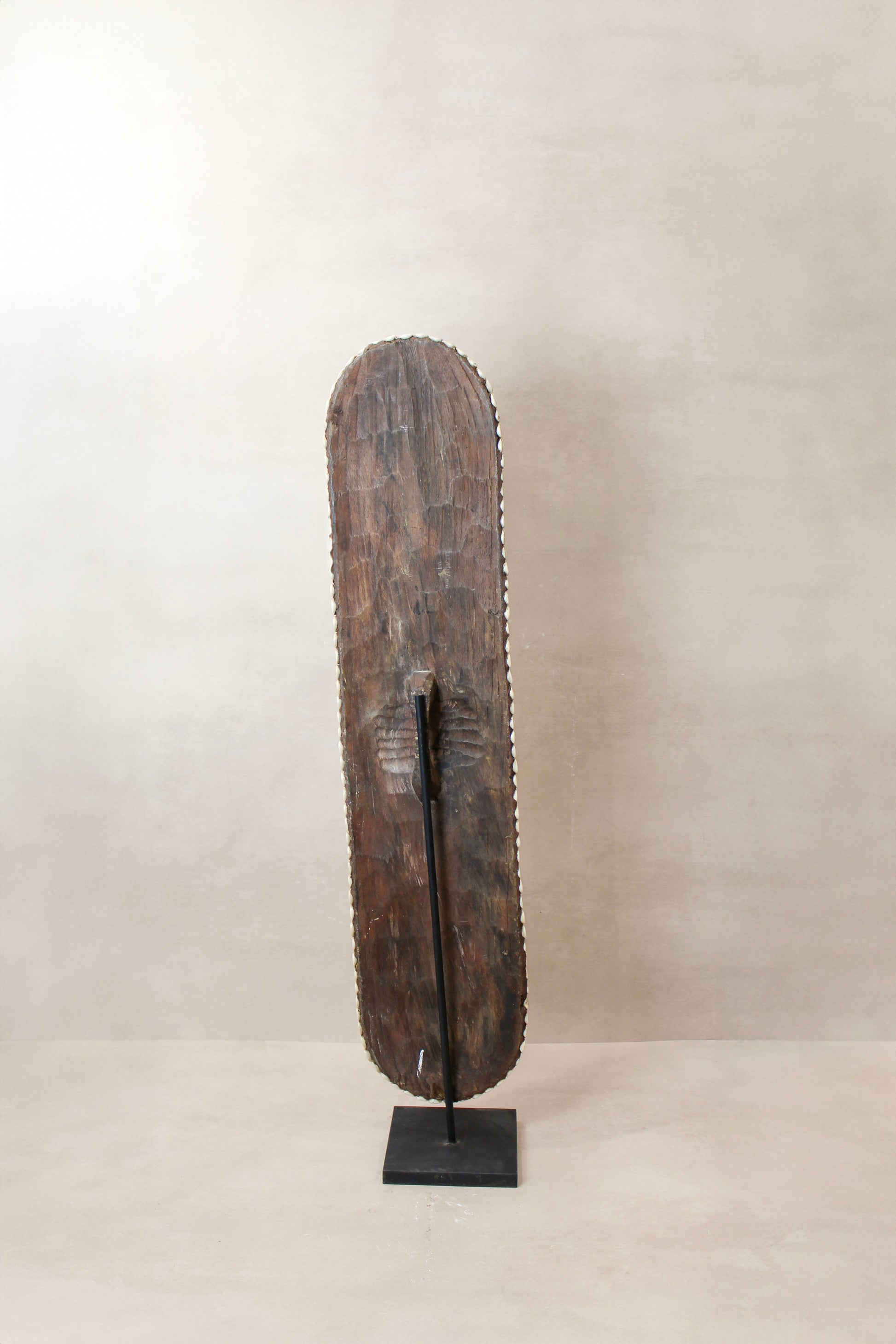 Historically used as a defensive weapon in wartime and displayed as a decorative symbol of status and wealth by the Tikar people in Cameroon. Meticulously crafted, carved from one solid piece of Baobab wood, a sacred wood used for medicinal and ritual purposes for centuries, this large shield boasts hundreds of hand-placed beads on manila string in a circular pattern around a dimensional cluster of natural cowrie shells in the centre. These decorative shields are one-of-a-kind, collaboratively crafted by a large group of people to make each piece unique.