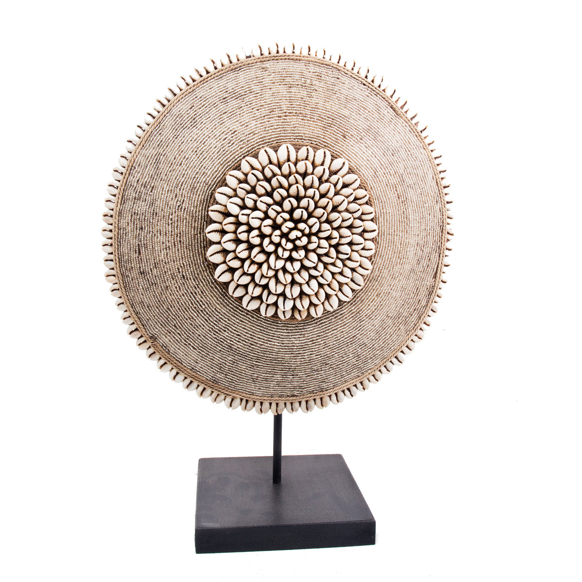Historically used as a defensive weapon in wartime and displayed as a decorative symbol of status and wealth by the Tikar people in Cameroon. Meticulously crafted, carved from one solid piece of Baobab wood, a sacred wood used for medicinal and ritual purposes for centuries, this large shield boasts hundreds of hand-placed beads on manila string in a circular pattern around a dimensional cluster of natural cowrie shells in the centre. These decorative shields are one-of-a-kind, collaboratively crafted by a large group of people to make each piece truely unique and