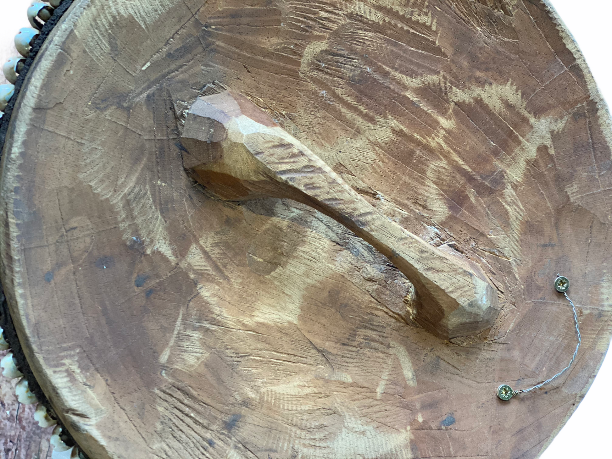 Historically used as a defensive weapon in wartime and displayed as a decorative symbol of status and wealth by the Tikar people in Cameroon. Meticulously crafted, carved from one solid piece of Baobab wood, a sacred wood used for medicinal and ritual purposes for centuries, this large shield boasts hundreds of hand-placed beads on manila string in a circular pattern around a dimensional cluster of natural cowrie shells in the centre. These decorative shields are one-of-a-kind, collaboratively crafted by a large group of people to make each piece truely unique and