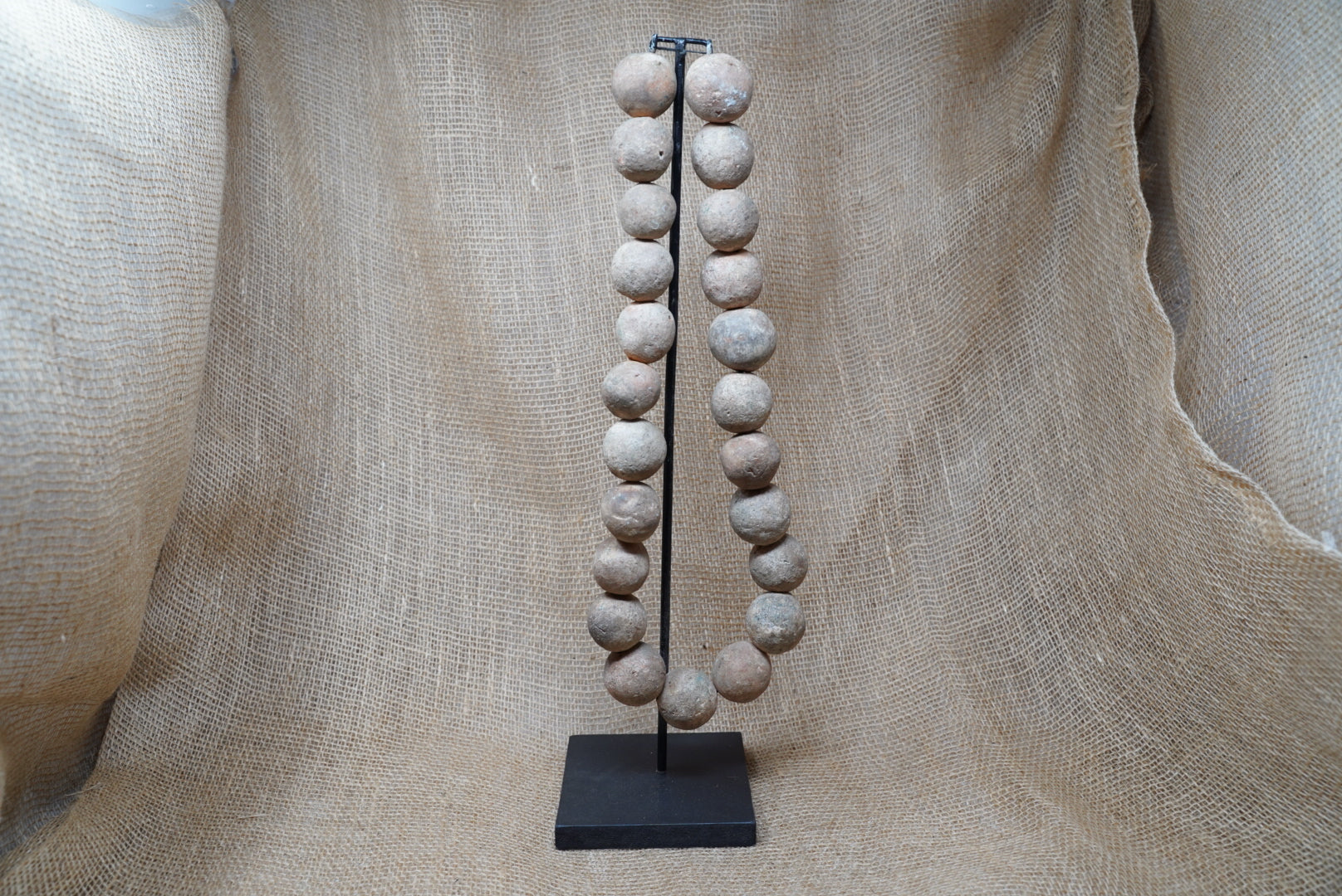 The Cameroonian clay bead necklace, elegantly showcased on a stand, represents the artistic essence of Cameroon's culture. Handcrafted from local clay, these beads are in earthy colours. This necklace is a beautiful fusion of art and tradition, offering a glimpse into the rich cultural heritage of Cameroon.