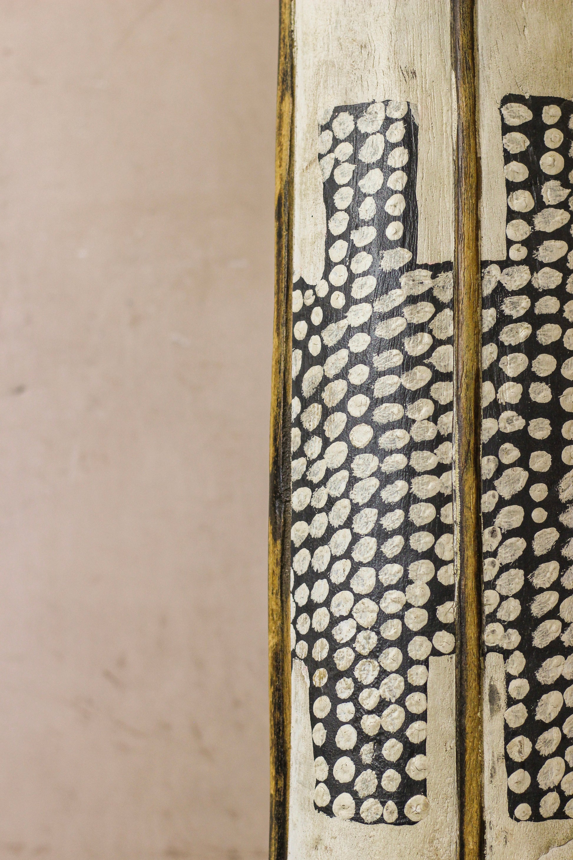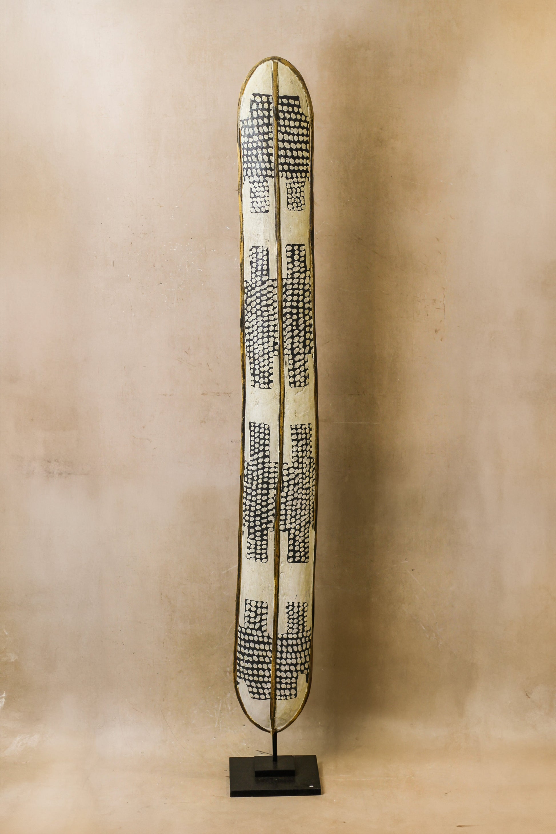 A striking tall shield from Cameroon, expertly crafted and vividly painted with bold, geometric patterns. This shield, carved from wood and natural pigments, embodies the artistic traditions of Cameroon, where such shields are not only practical defensive tools but also significant cultural symbols. The intricate designs and colors are carefully applied to convey tribal identity, status, and spiritual beliefs. Standing tall, this shield is both a protective item and a work of art, exemplifying the skilled craftsmanship and cultural pride of its makers.
