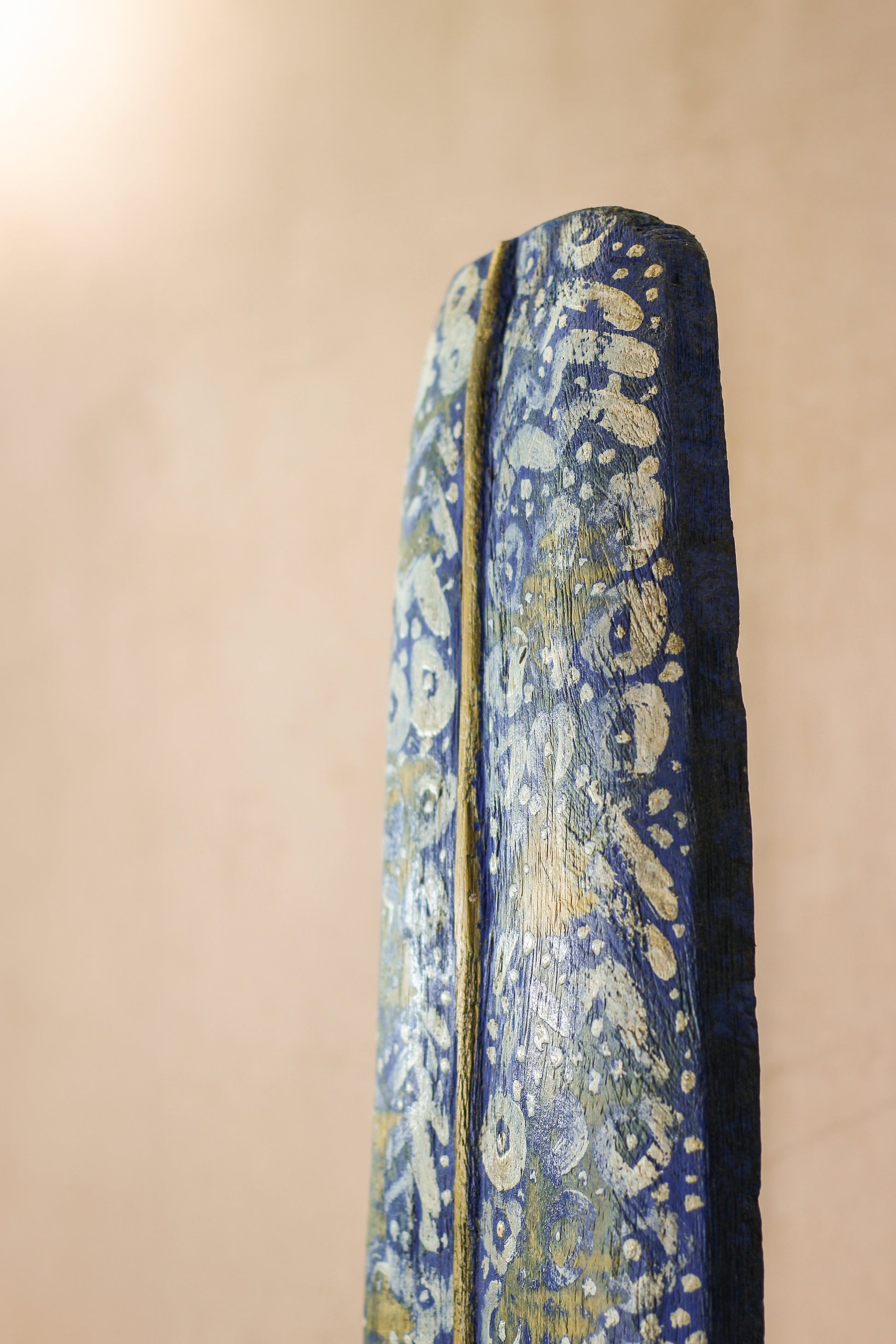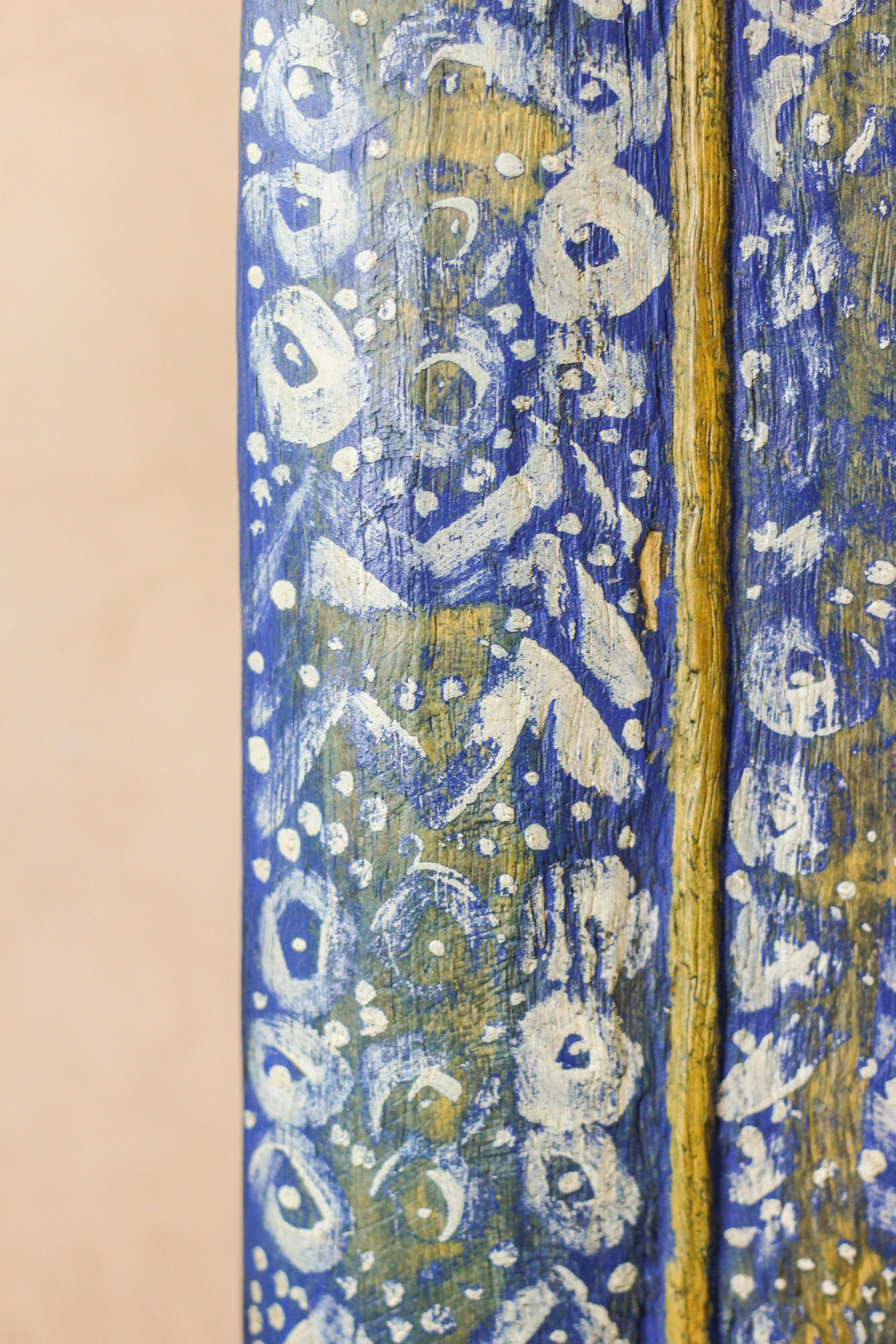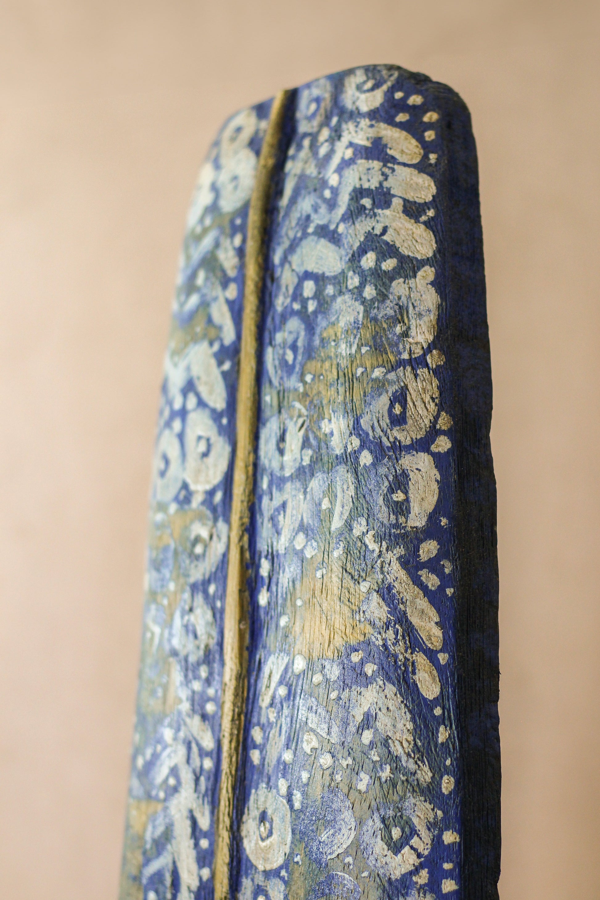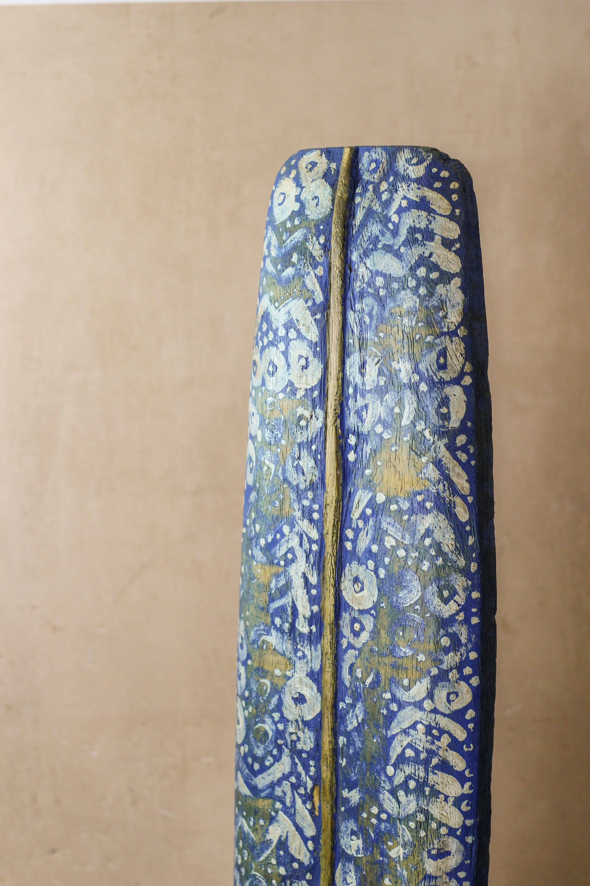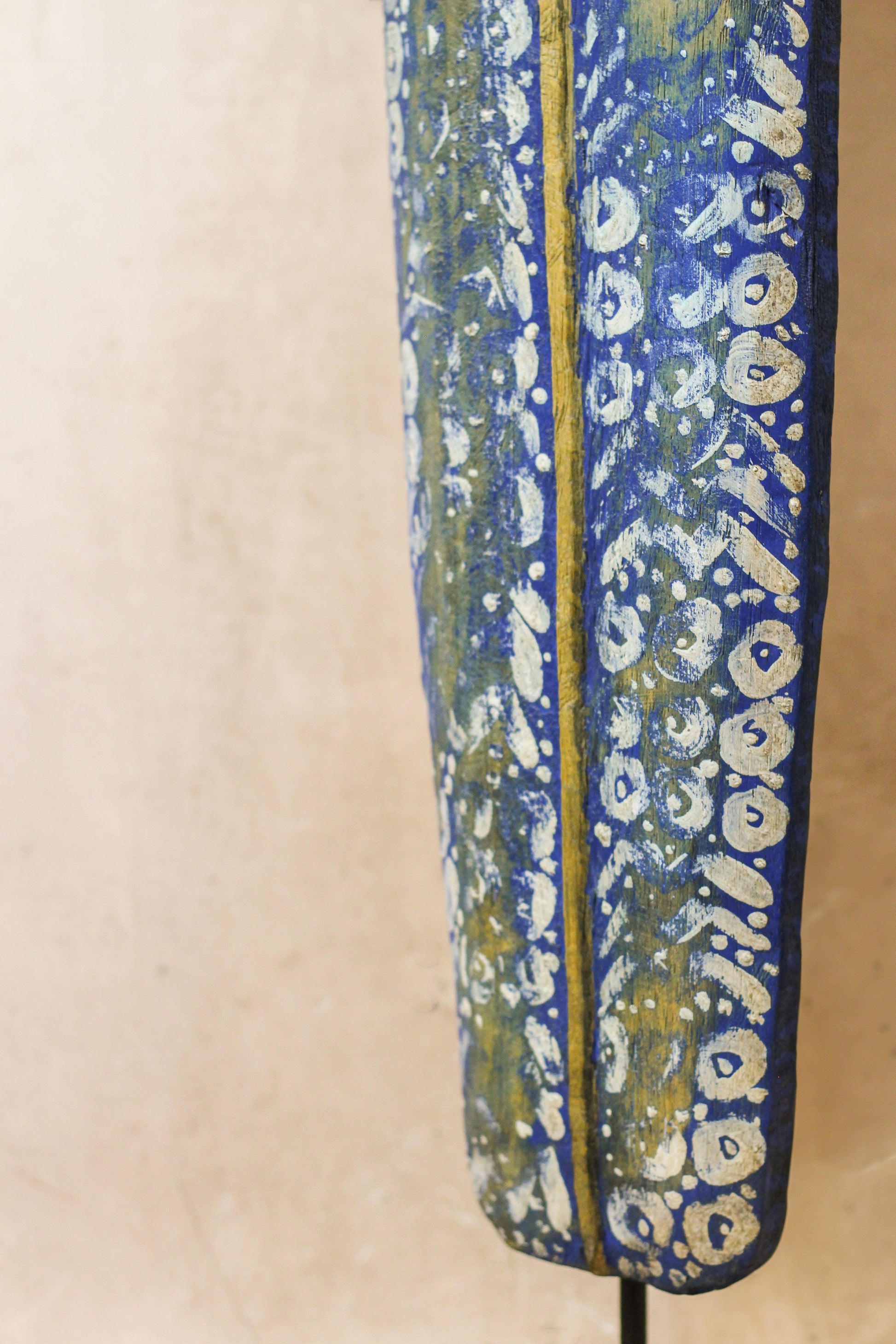 A striking tall shield from Cameroon, expertly crafted and vividly painted with bold, geometric patterns. This shield, carved from wood and natural pigments, embodies the artistic traditions of Cameroon, where such shields are not only practical defensive tools but also significant cultural symbols. The intricate designs and colors are carefully applied to convey tribal identity, status, and spiritual beliefs. Standing tall, this shield is both a protective item and a work of art, exemplifying the skilled craftsmanship and cultural pride of its makers.